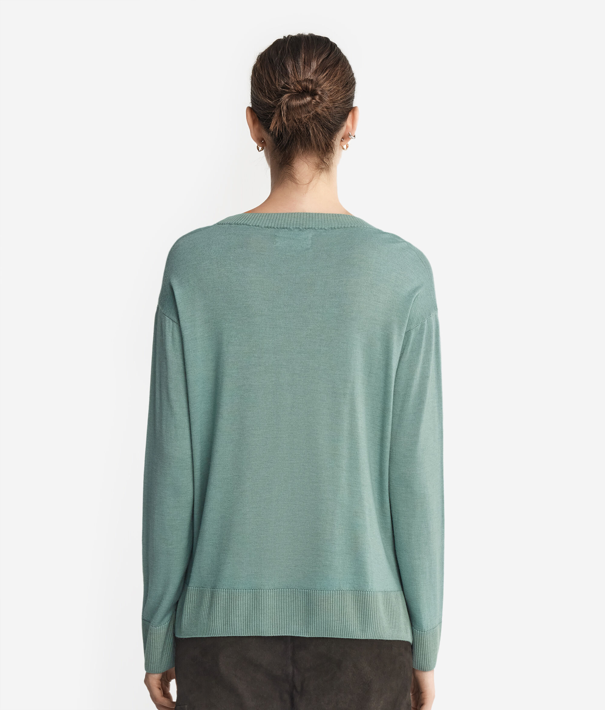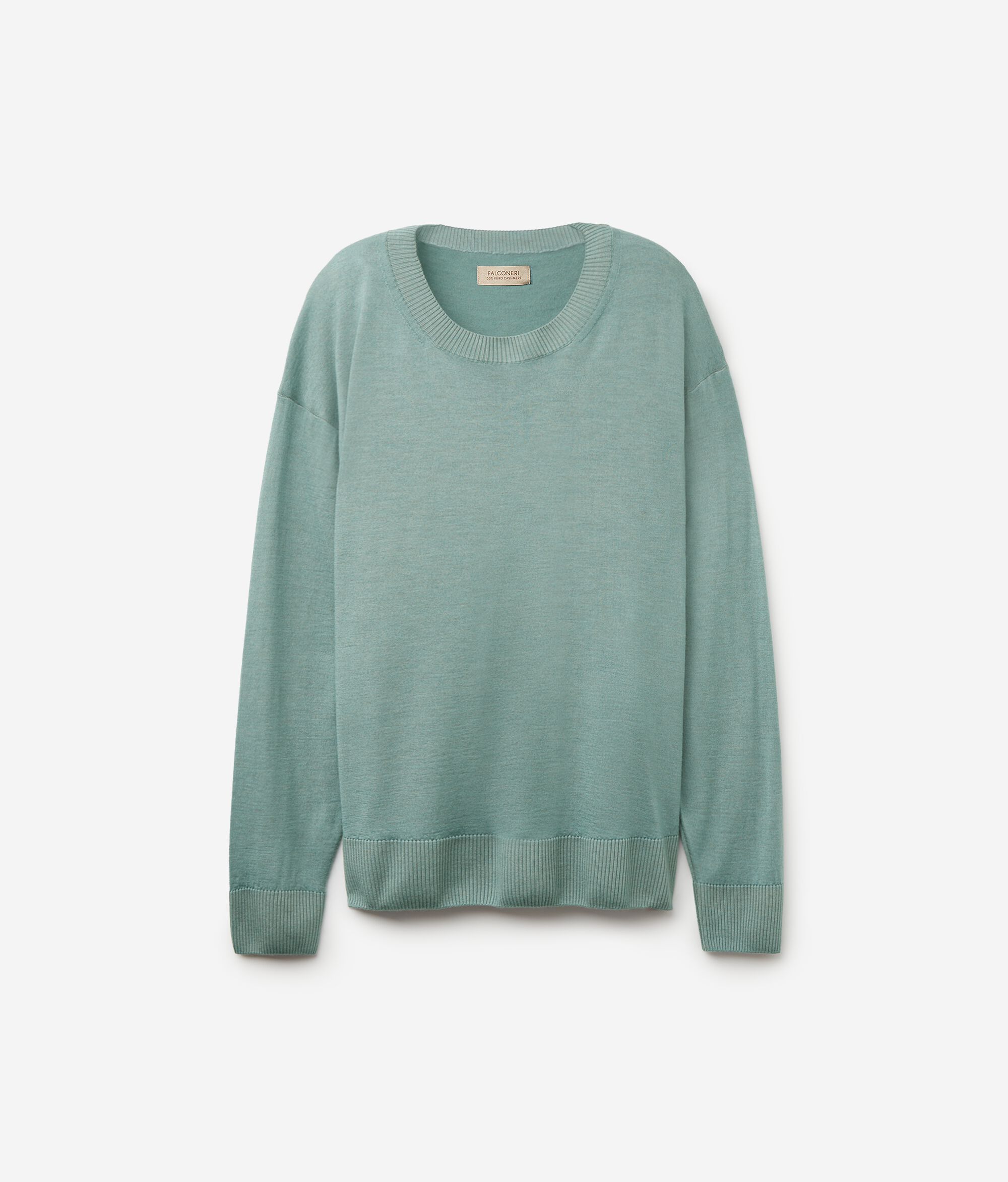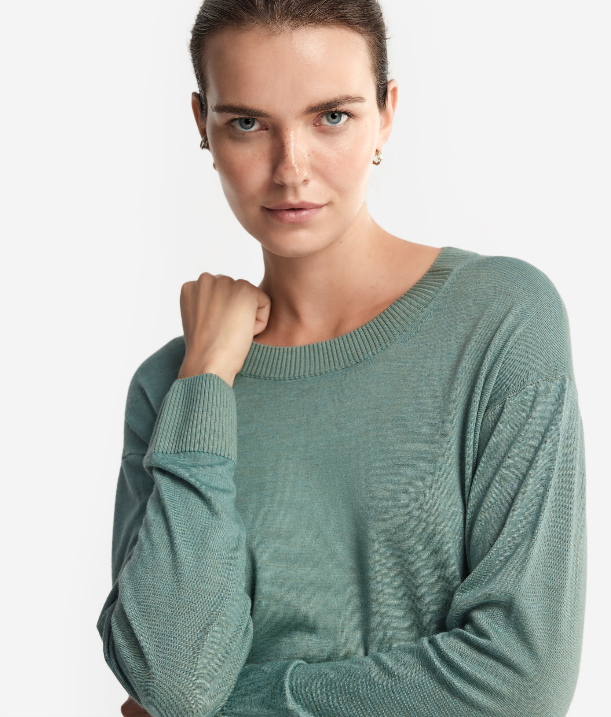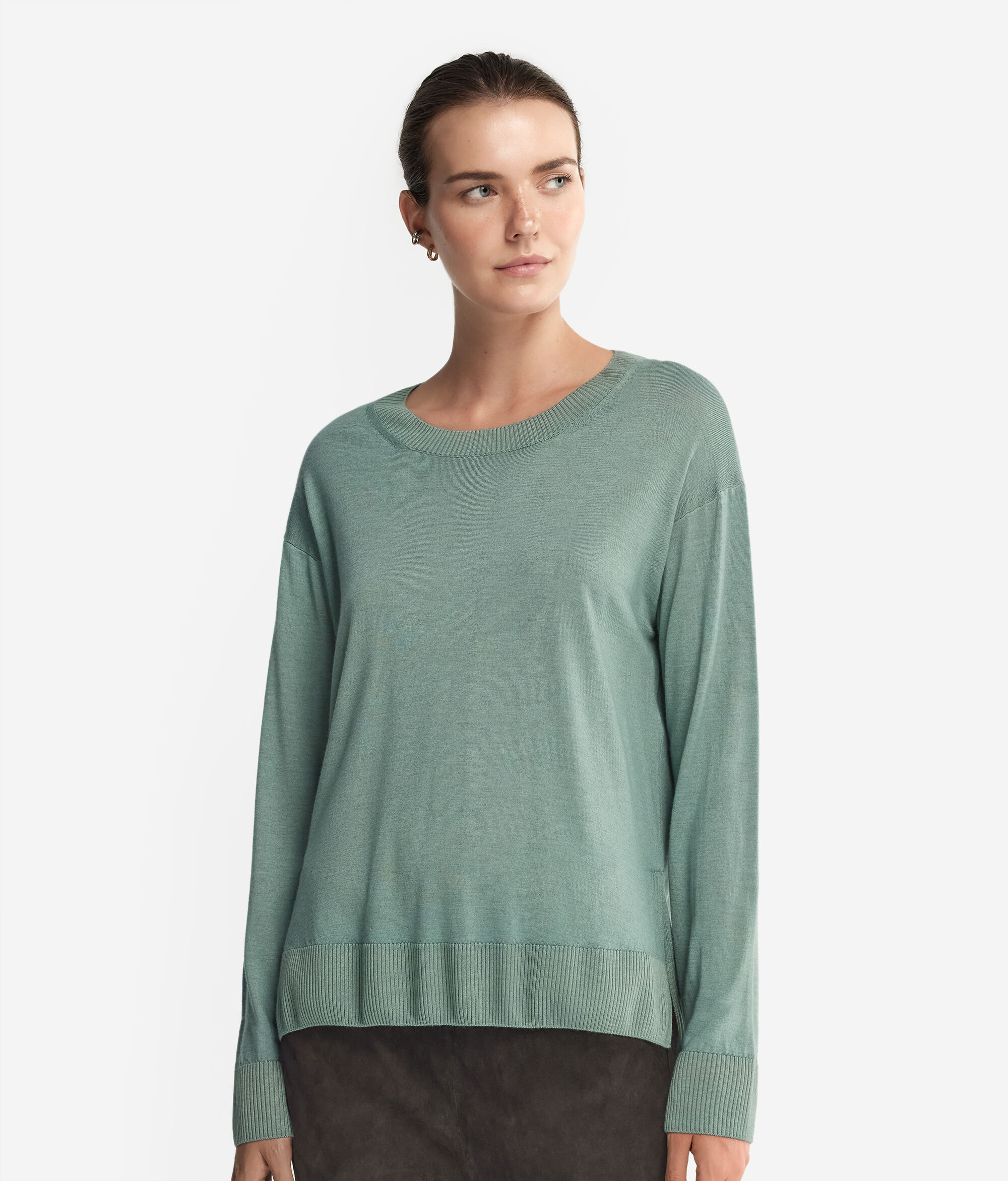 La maglia girocollo realizzata in cashmere ultrafine è un modello a manica lunga che si caratterizza da una lavorazione a costina sullo scollo, sui polsi e sul fondo. La sua peculiarità sono gli spacchi laterali. Le spalle sono leggermente scese e sua vestibilità è morbida.