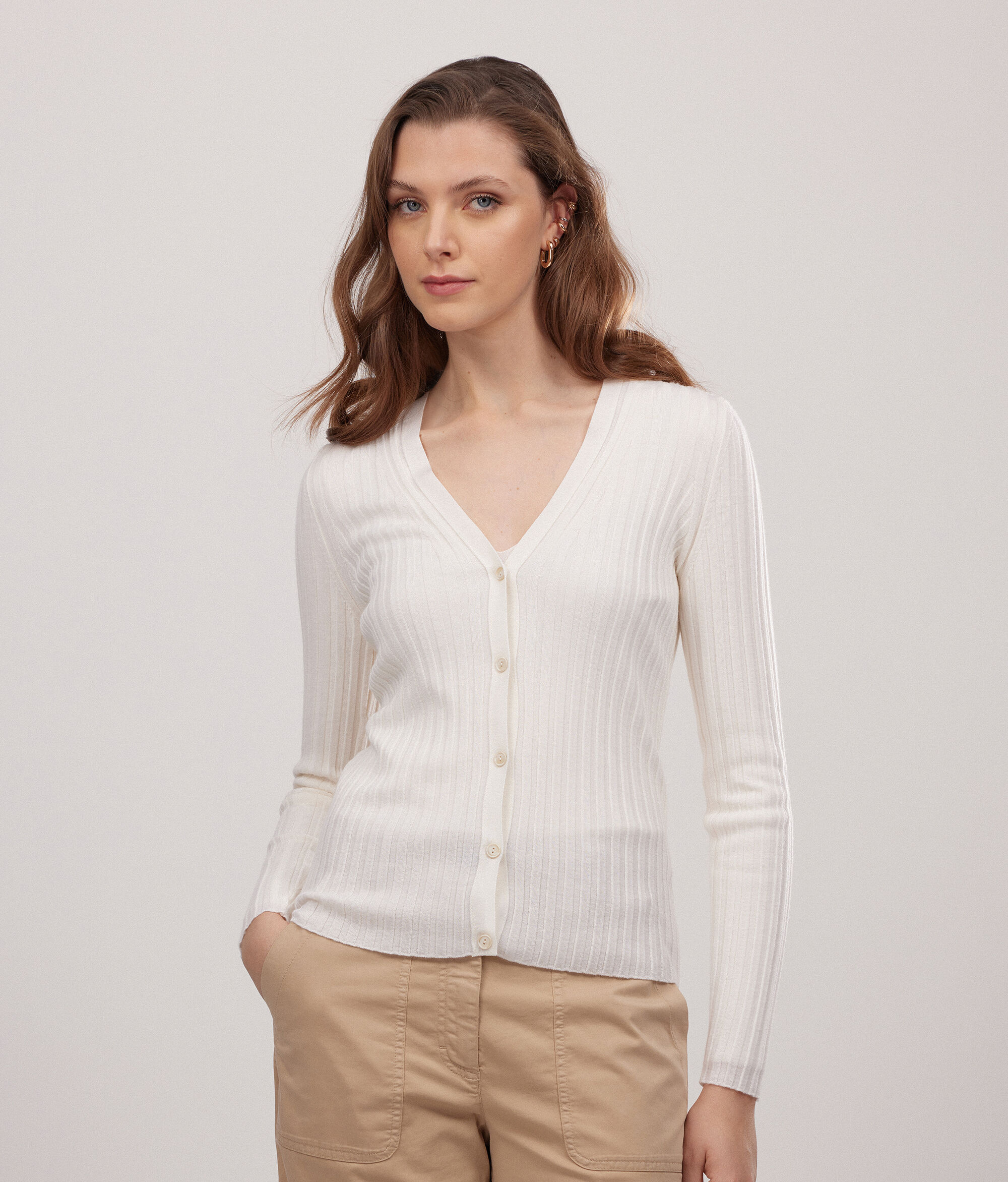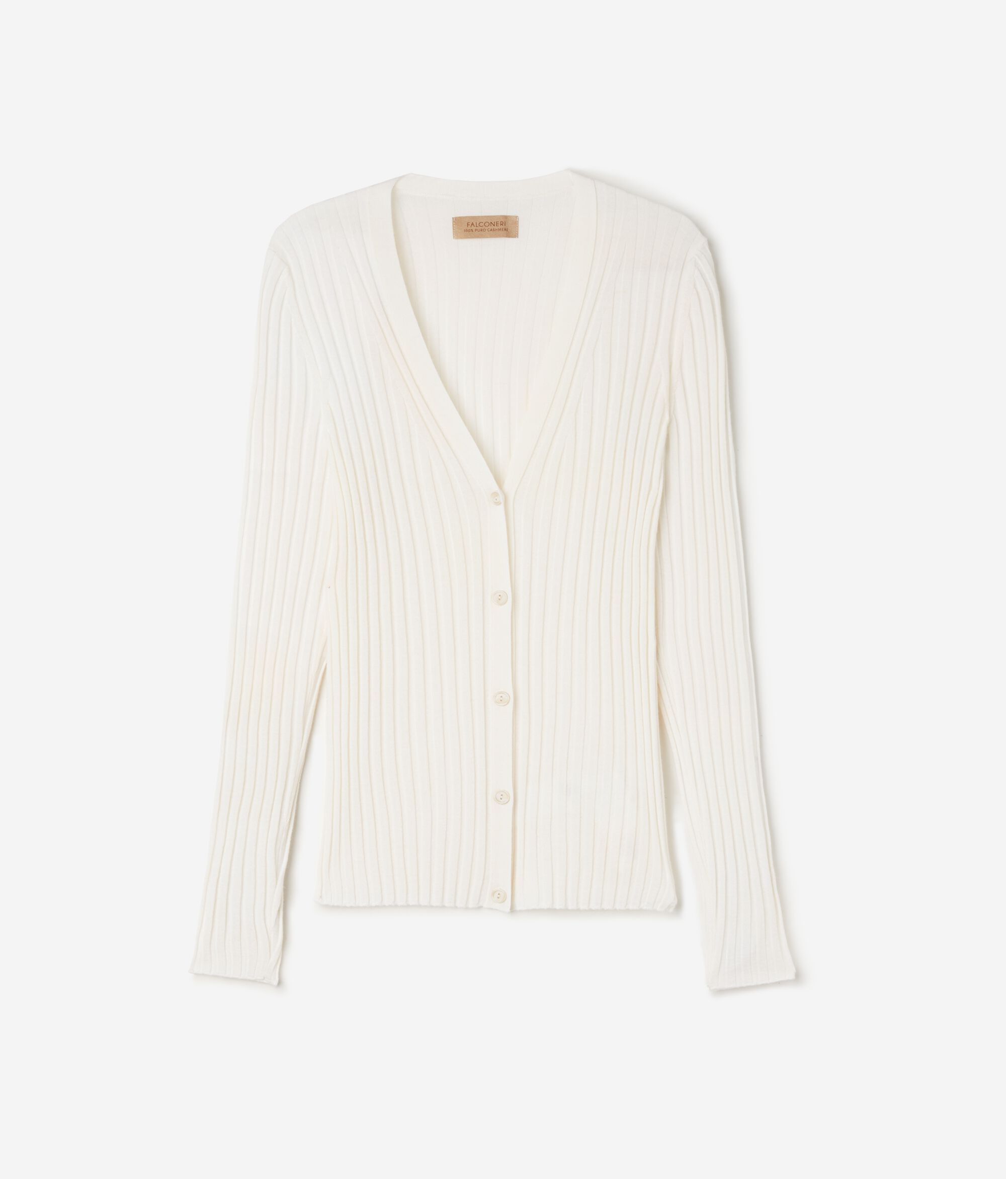 Il golfino a costine in cashmere ultrafine a maniche lunghe, presenta uno scollo a V con una chiusura frontale con cinque bottoncini a vista in tono. La spalle sono regolari e la vestibilità è da considerarsi slim.