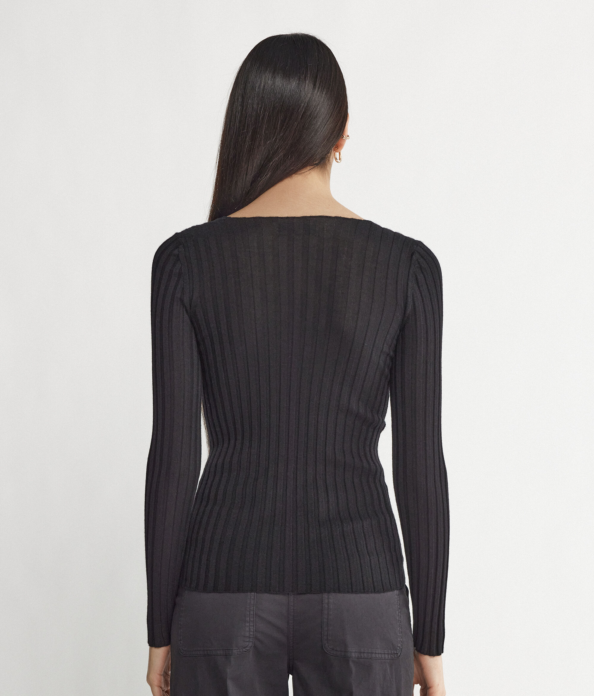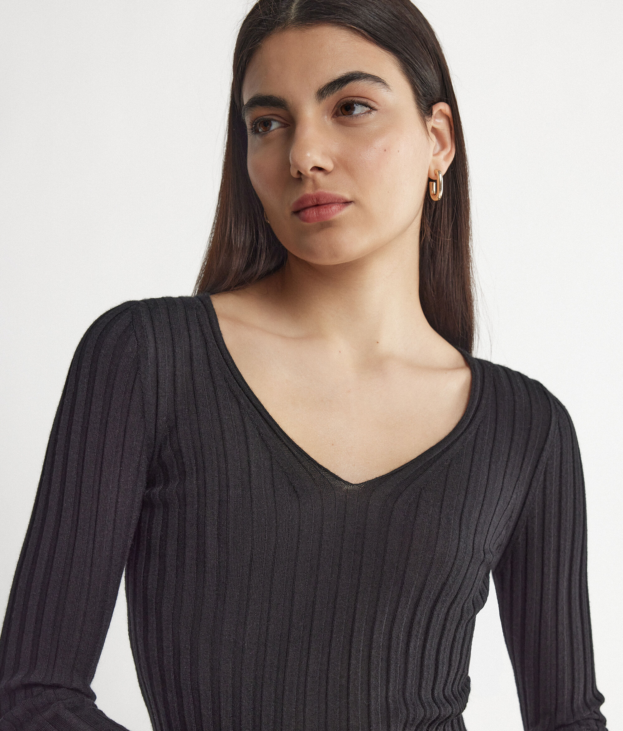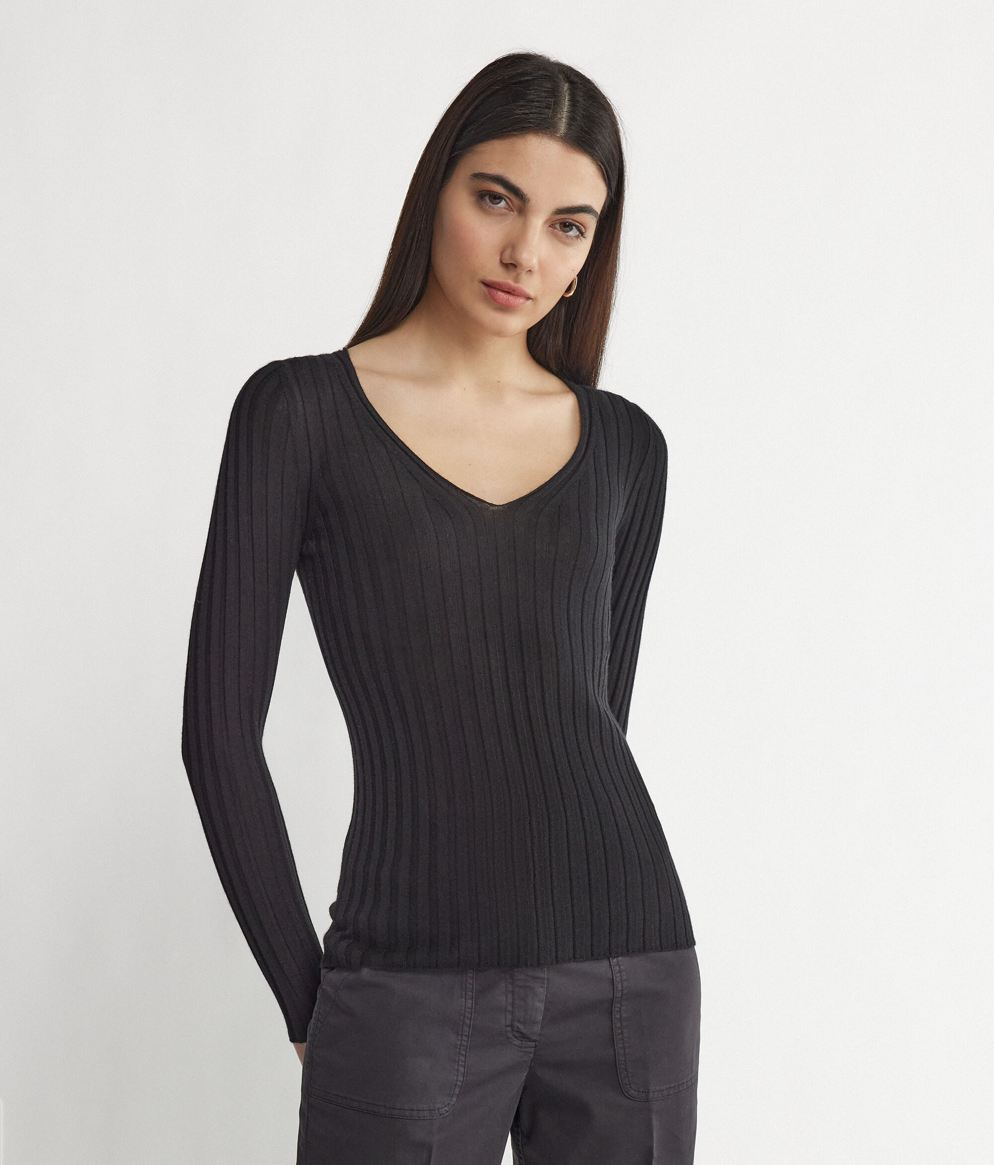 La maglia a costine in cashmere ultrafine si presenta con scollo a V e maniche lunghe. Le spalle sono regolari e la vestibilità è slim.