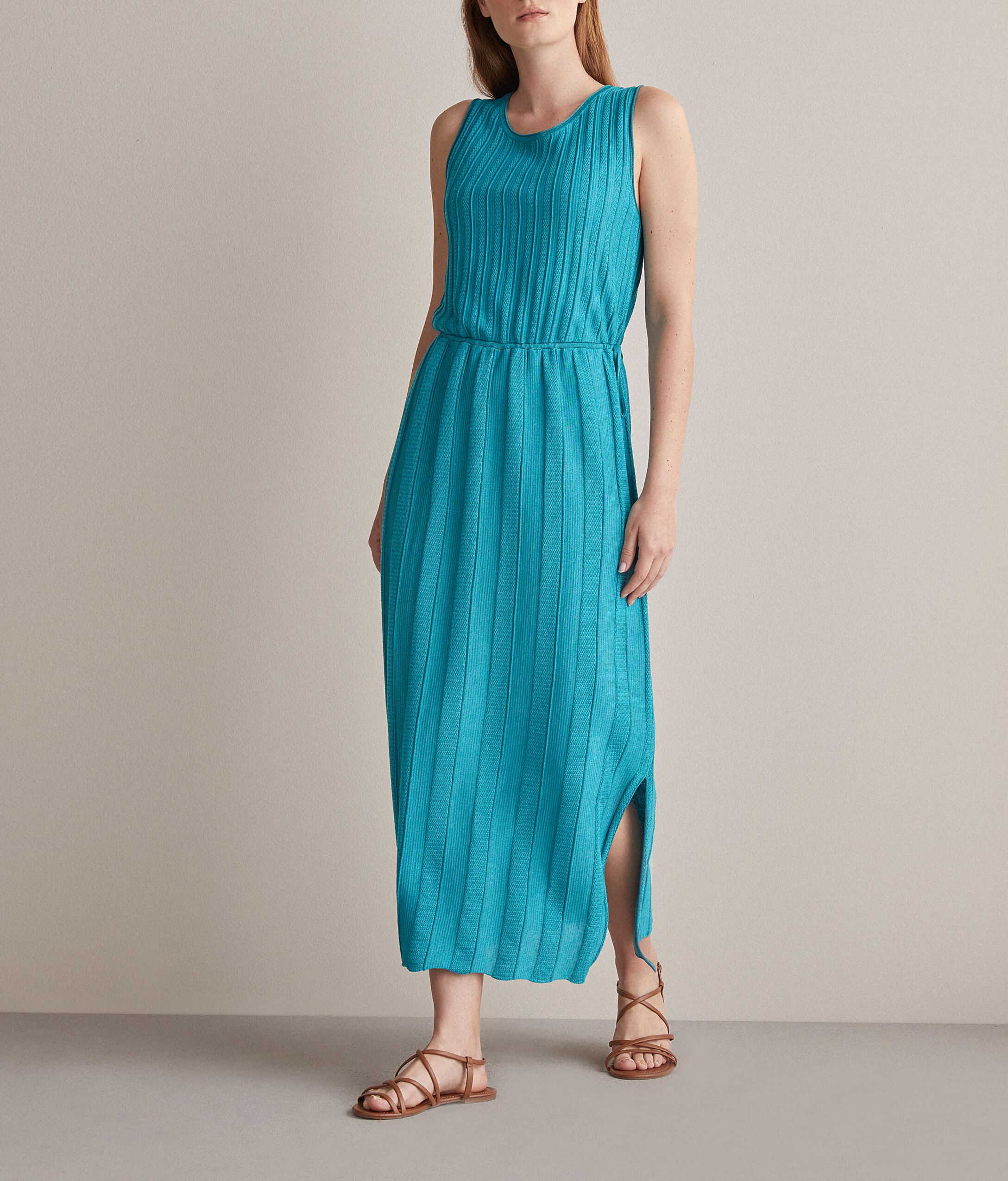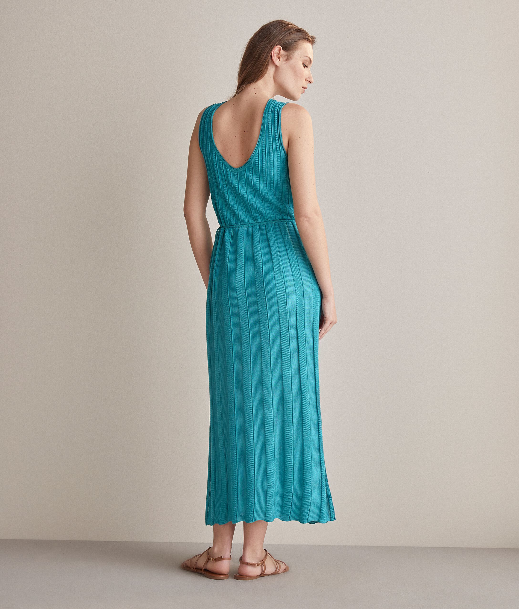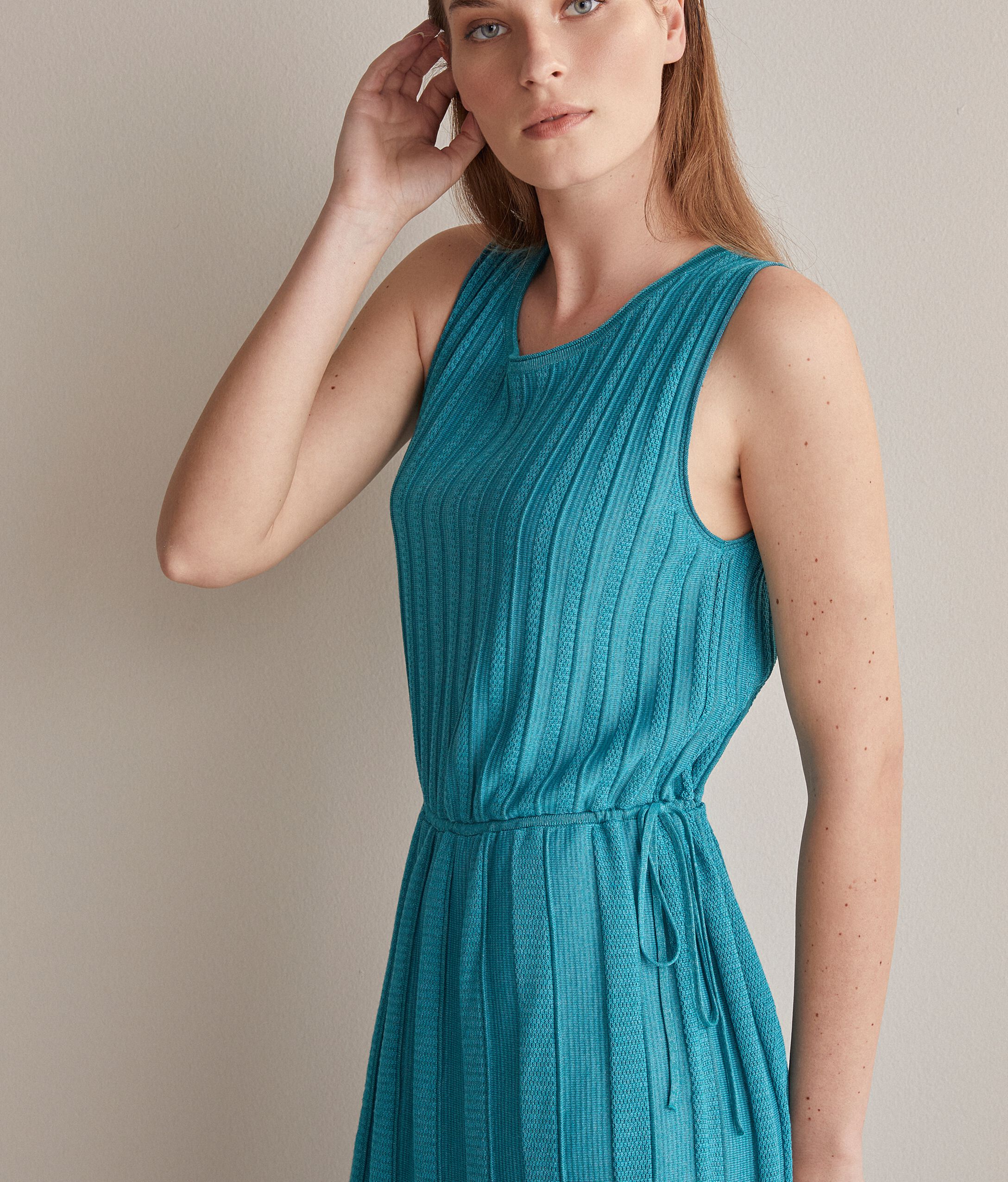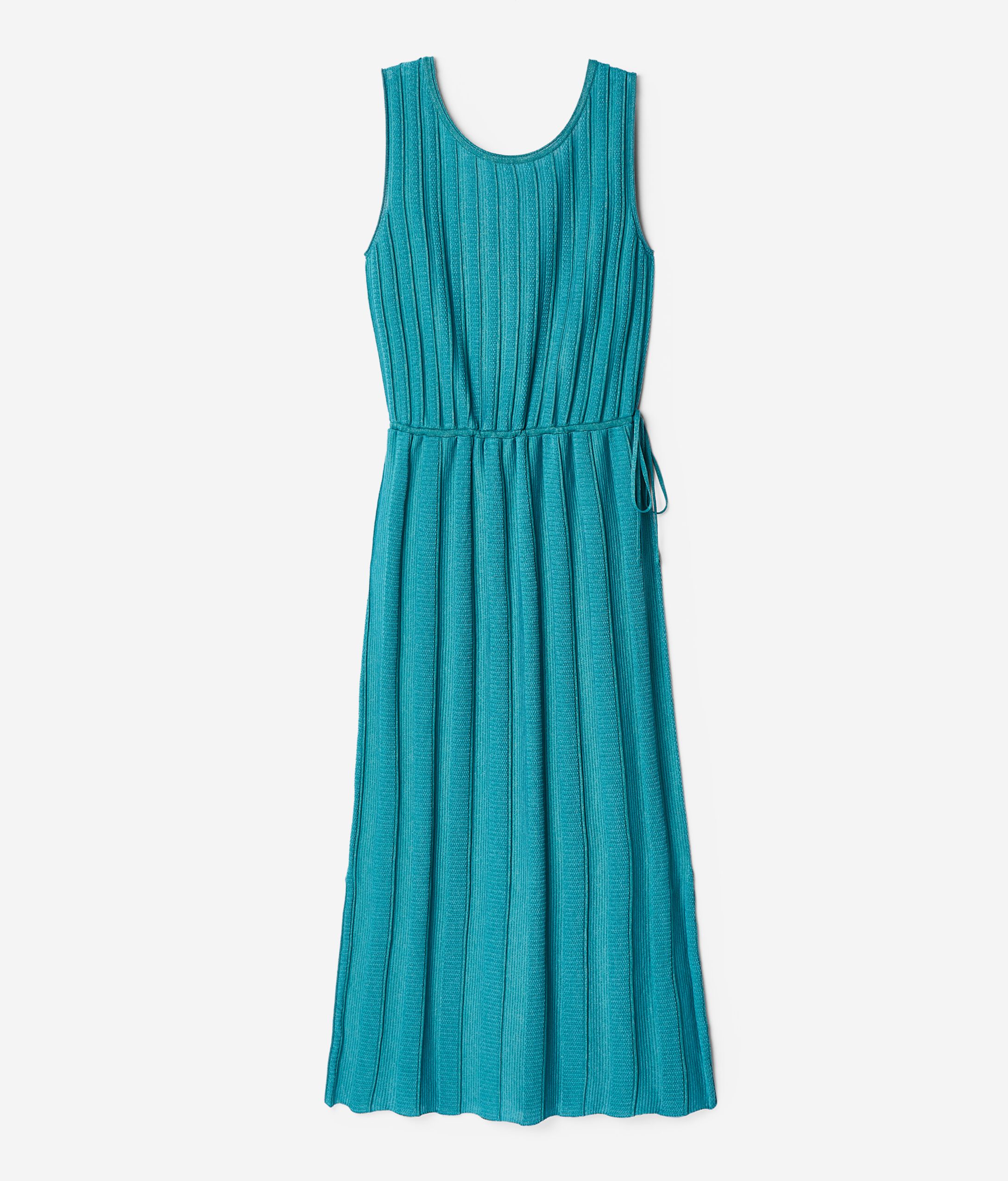 Linee essenziali e gusto retrò ispirano forme e volumi di questo abito girocollo senza maniche in cotone e viscosa. La scollatura sulla schiena dona un tocco femminile e la coulisse regolabile in vita ne definisce la figura.