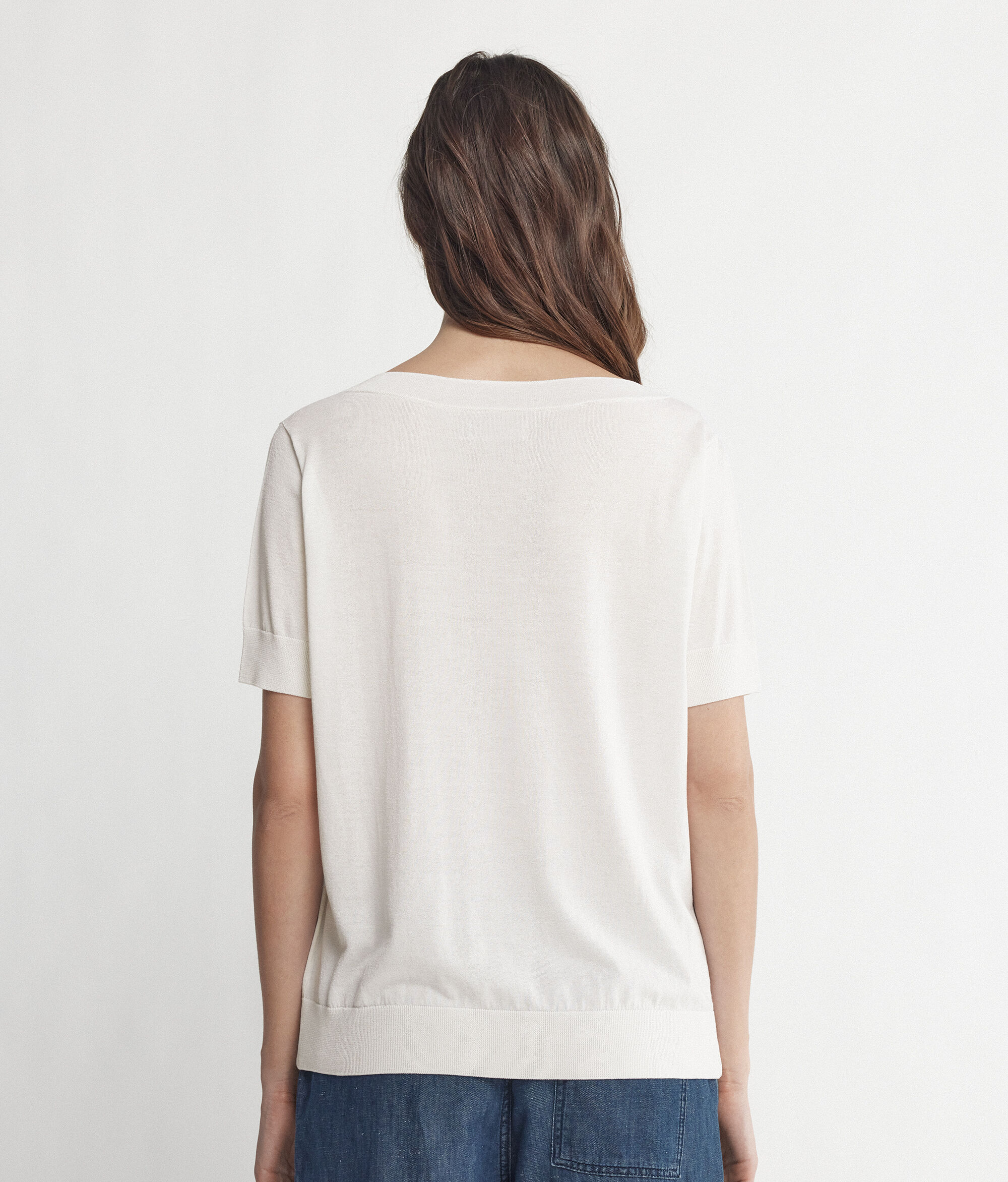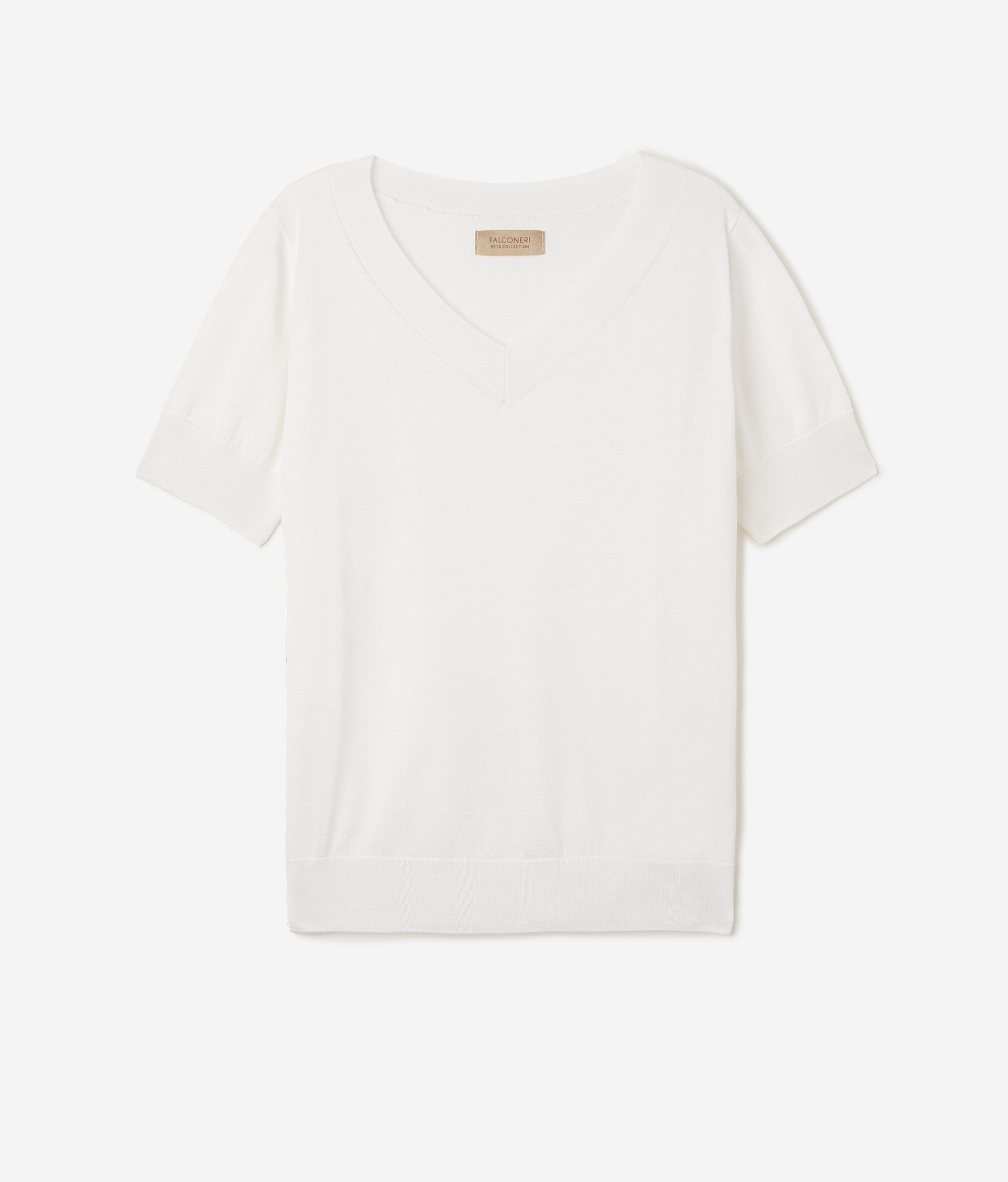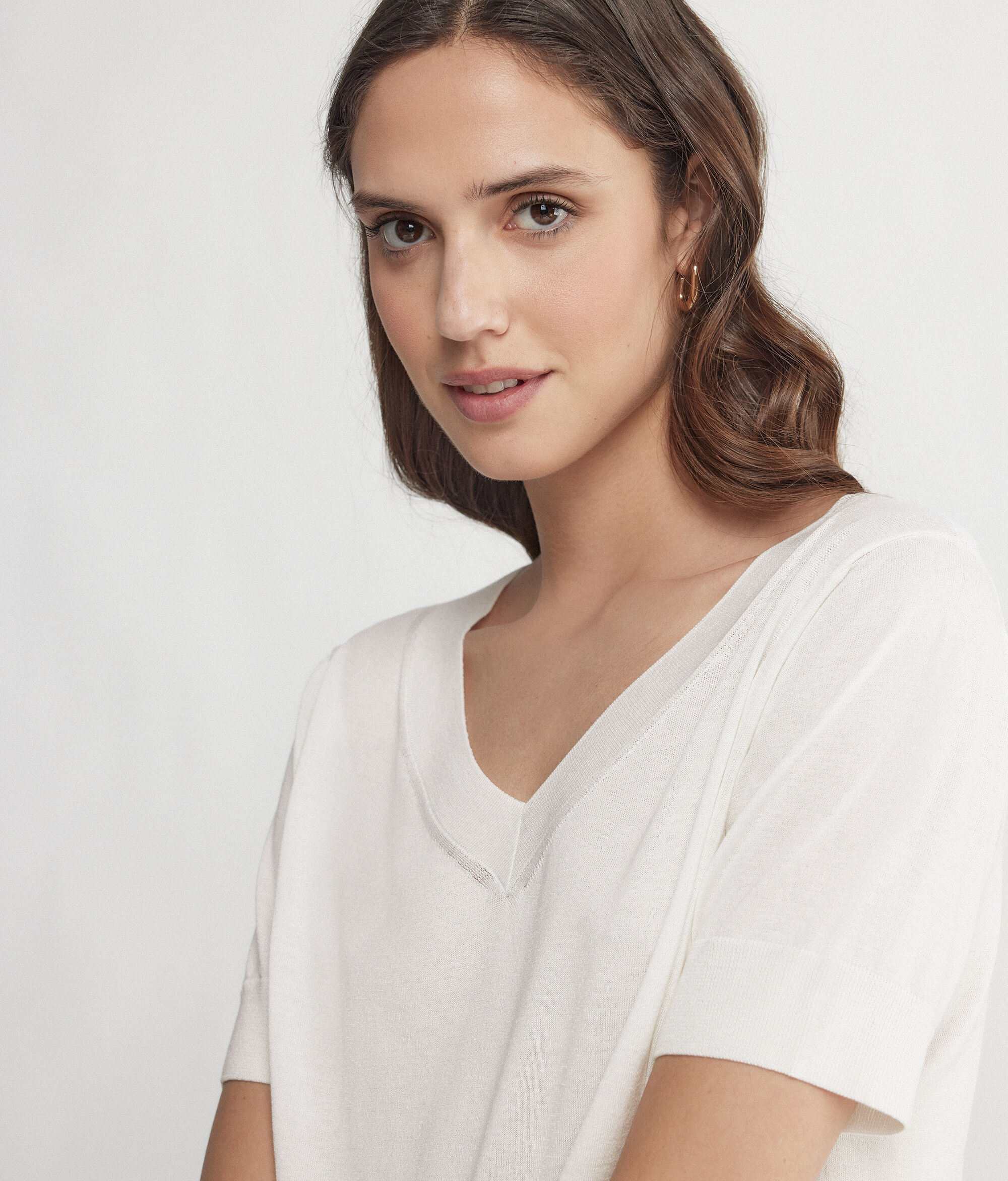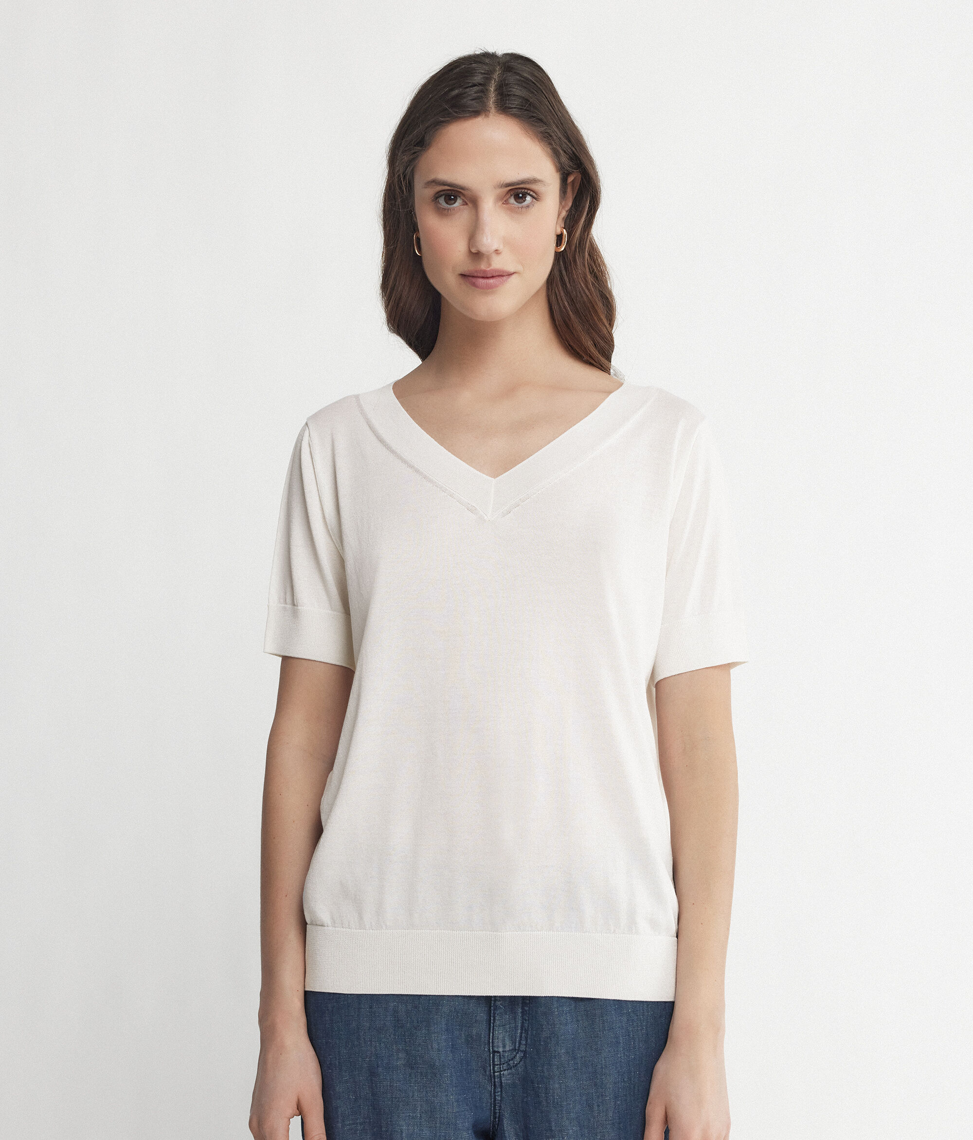 Maglia con Scollo a V a Maniche Corte in Seta Cotone