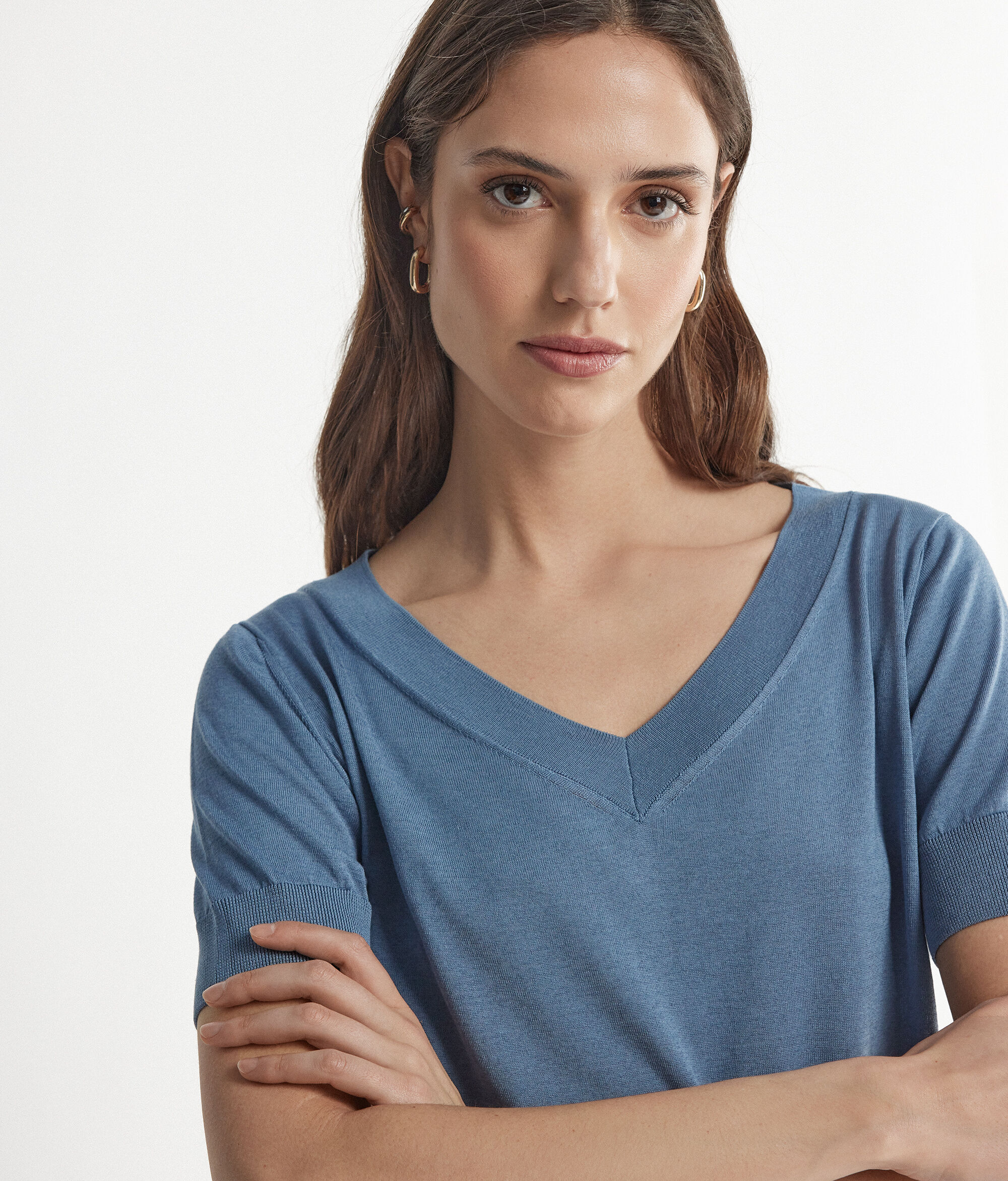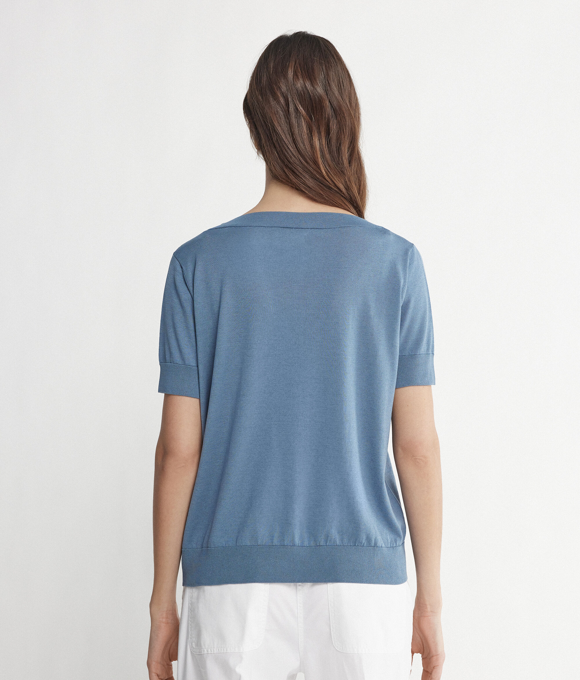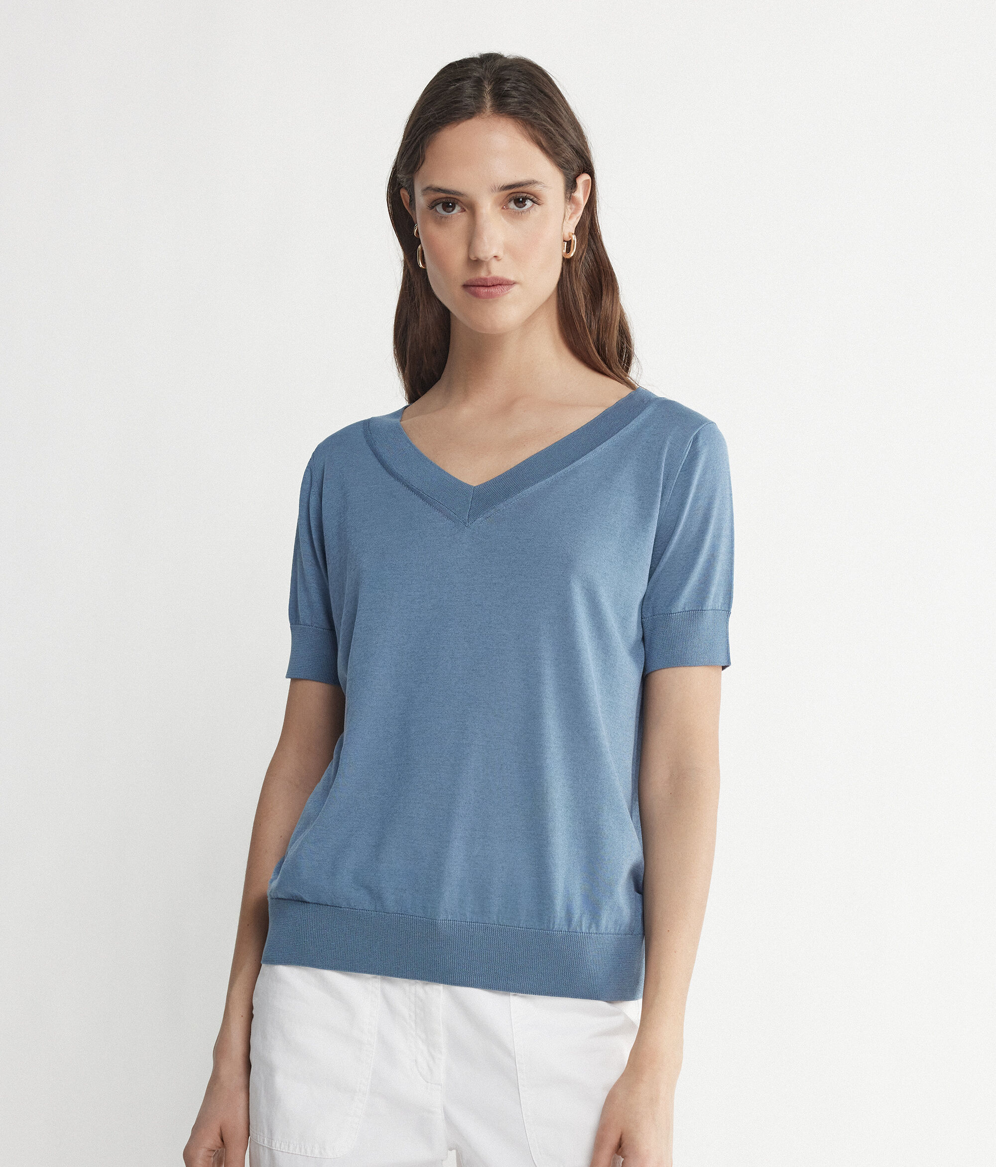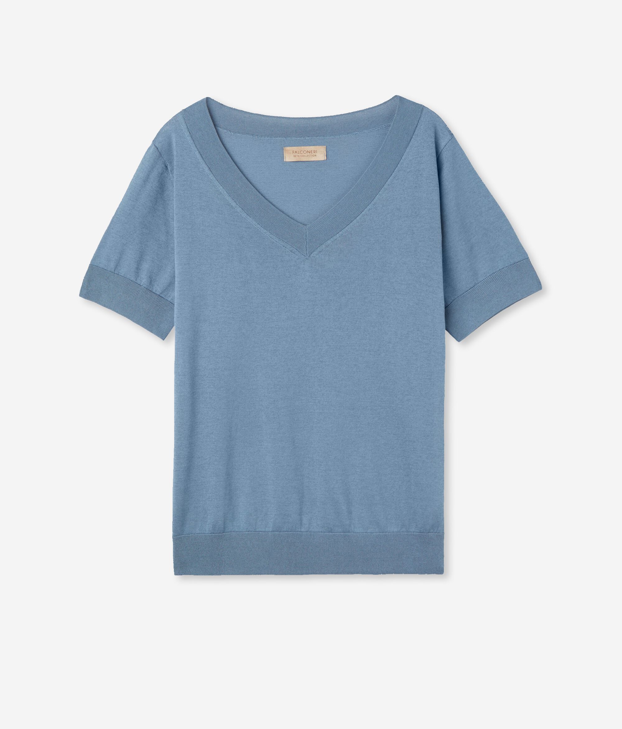 Maglia con Scollo a V a Maniche Corte in Seta Cotone