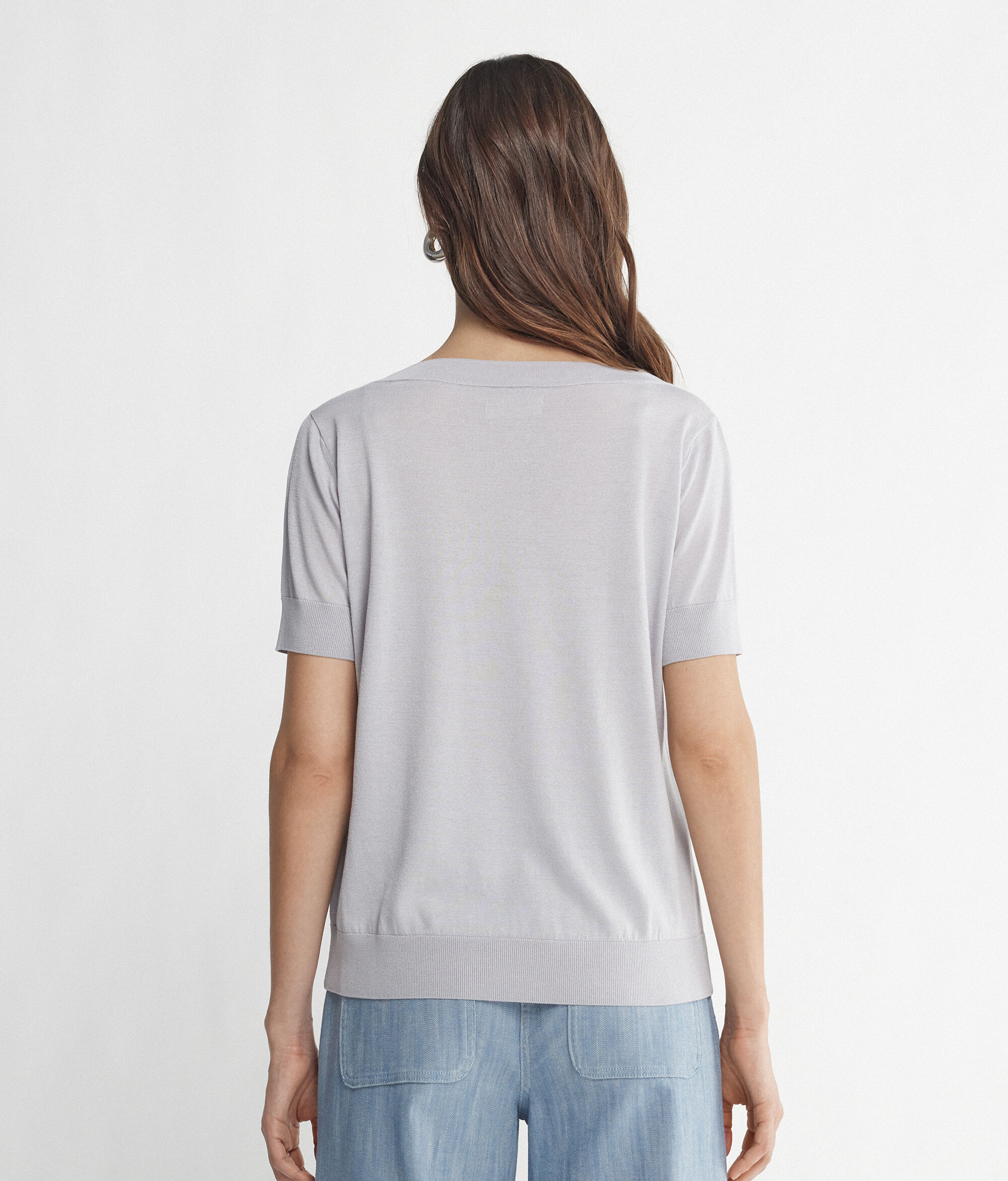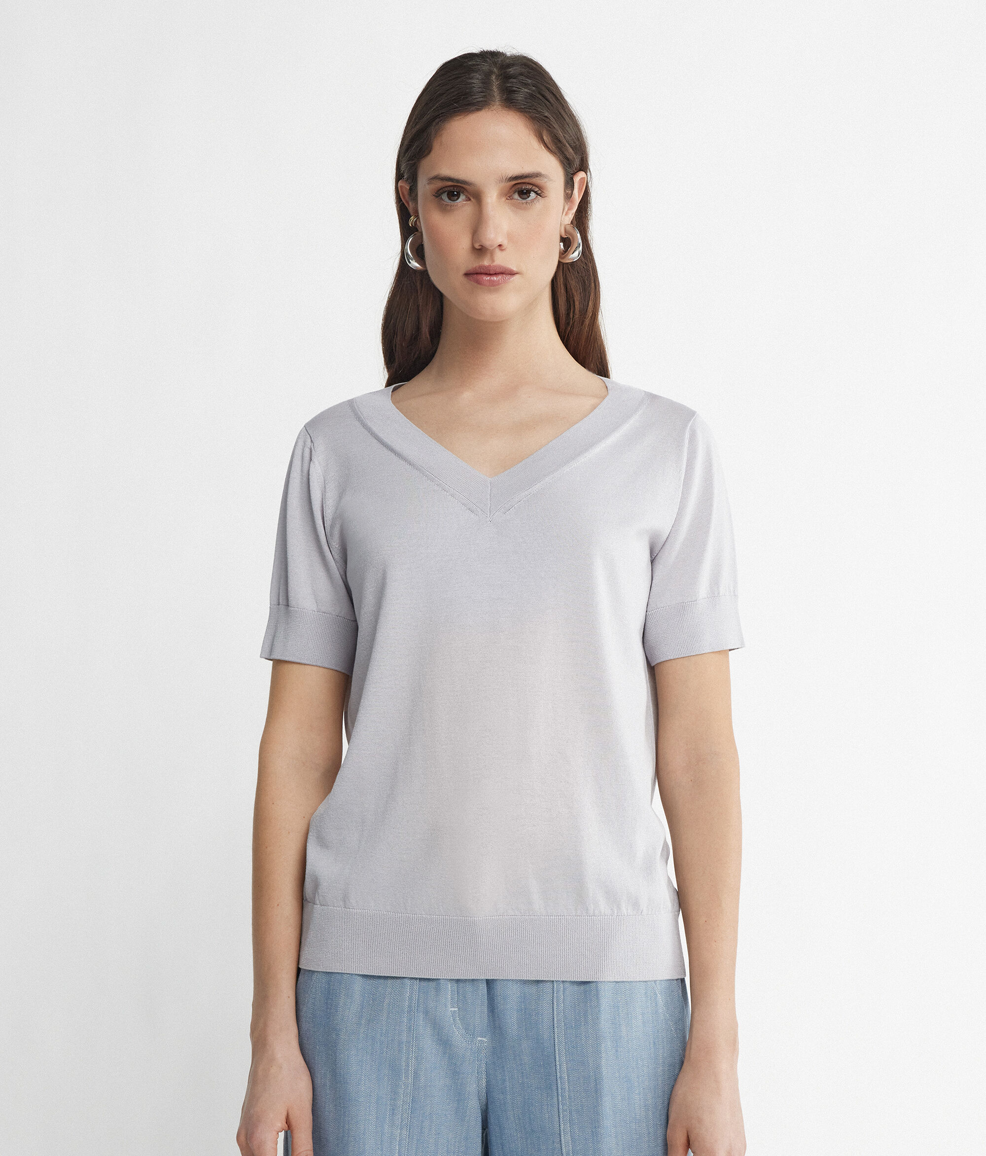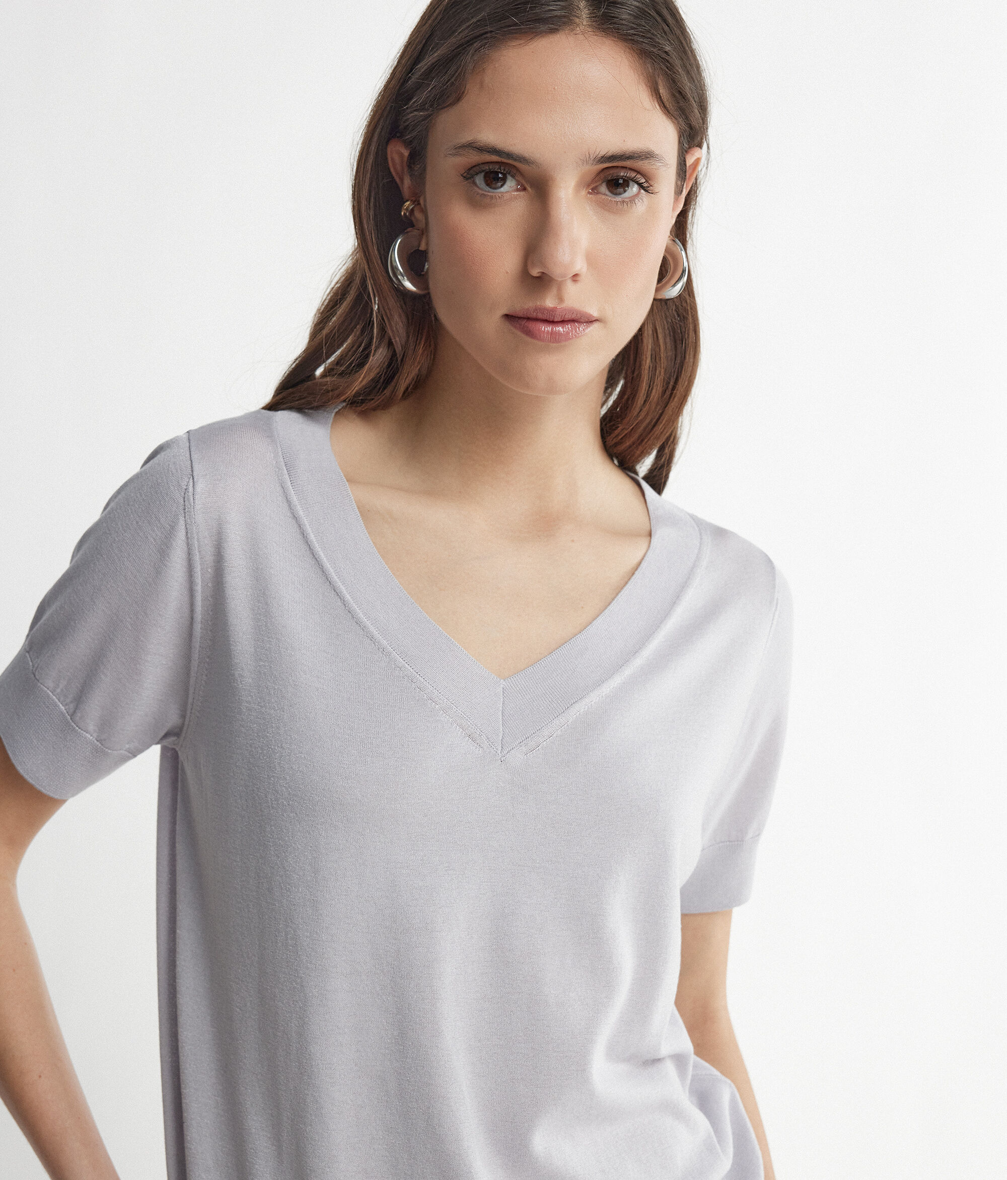 Maglia con Scollo a V a Maniche Corte in Seta Cotone