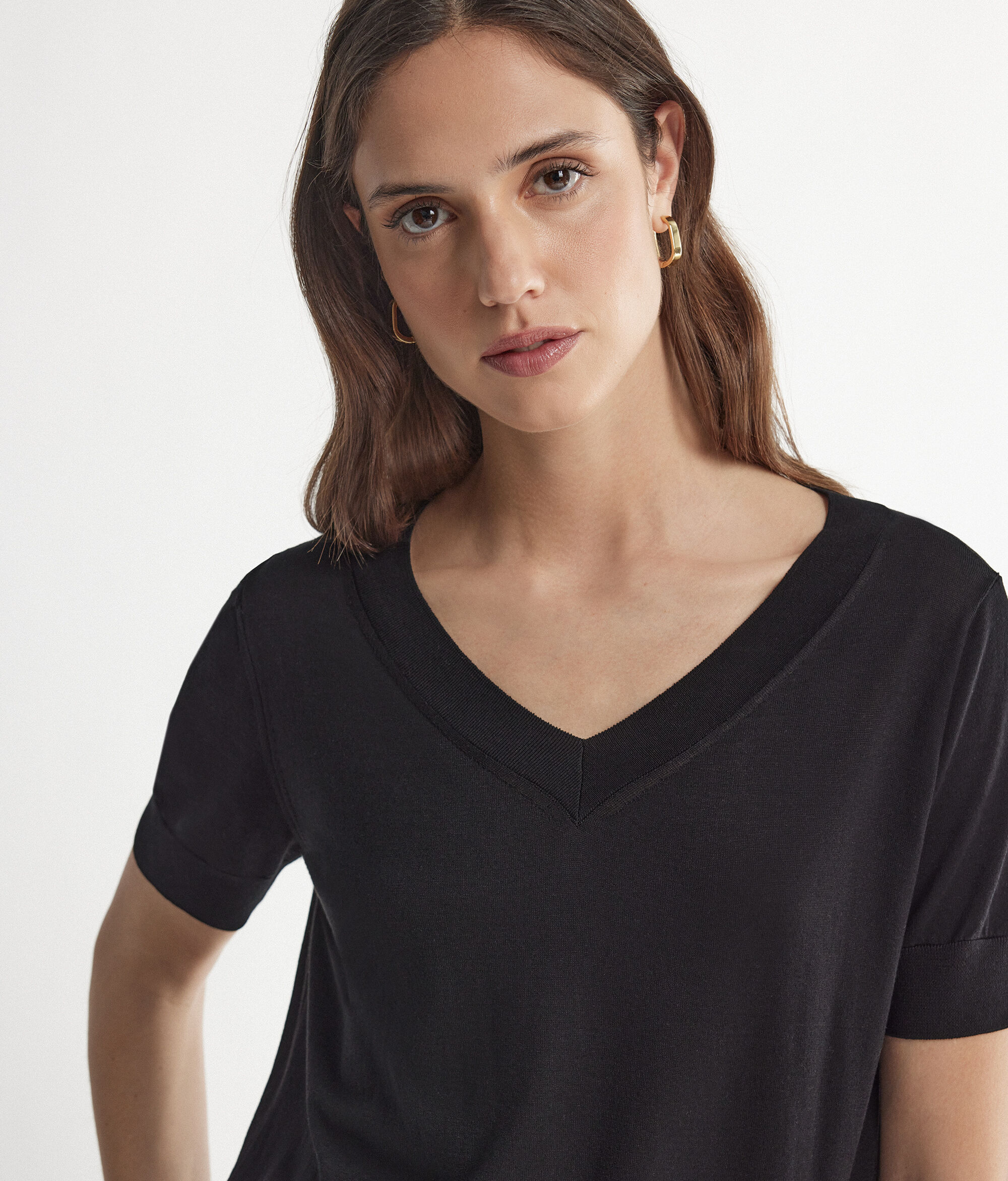 Maglia con Scollo a V a Maniche Corte in Seta Cotone