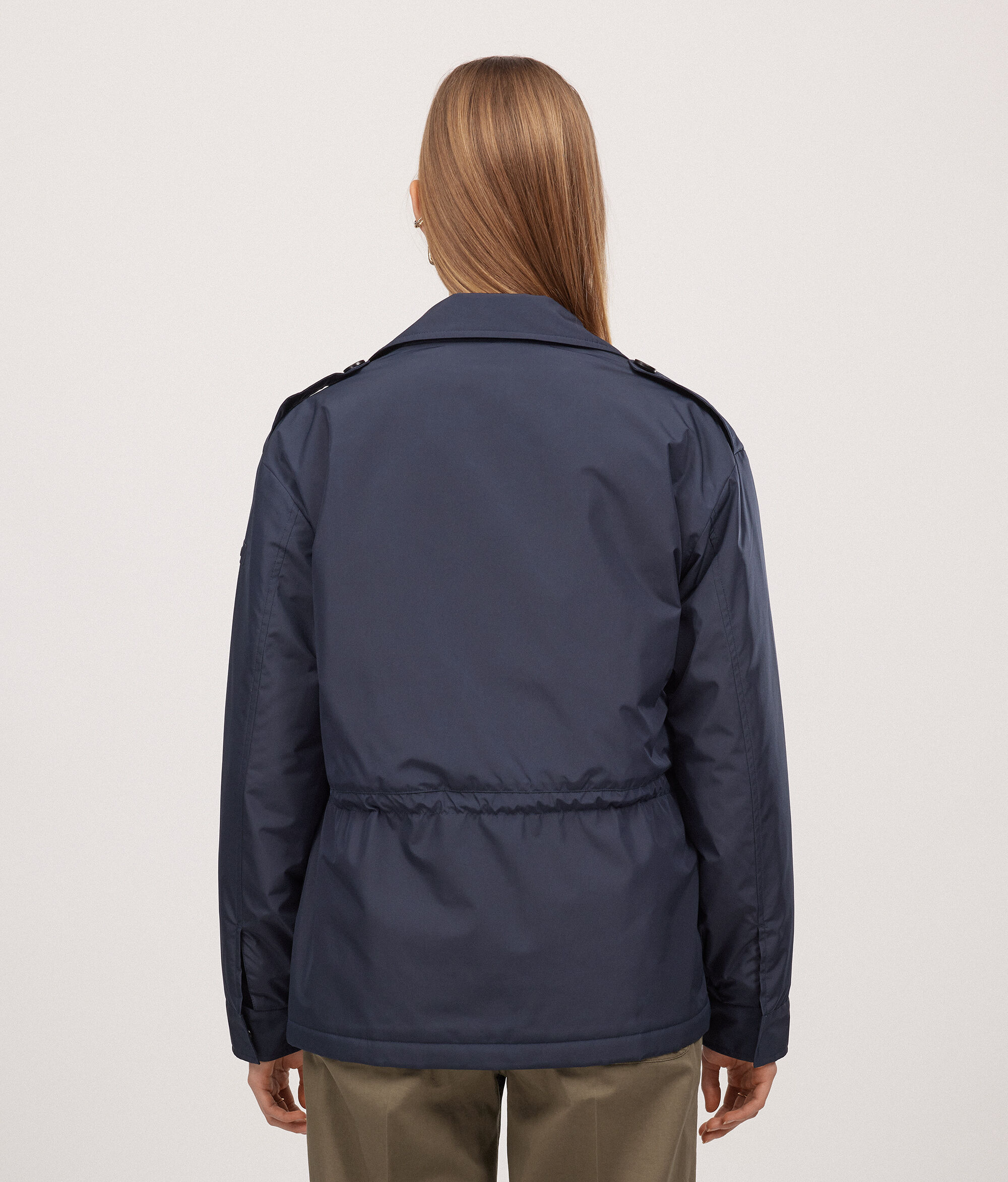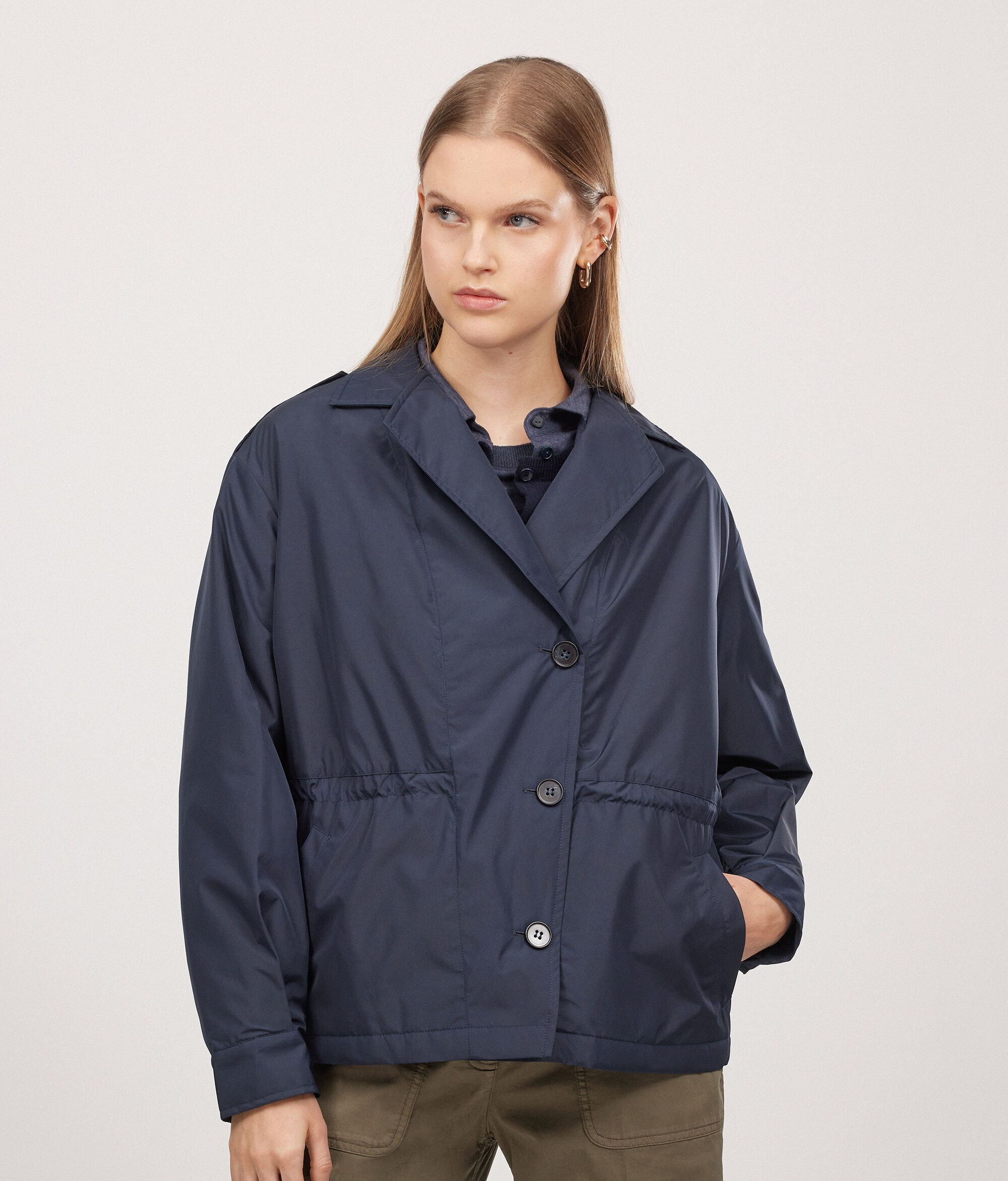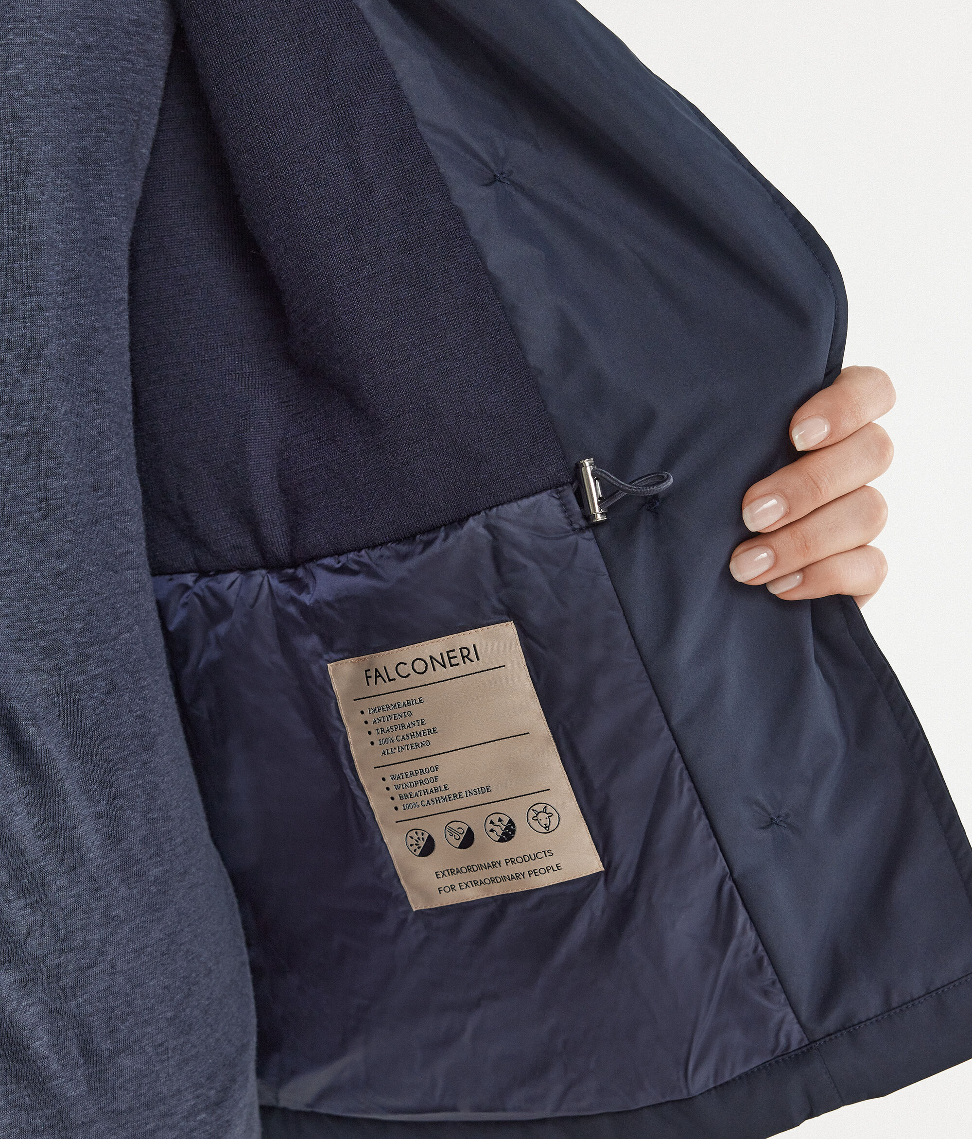 Questo trench corto è un modello a manica lunga realizzato in tessuto tecnico con imbottitura in ovatta ed è impreziosito da un interno in cashmere Ultrafine. Lo completano una chiusura con tre bottoni a vista, una coulisse interna sulla vita e due tasche sul davanti. I dettagli come la mostrina sulla spalla con bottoni a vista, il polsino al fondo con bottone e il logo Falconeri su una delle due maniche, gli conferiscono uno stile casual ma raffinato. Le spalle e la sua vestibilità sono regolar