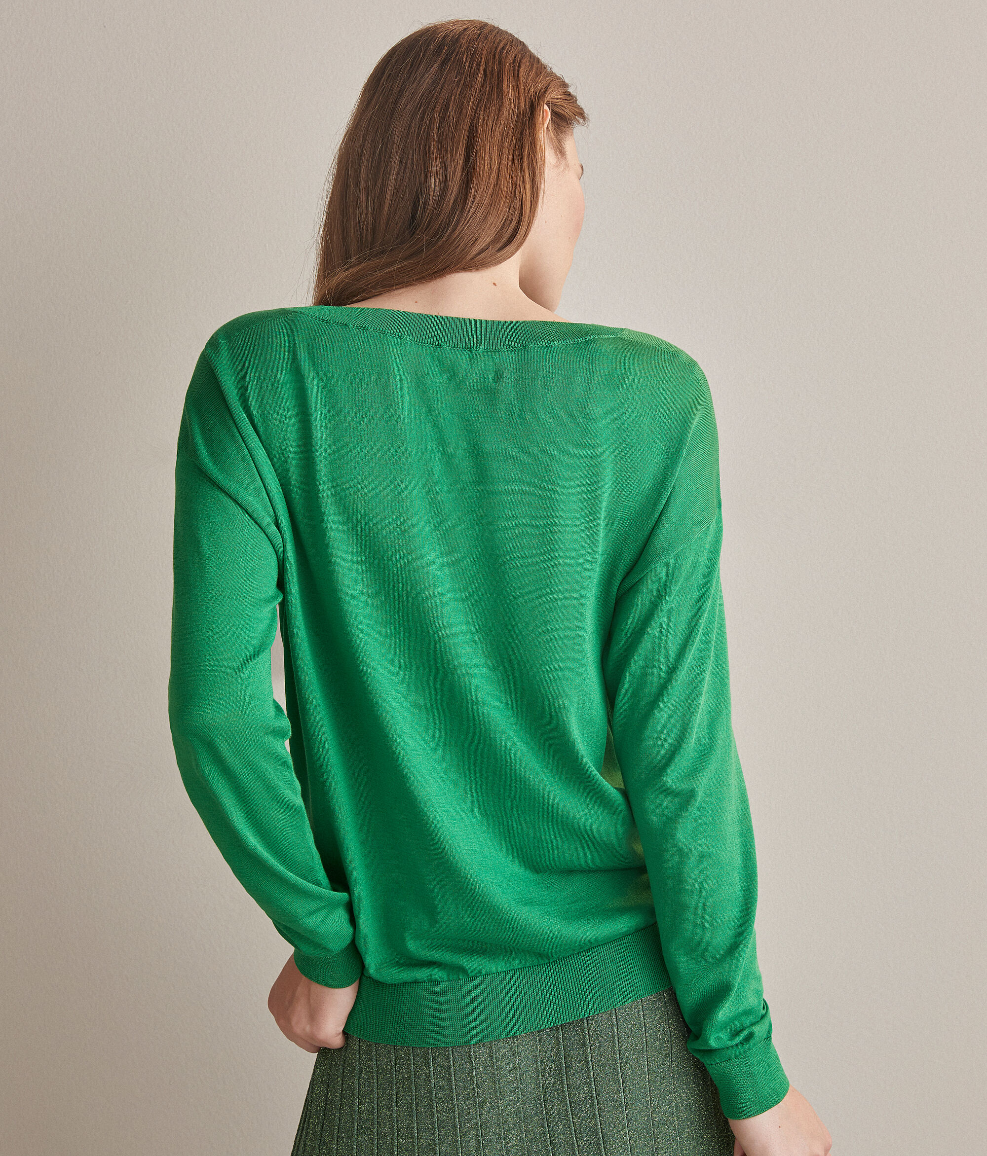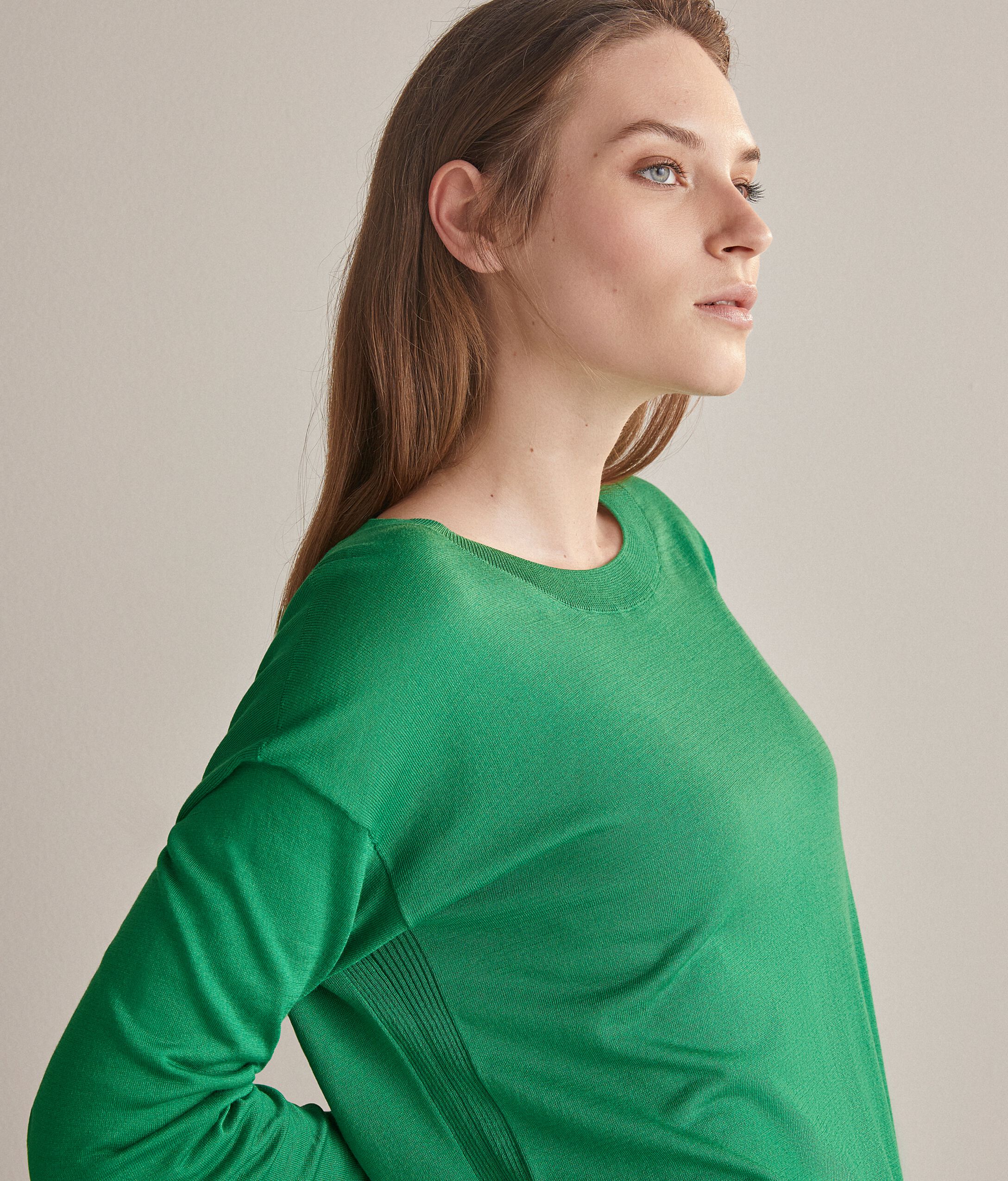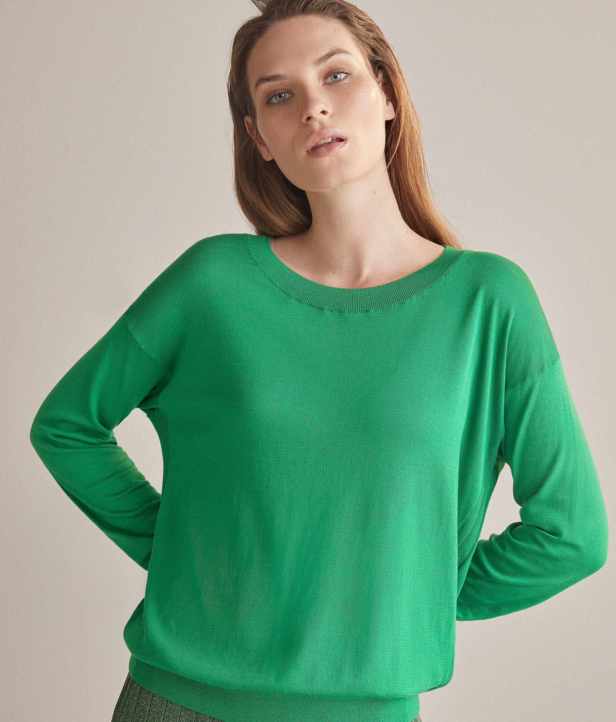 Il pregio della seta e del cotone impreziosisce le forme morbide di questa maglia con ampio girocollo e conferiscono alla texture una mano fluida e piacevole all'indosso. La versatilità d'uso la rende capo unico ed indispensabile perfetto su qualsiasi abbinamento.