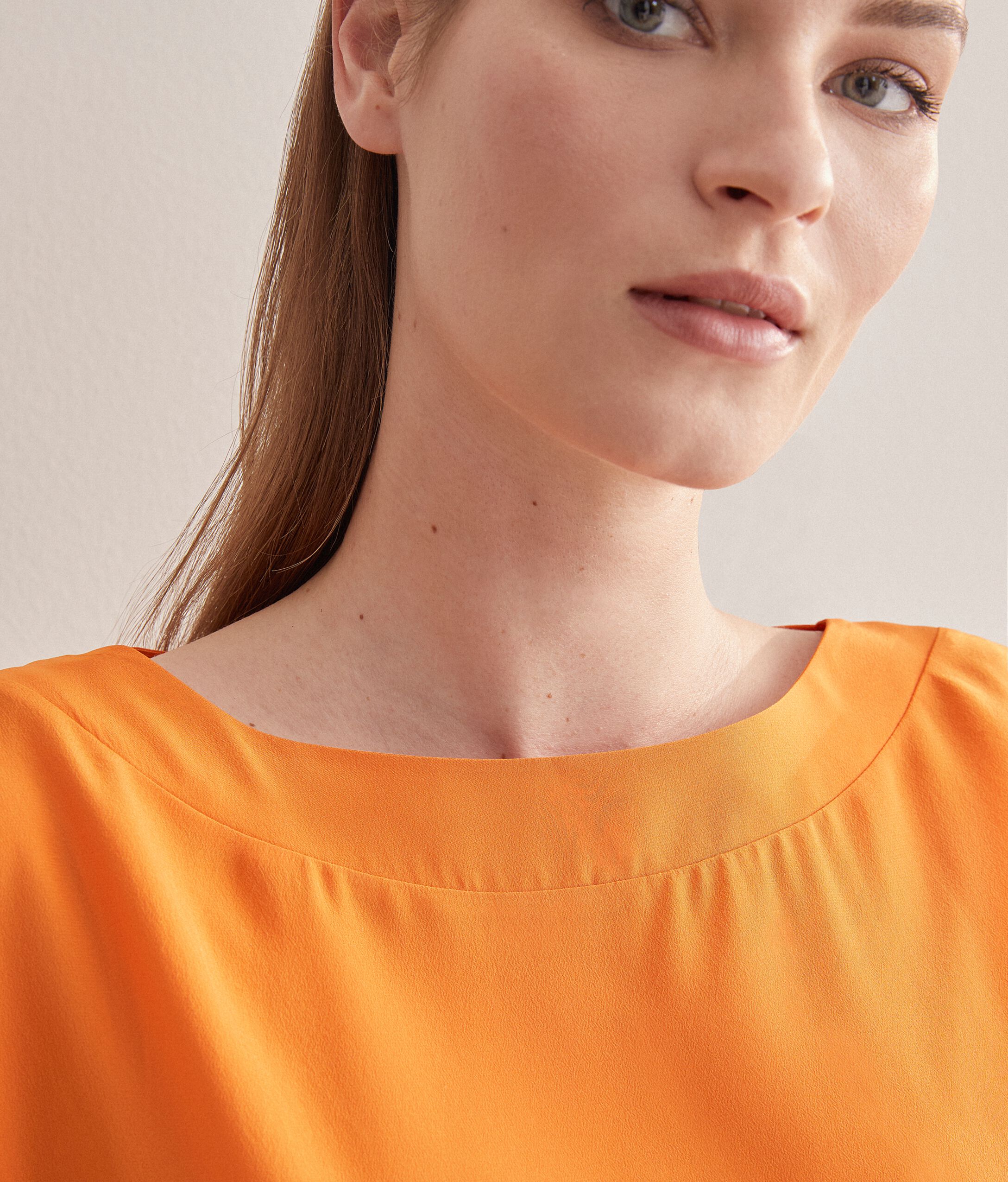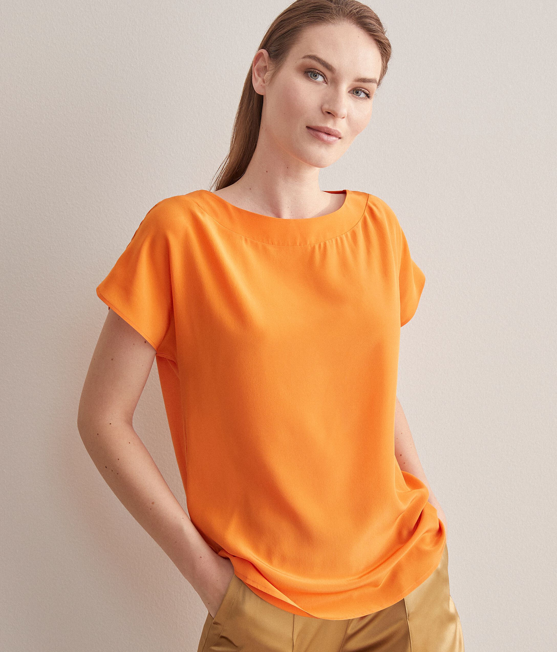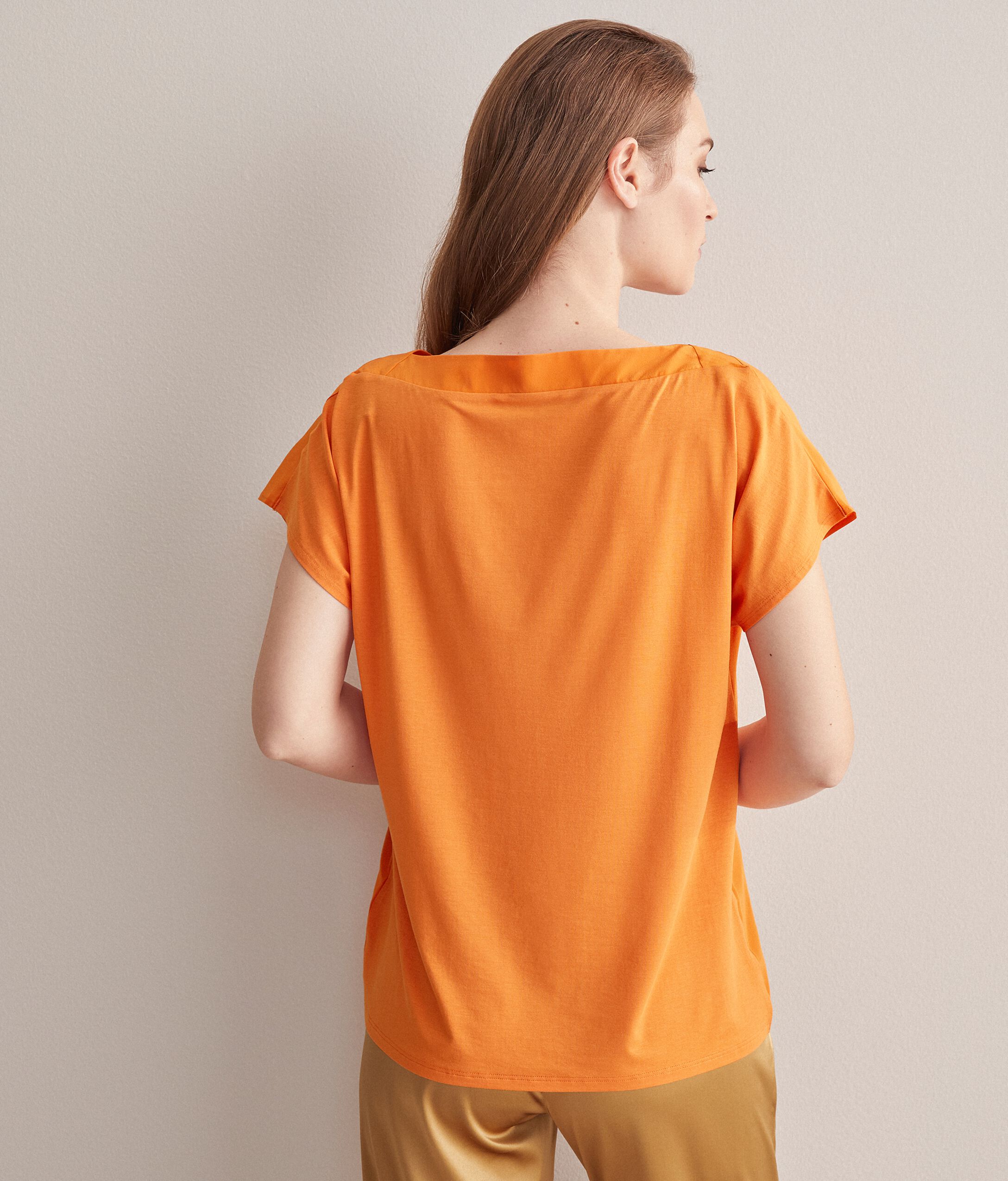 Equilibrio nelle forme e nei volumi caratterizzano lo stile della collezione Falconeri che da sempre armonizza lo stile alla naturalezza dei materiali. L'impiego della seta si coniuga sublimamente con le morbide forme di questa t-shirt con scollo a barchetta e maniche a kimono in crepe de chine nella parte anteriore e modal sul retro. Maglia versatile e raffinata del guardaroba femminile, ideale per completare con eleganza i look quotidiani.
