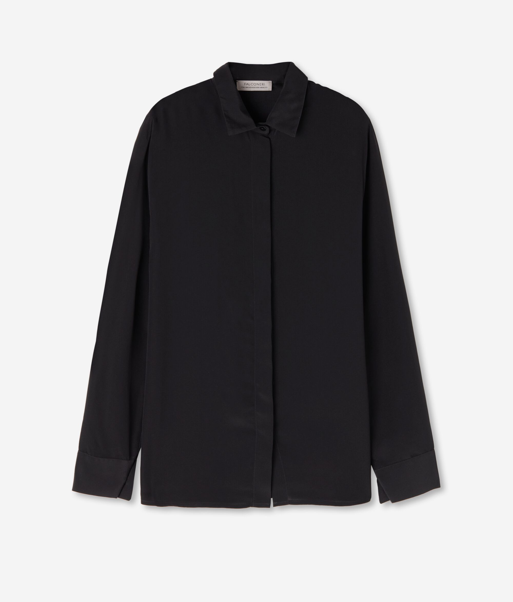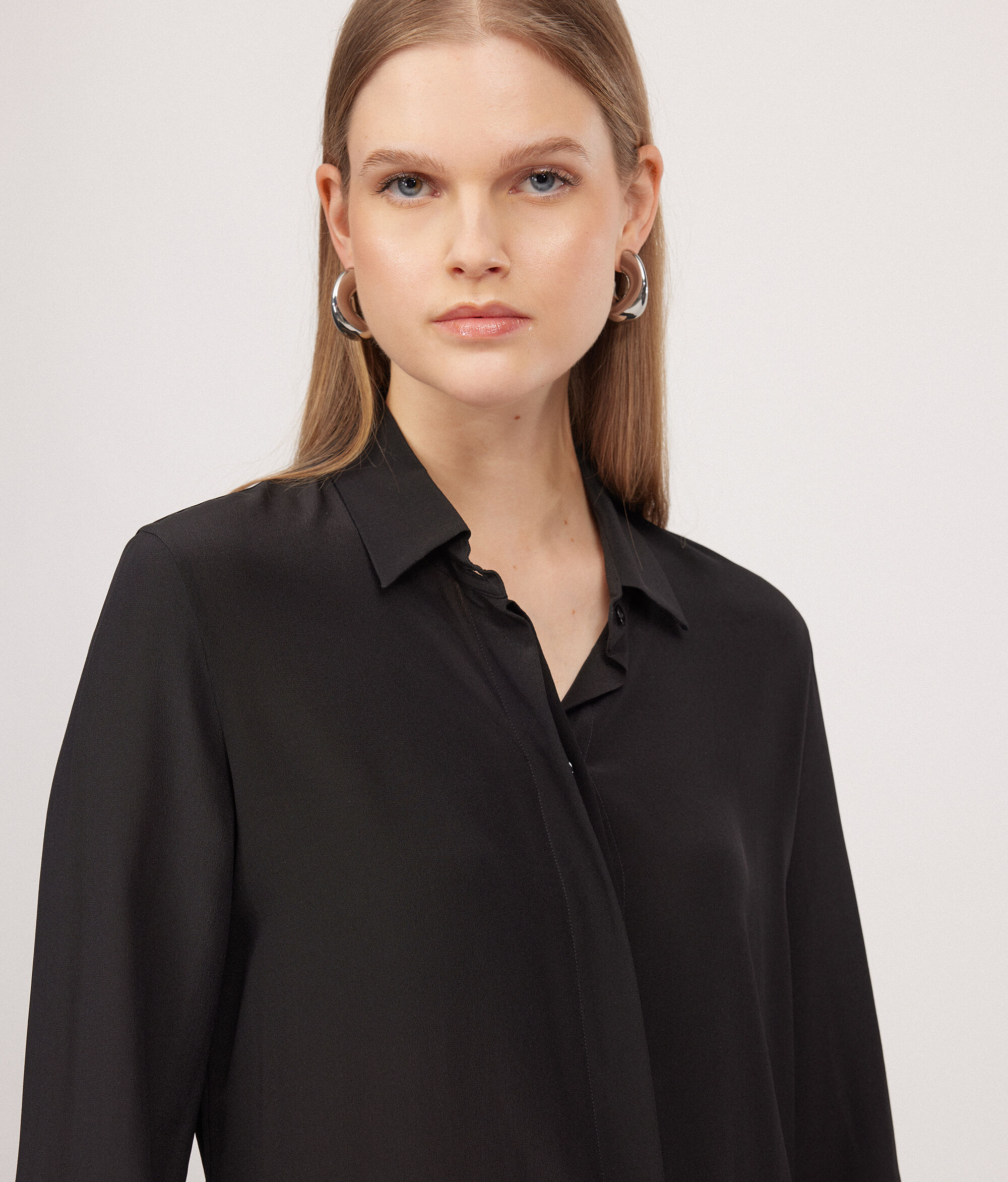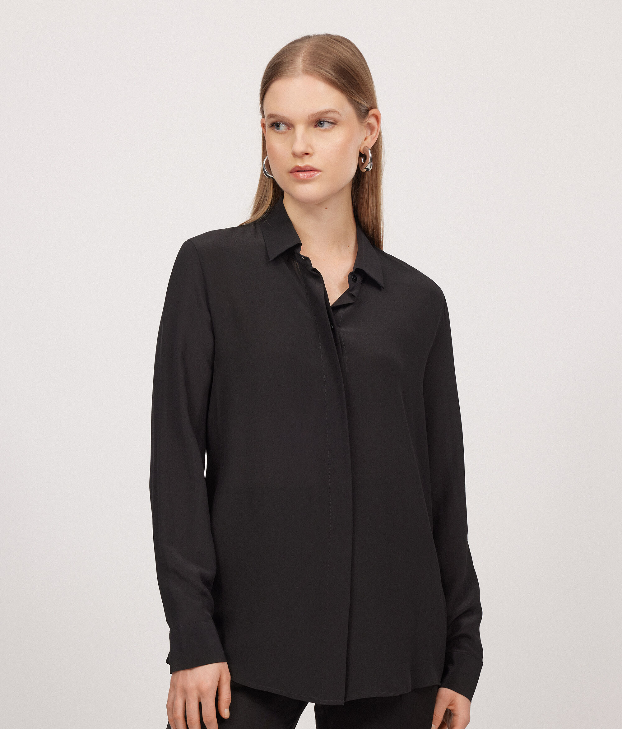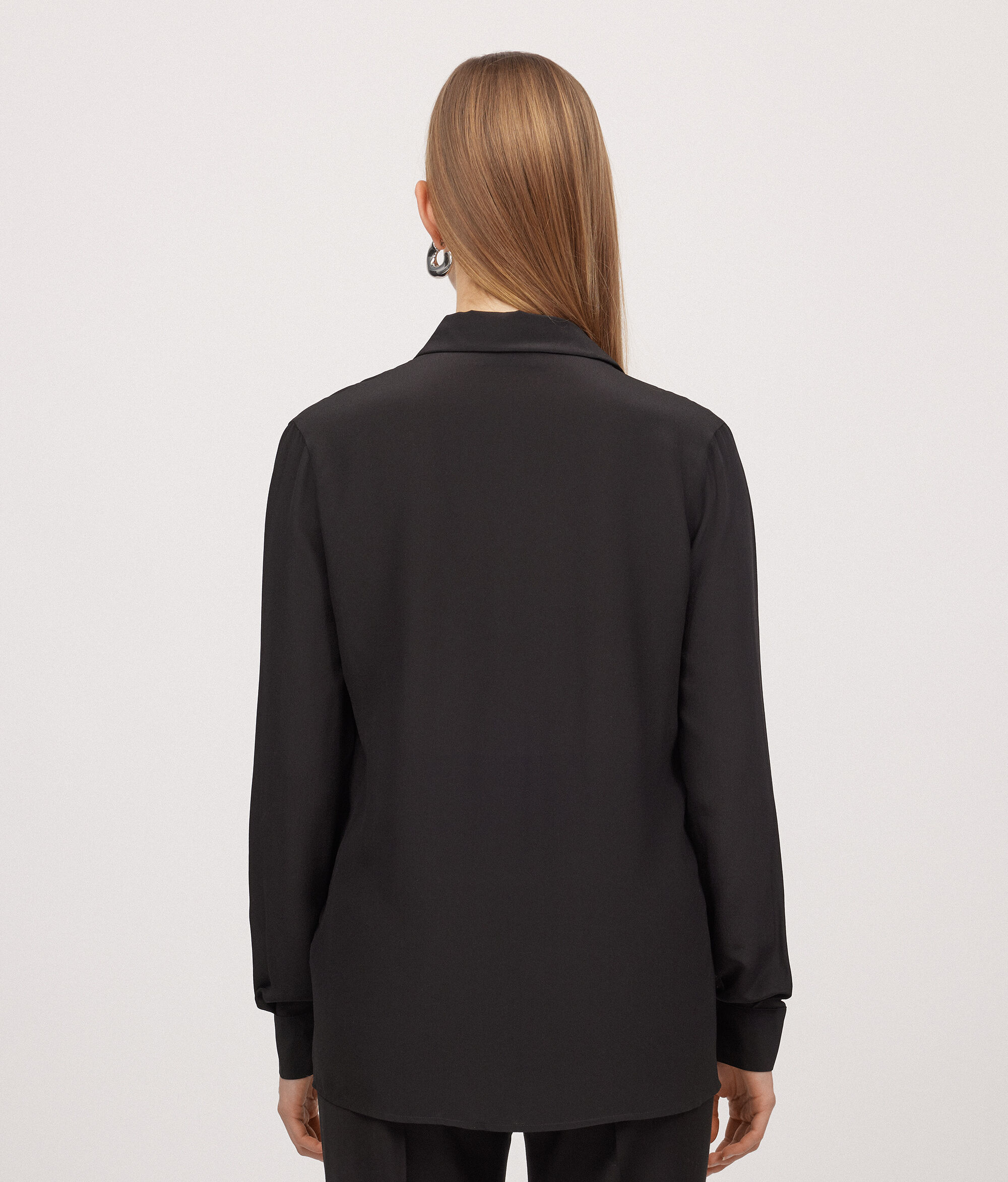 Il pregio della texture della pura seta esalta i volumi di questa camicia raffinata e moderna, che fluida avvolge ed esalta le forme femminili in una delicata morbidezza.