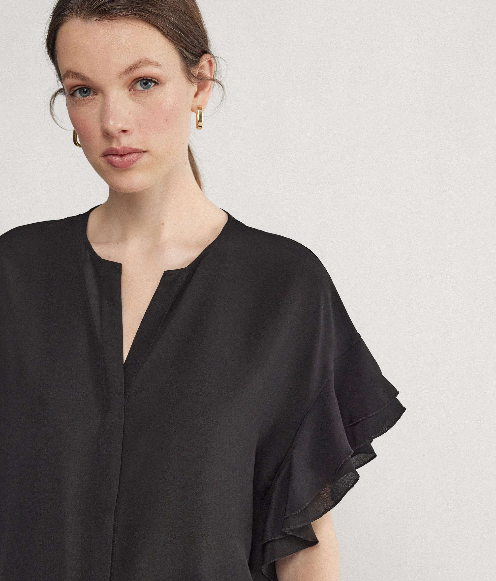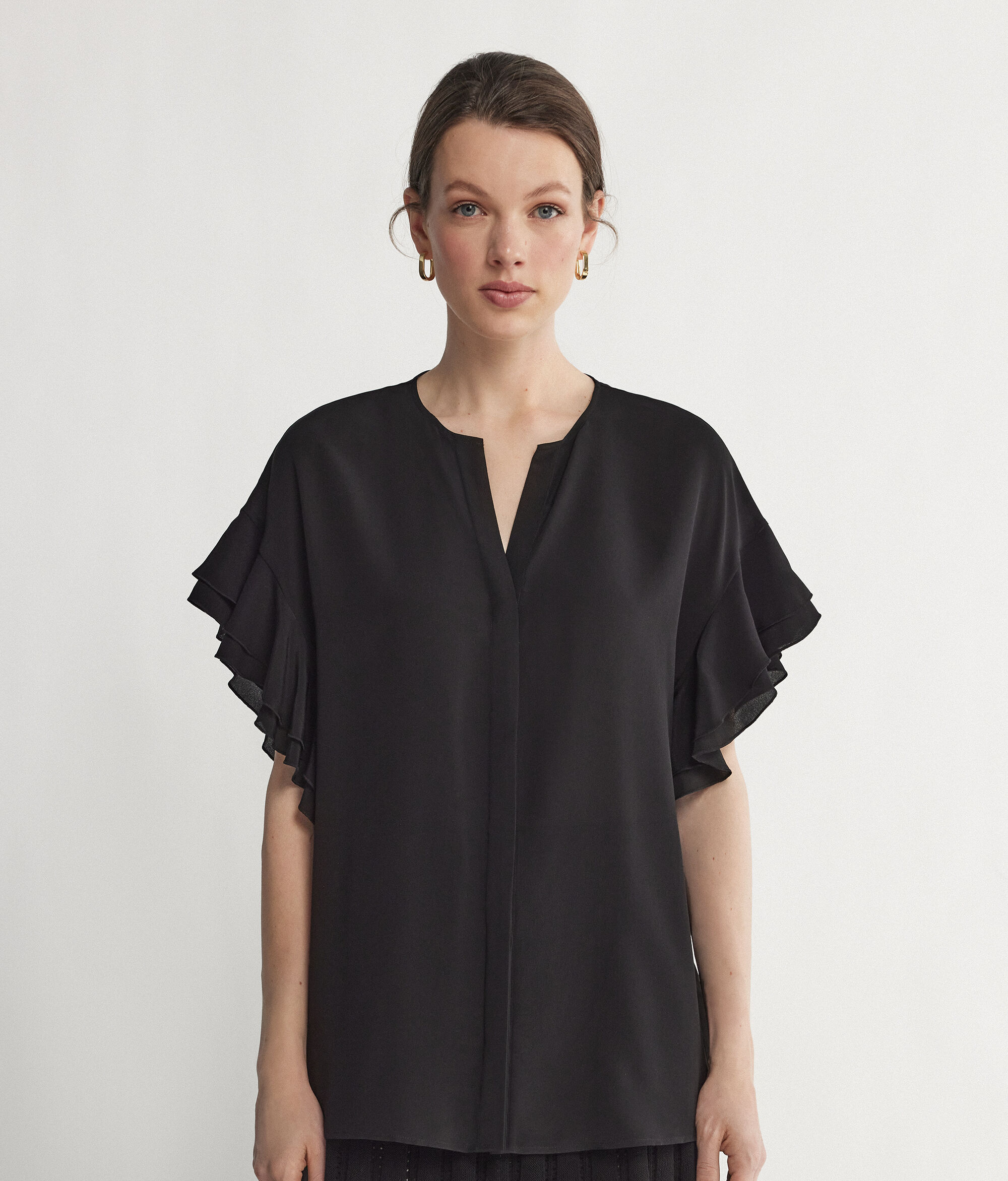 Camicia Scollo a V Maniche Corte In Seta Con Rouches