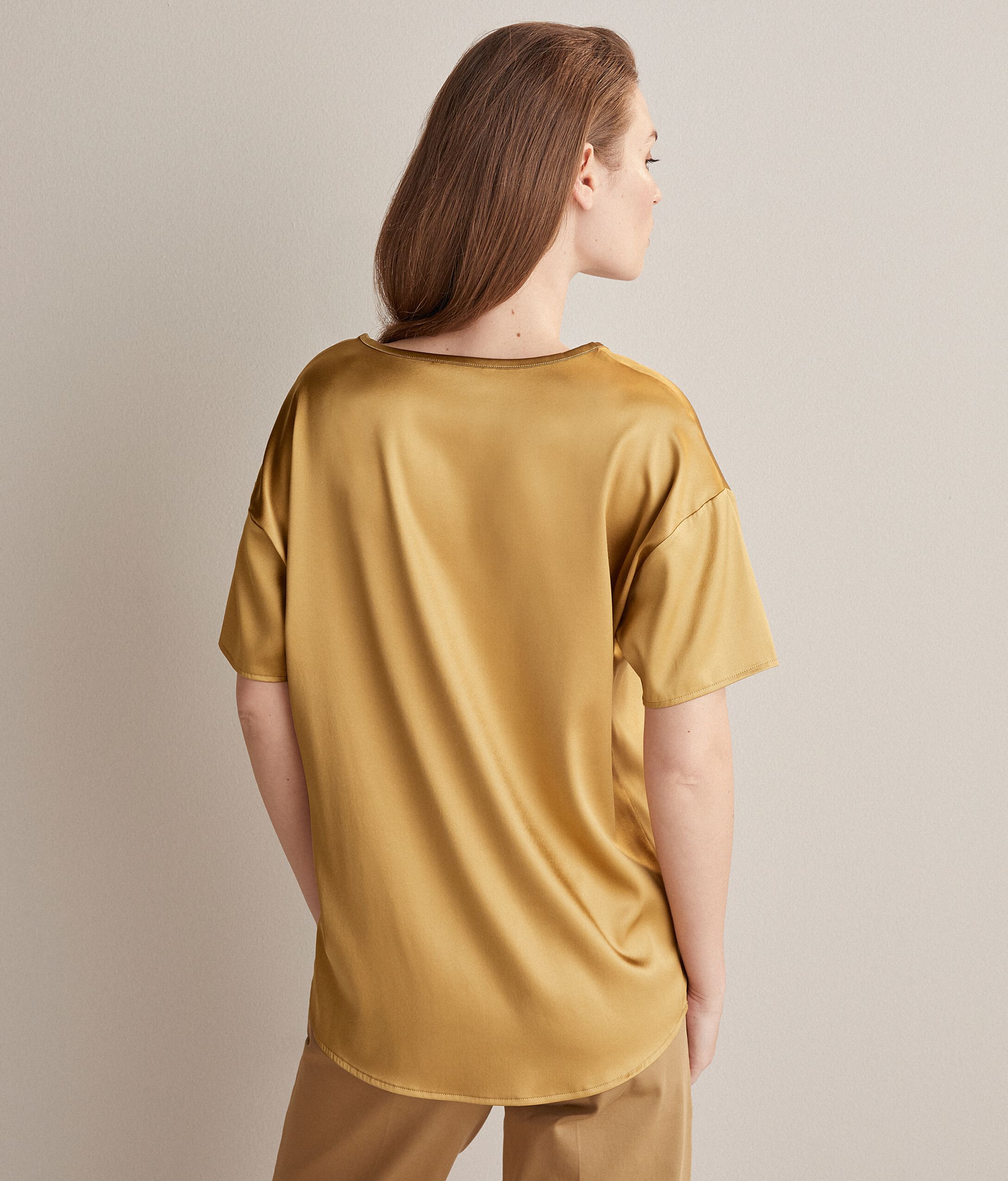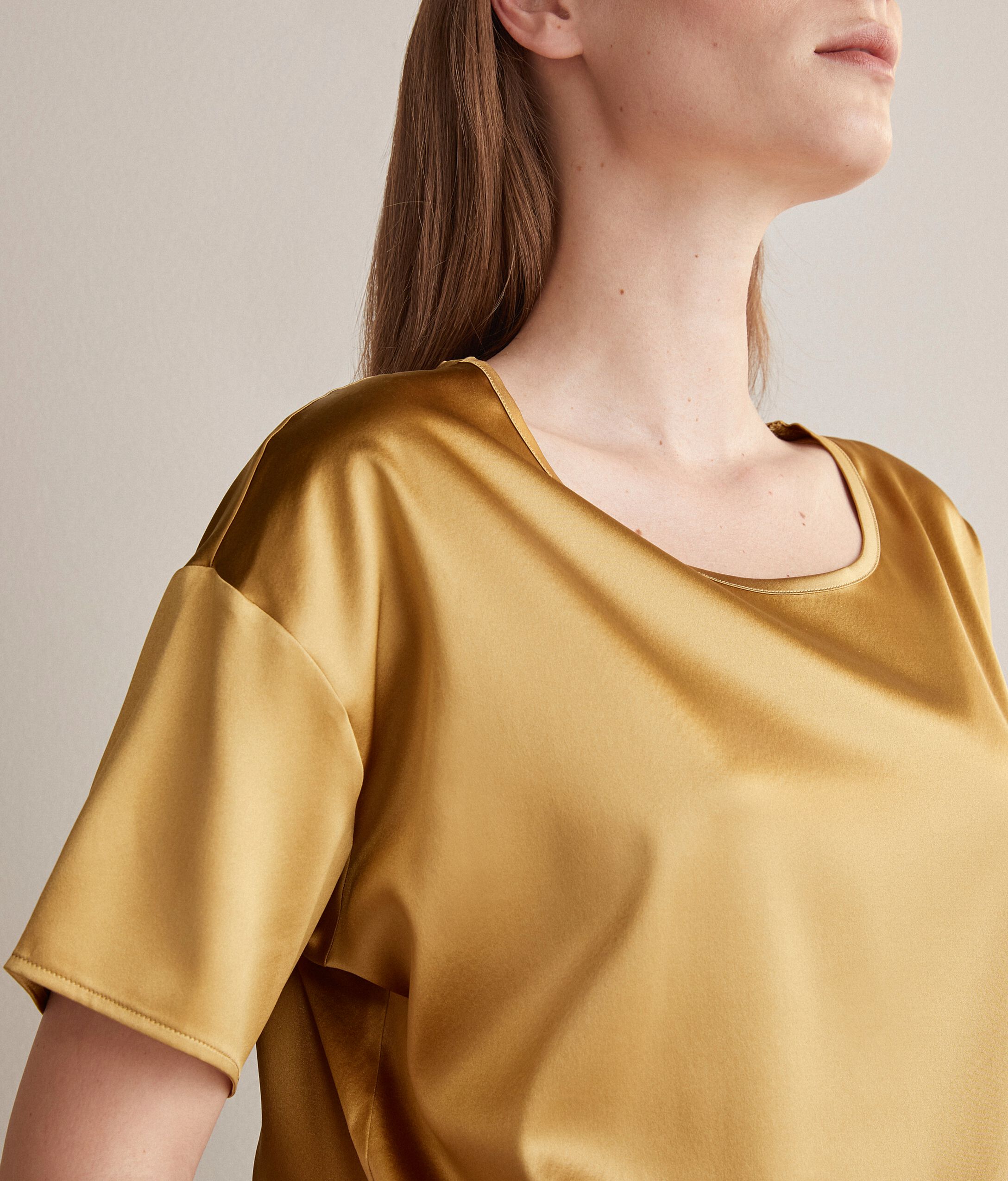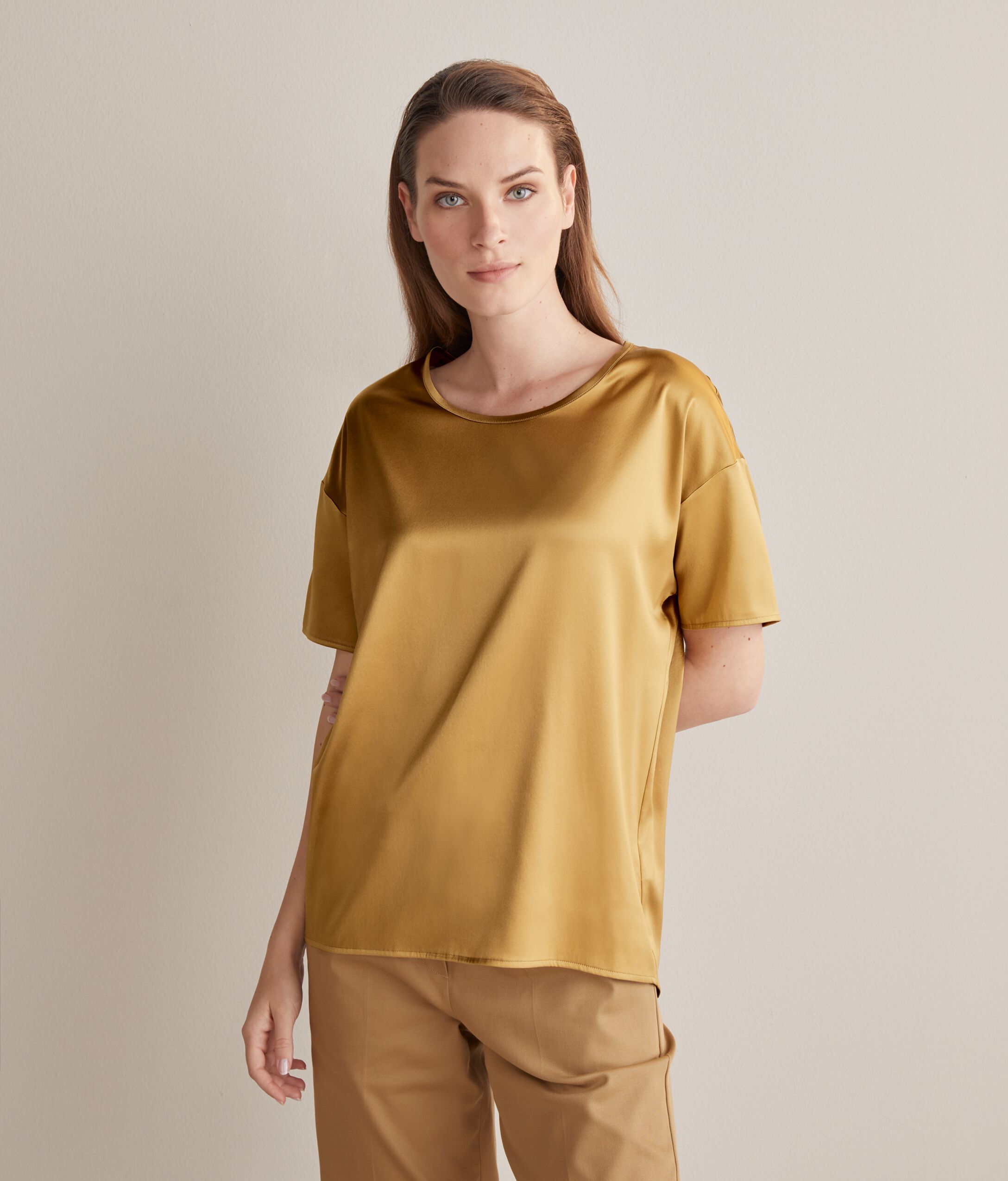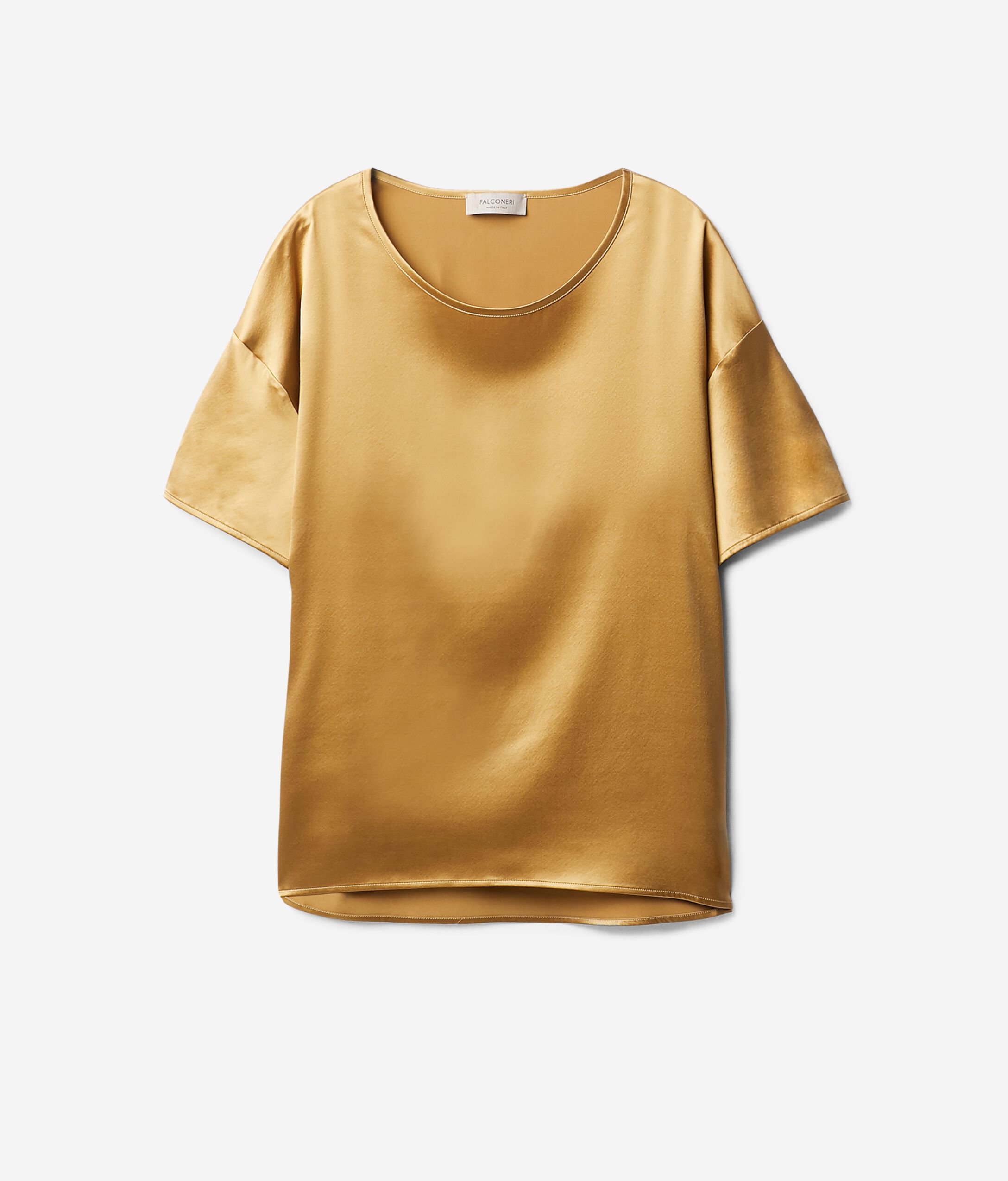 Equilibrio nelle forme e nei volumi caratterizzano lo stile della collezione Falconeri che da sempre armonizza lo stile alla naturalezza dei materiali. L'impiego della seta è sapientemente coniugato con le morbide forme di questa t-shirt in raso elasticizzato. Maglia versatile e raffinata del guardaroba femminile, ideale se abbinata al pantalone DPL406C o DPL406D. La modella è alta 179 cm e veste una taglia MPetto: 88cm / Vita: 67cm / Fianchi: 94cm