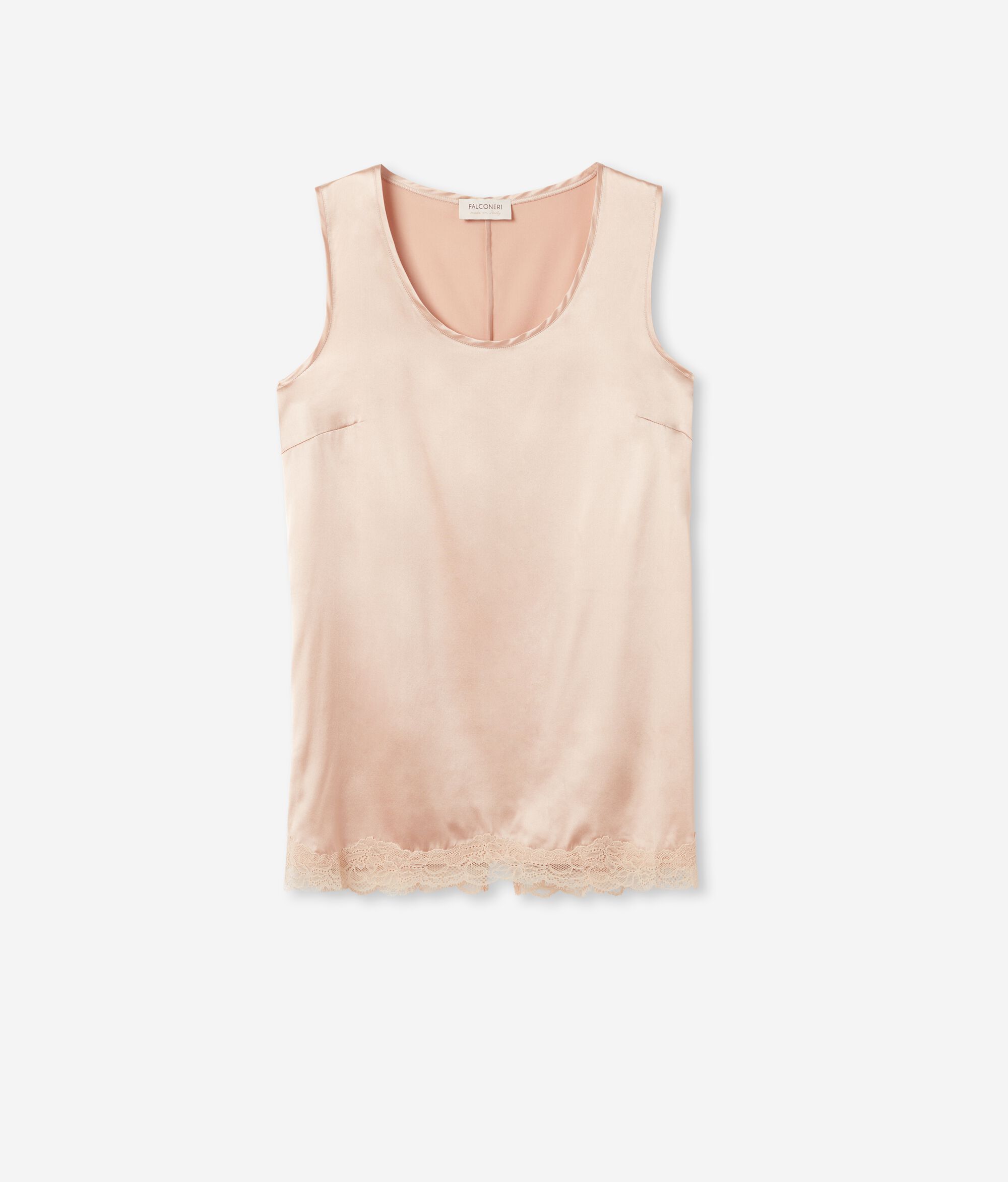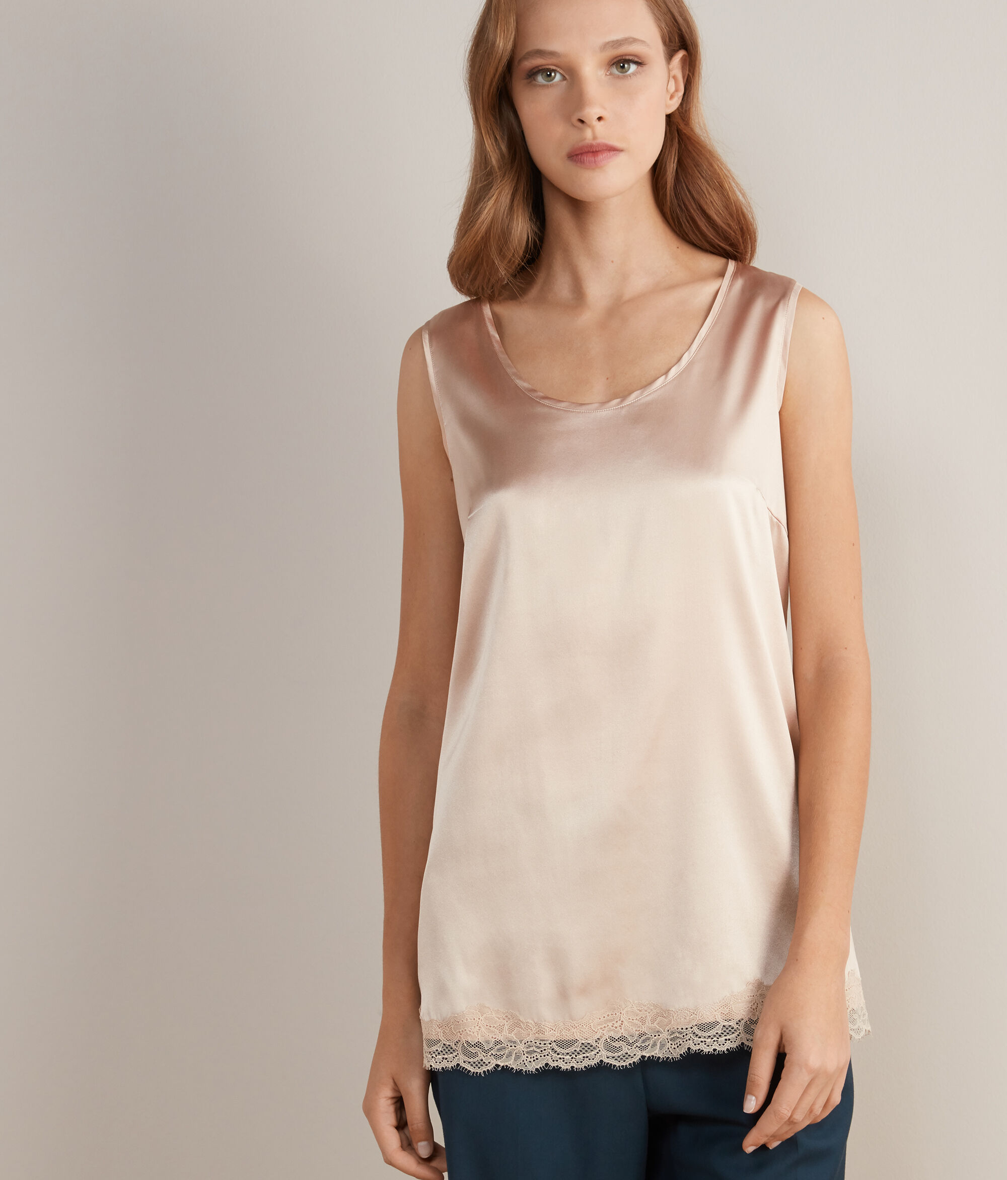 Canotta girocollo ampio, realizzata in delicata seta e caratterizzata da un inserto di raffinato pizzo sul fondo. È leggermente più corta sul davanti e presenta uno spacco centrale sul retro.