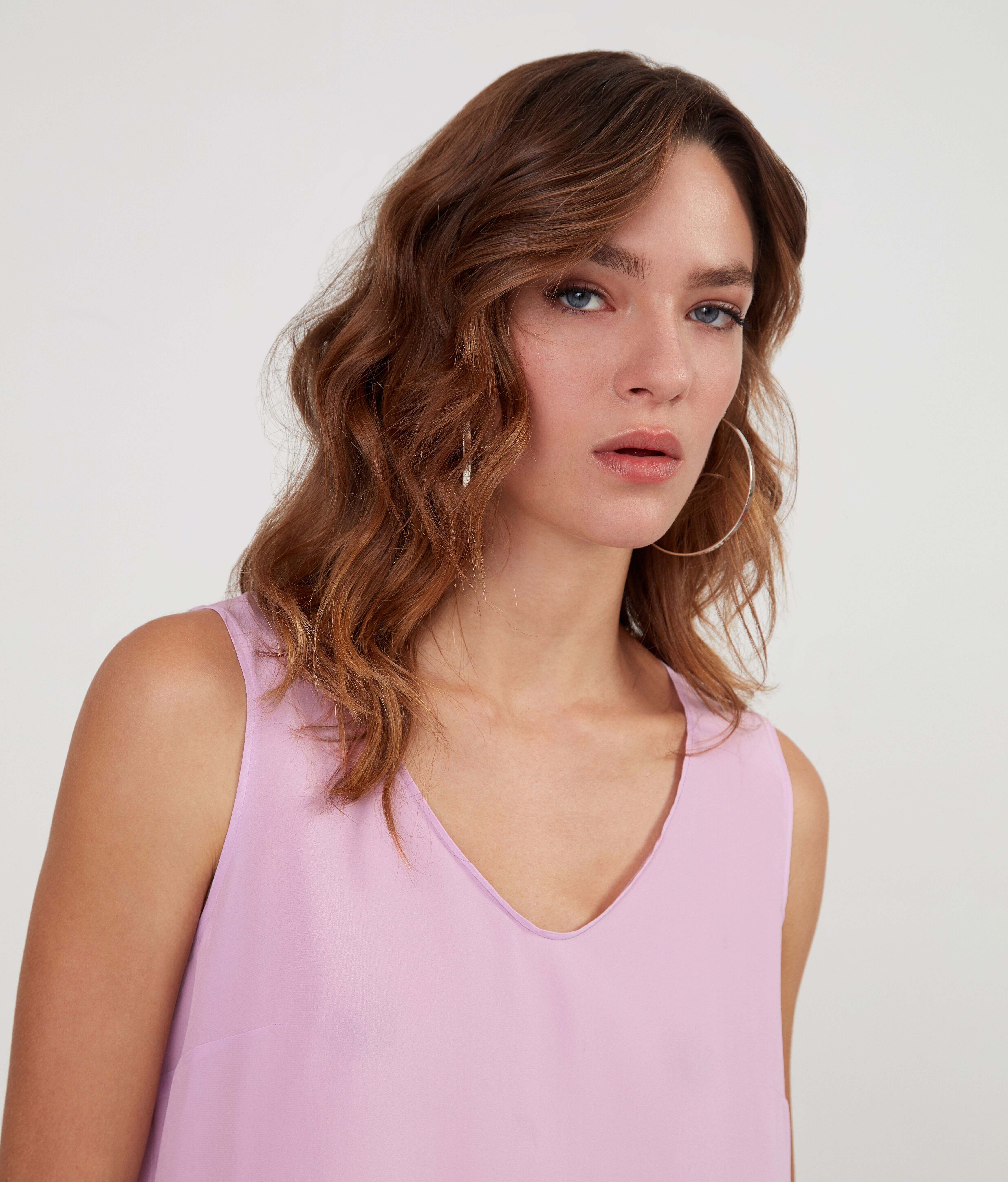 Sottogiacca smanicato a spalla larga con scollo a V stondato, realizzato in crêpe de chine. È caratterizzato da spacchetti laterali sul fondo. Capo passe-partout molto raffinato. Vestibilità regolare. La modella è alta 179 cm e veste una taglia MPetto: 88cm / Vita: 67cm / Fianchi: 94cm