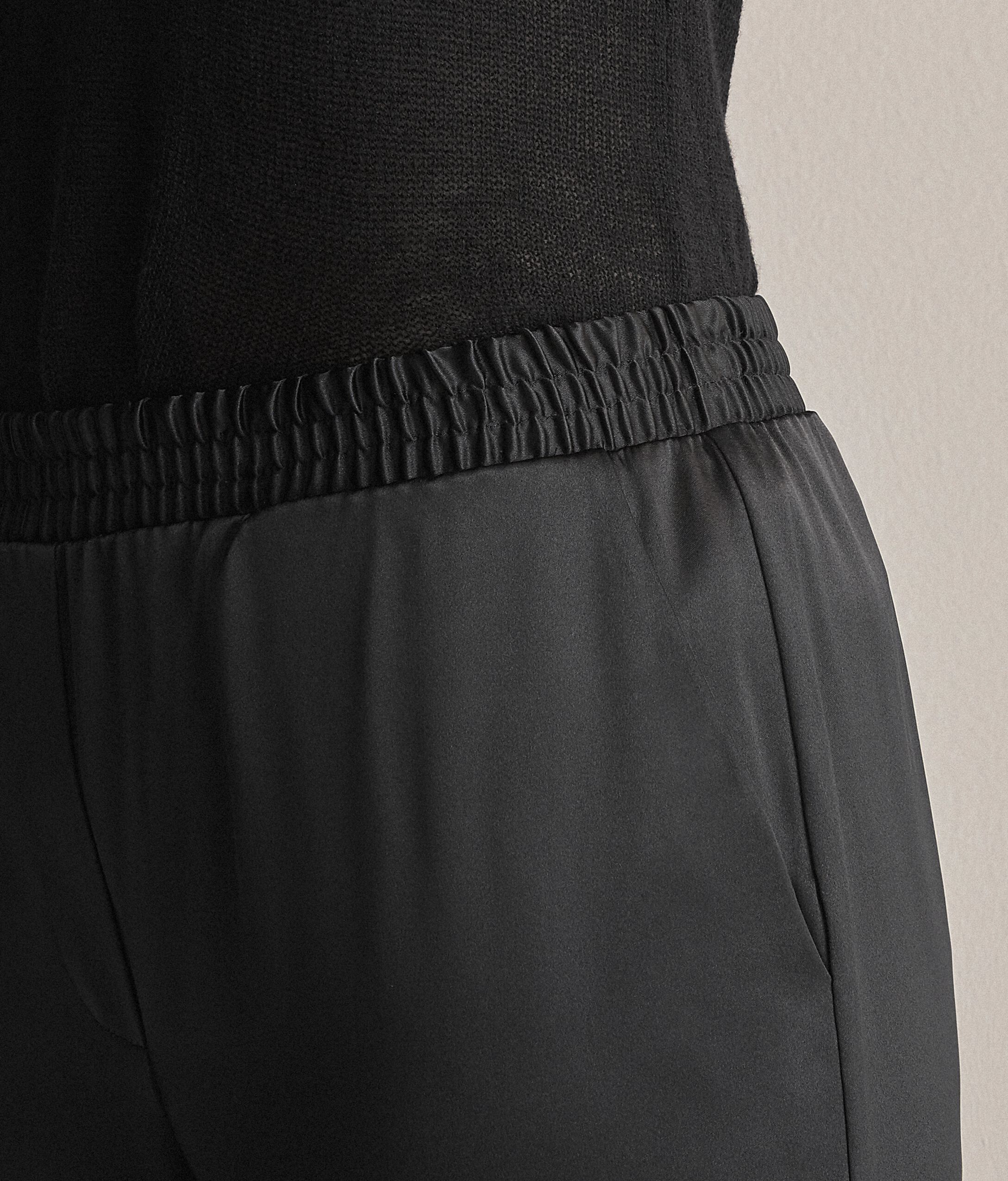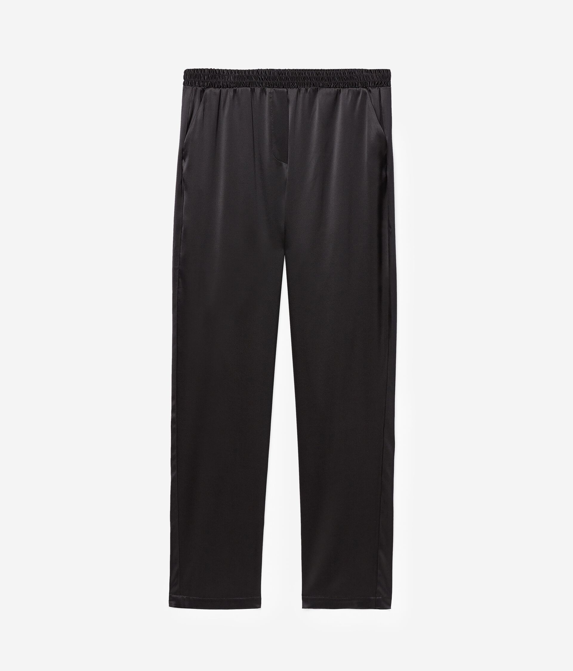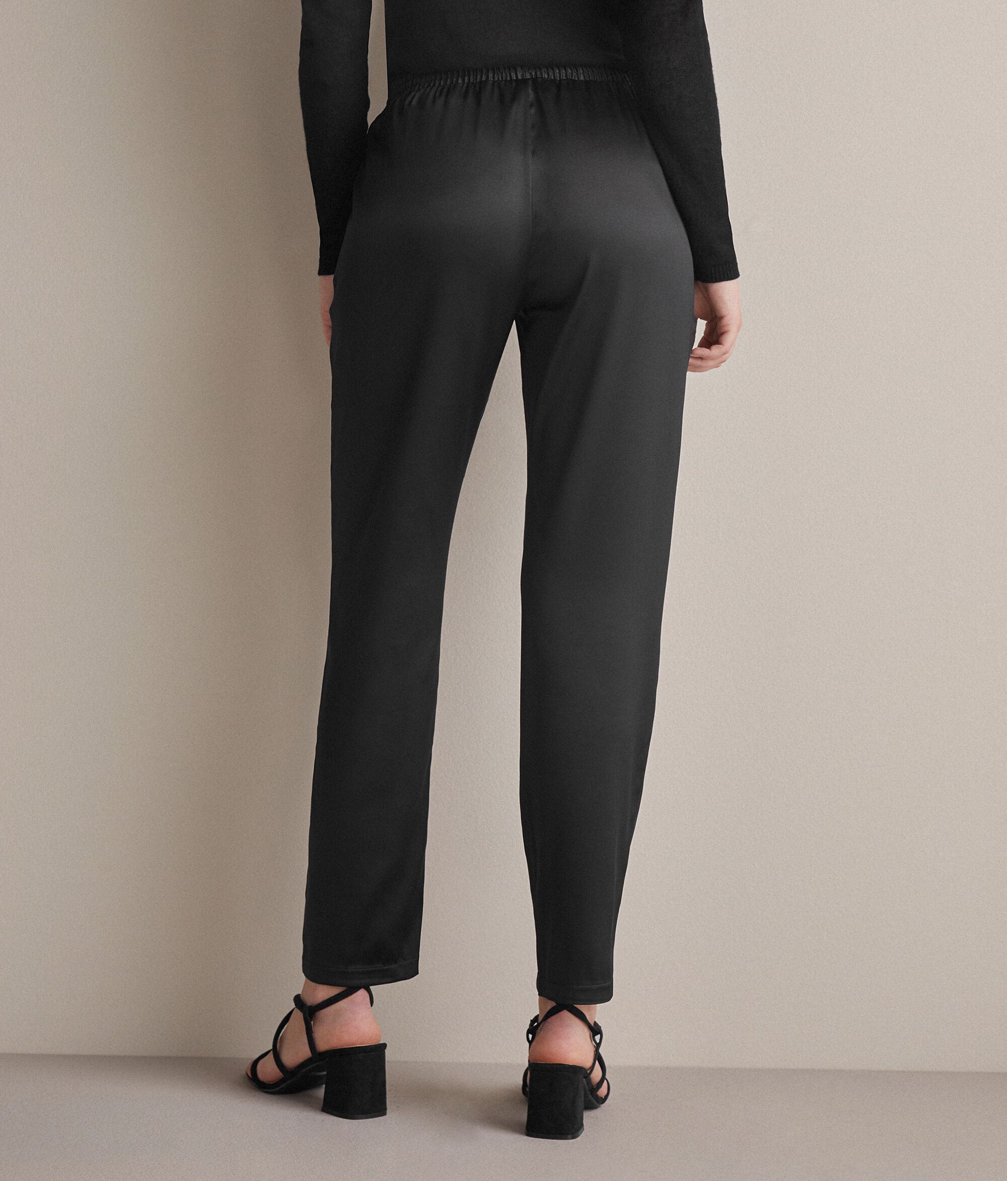 Pantalone realizzato in raso di seta con elastico in vita e tasche. Vestibilità a sigaretta. Perfetto se abbinato alla giacca DCL406A. La modella è alta 179 cm e veste una taglia M Petto: 88cm / Vita: 67cm / Fianchi: 94cm