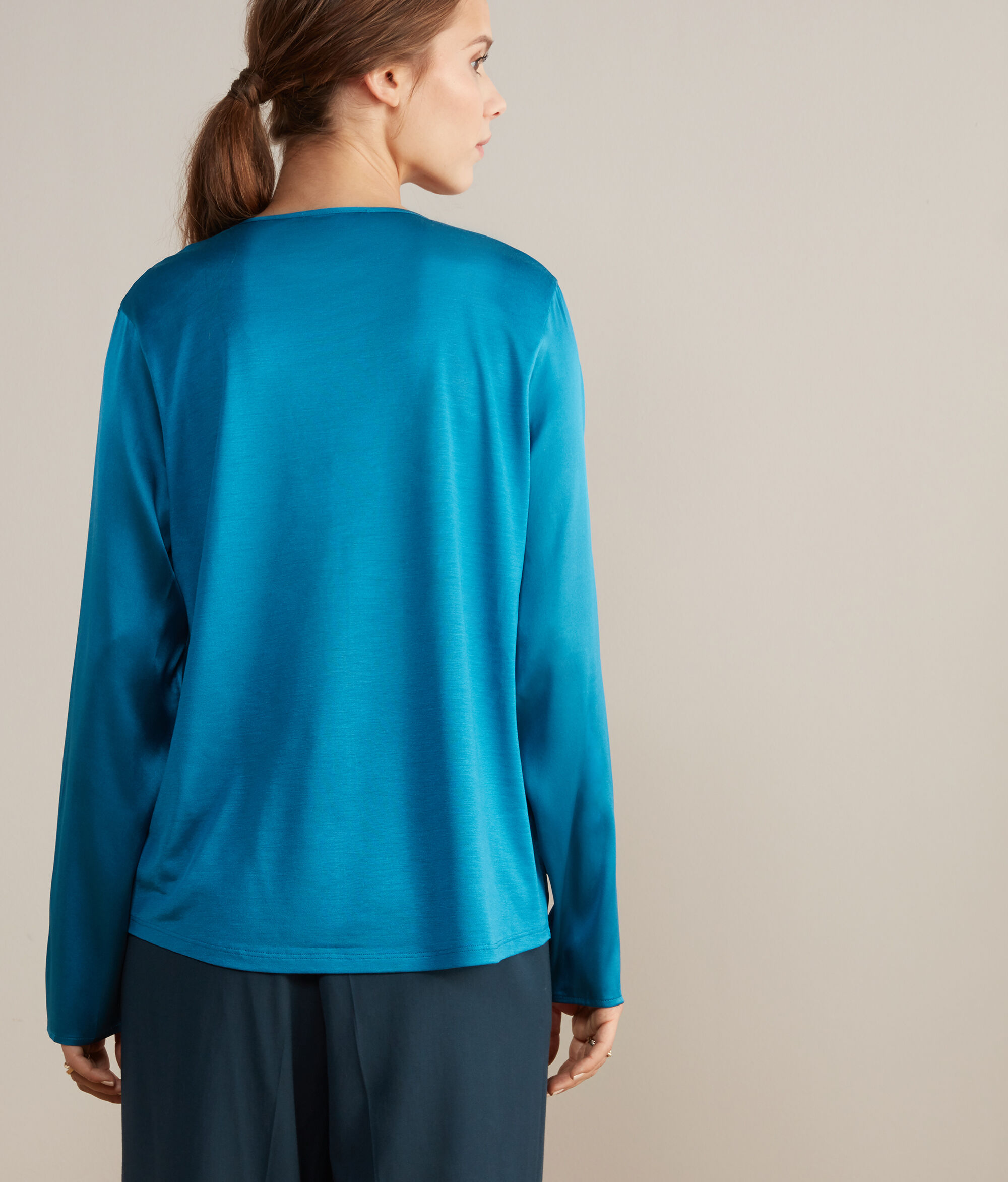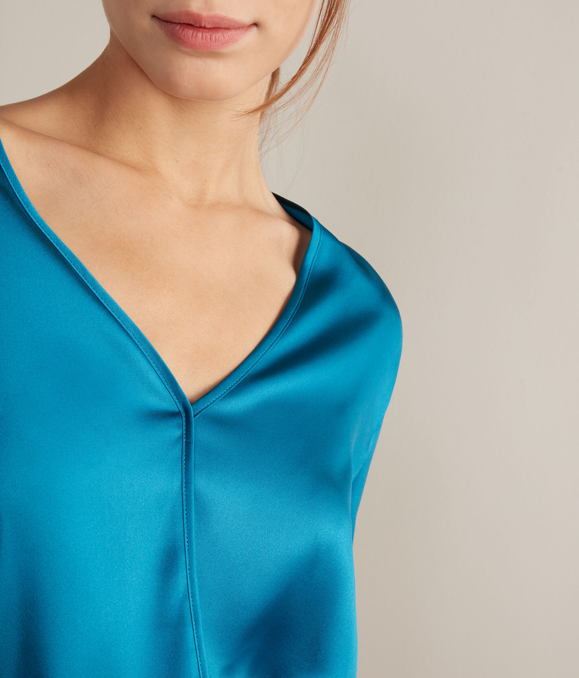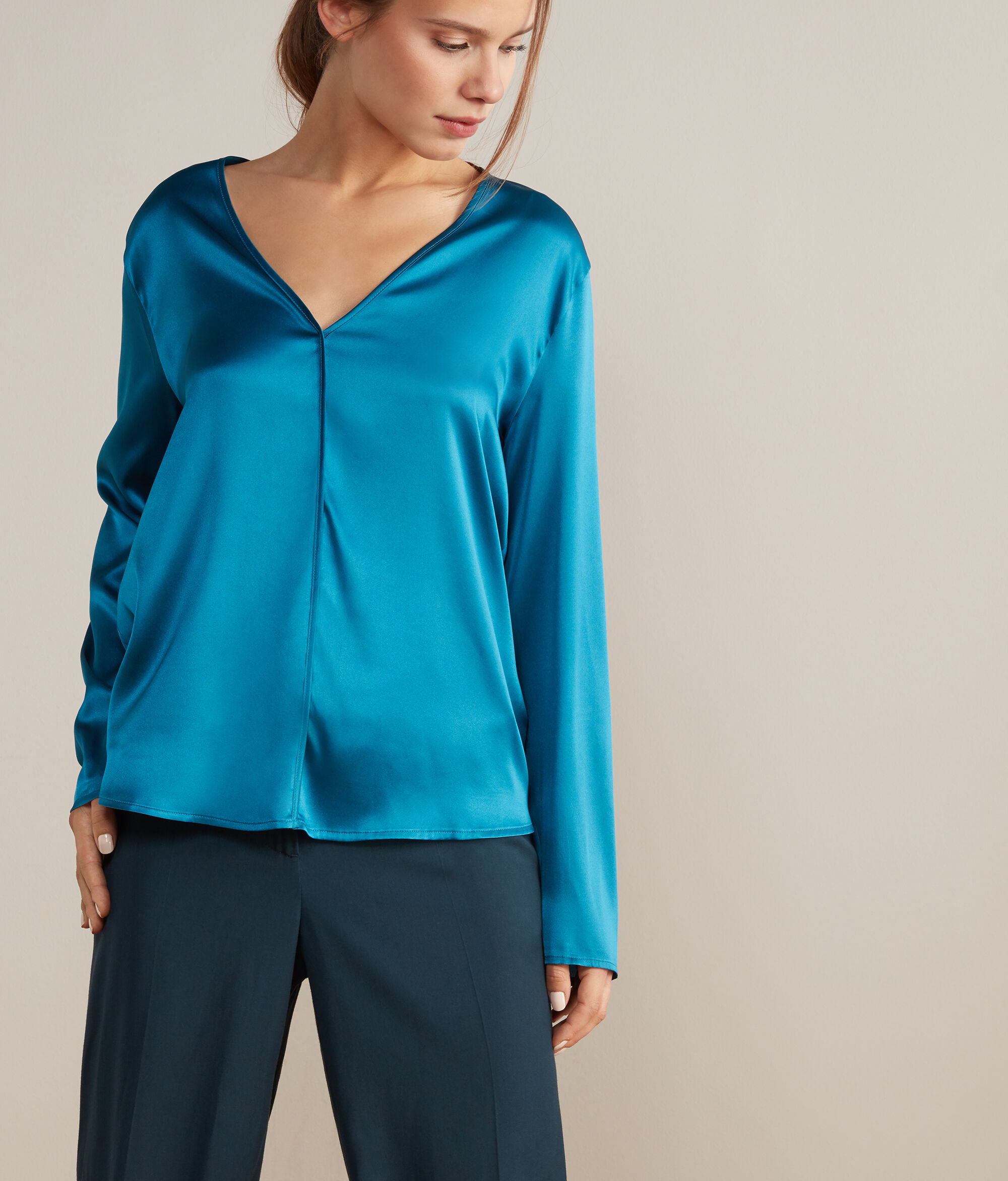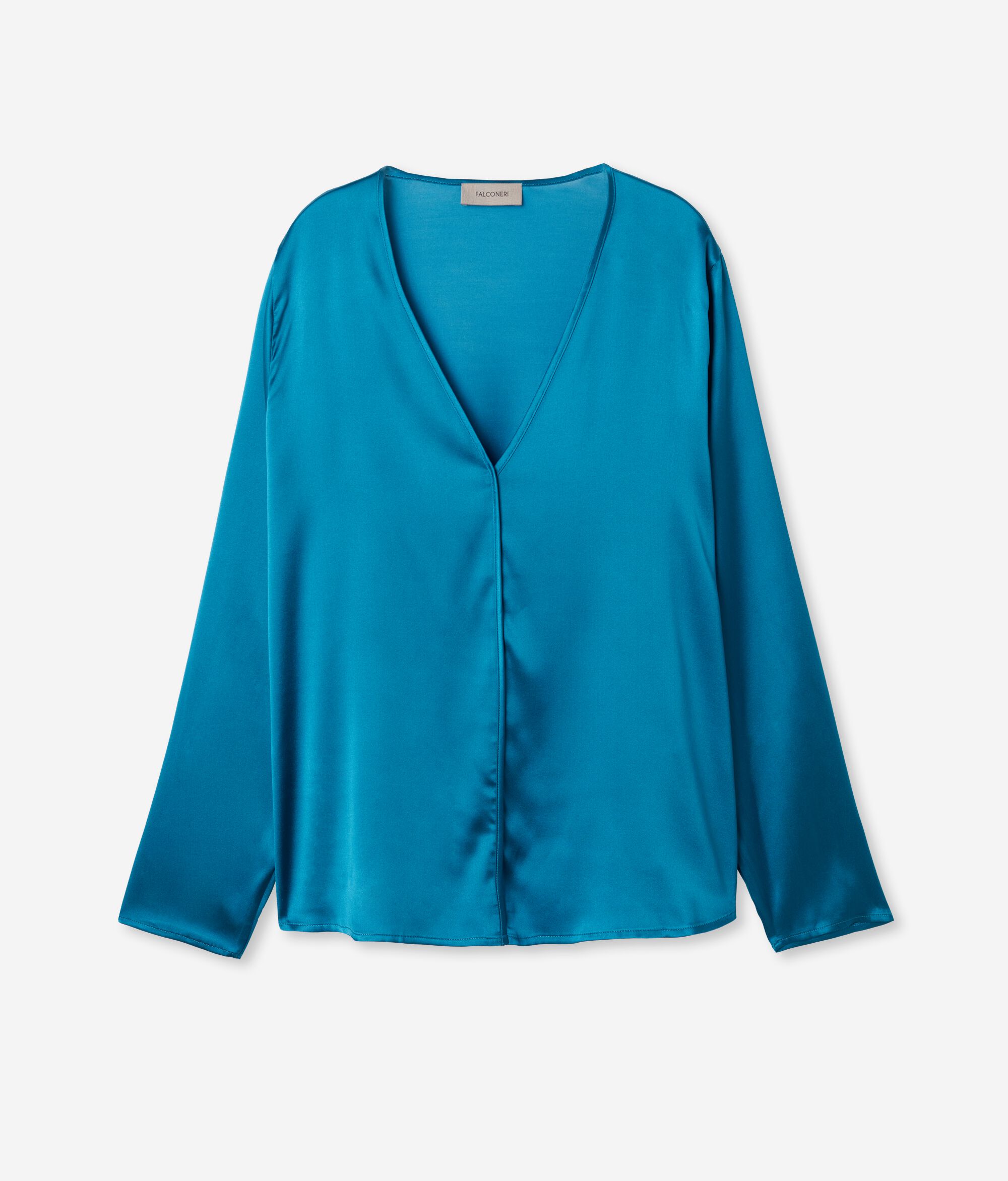 Il dettaglio delle cuciture a vista valorizza il pregio della seta col suo tocco fluido ed arricchisce le forme essenziali della nuova blusa Falconeri, capo versatile e raffinato del guardaroba femminile.