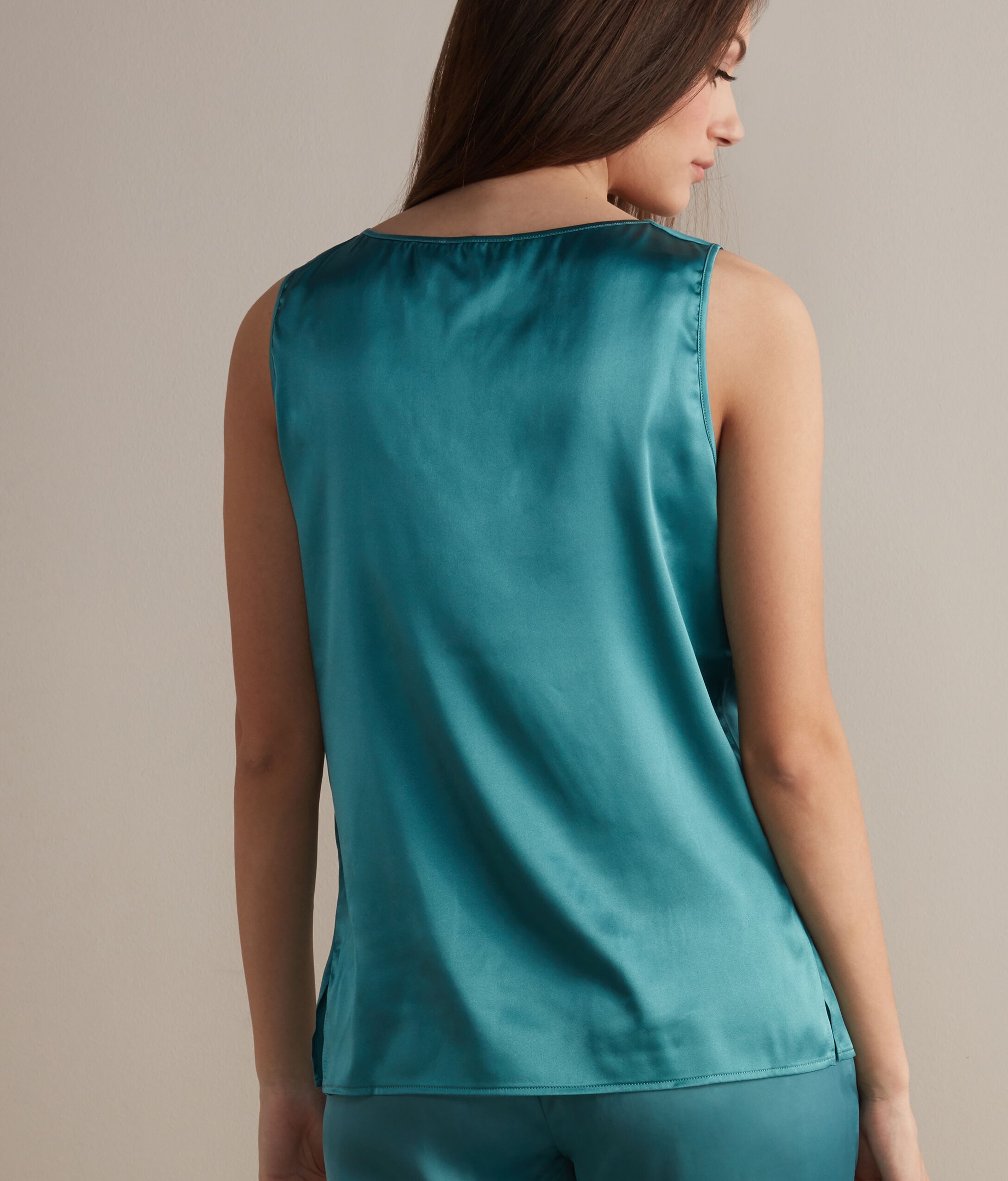 La texture lucente e fluida impreziosisce le linee morbide di questo top in pura seta e accende i colori del filato lavorato a raso, esaltandone la brillantezza. Un elegante scollo ampio a cuore armonizza i volumi e le lunghezze e disegna una femminile proposta per completare i look più sofisticati.