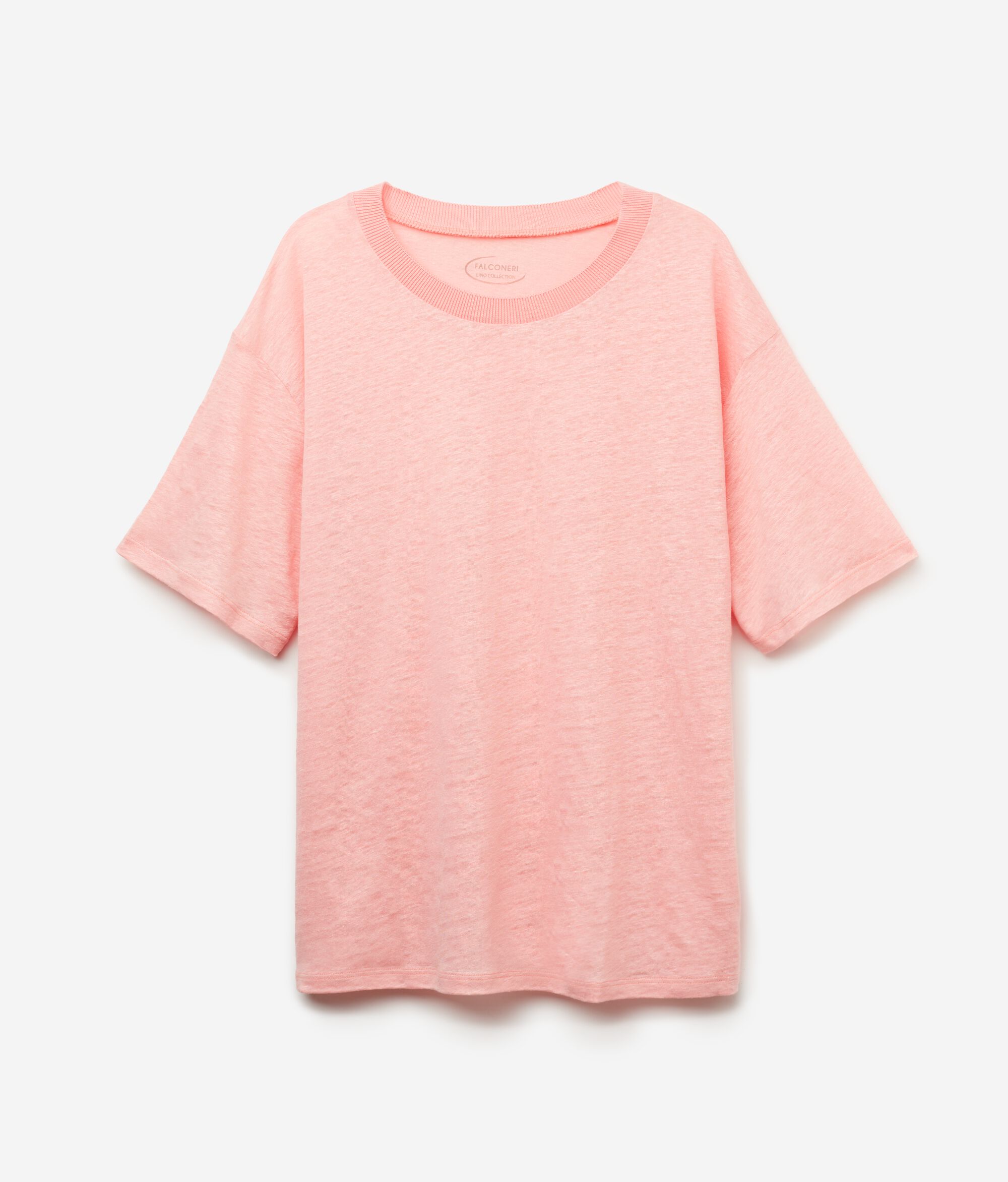 Capo essenziale e versatile per la stagione primaverile e le calde sere d'estate, la t-shirt in jersey di lino con girocollo si arricchisce dei dettagli di stile che connotano il brand Falconeri. Il bordo in maglia con lavorazione a costine che rifinisce lo scollo completa il capo con un dettaglio spiccatamente femminile.