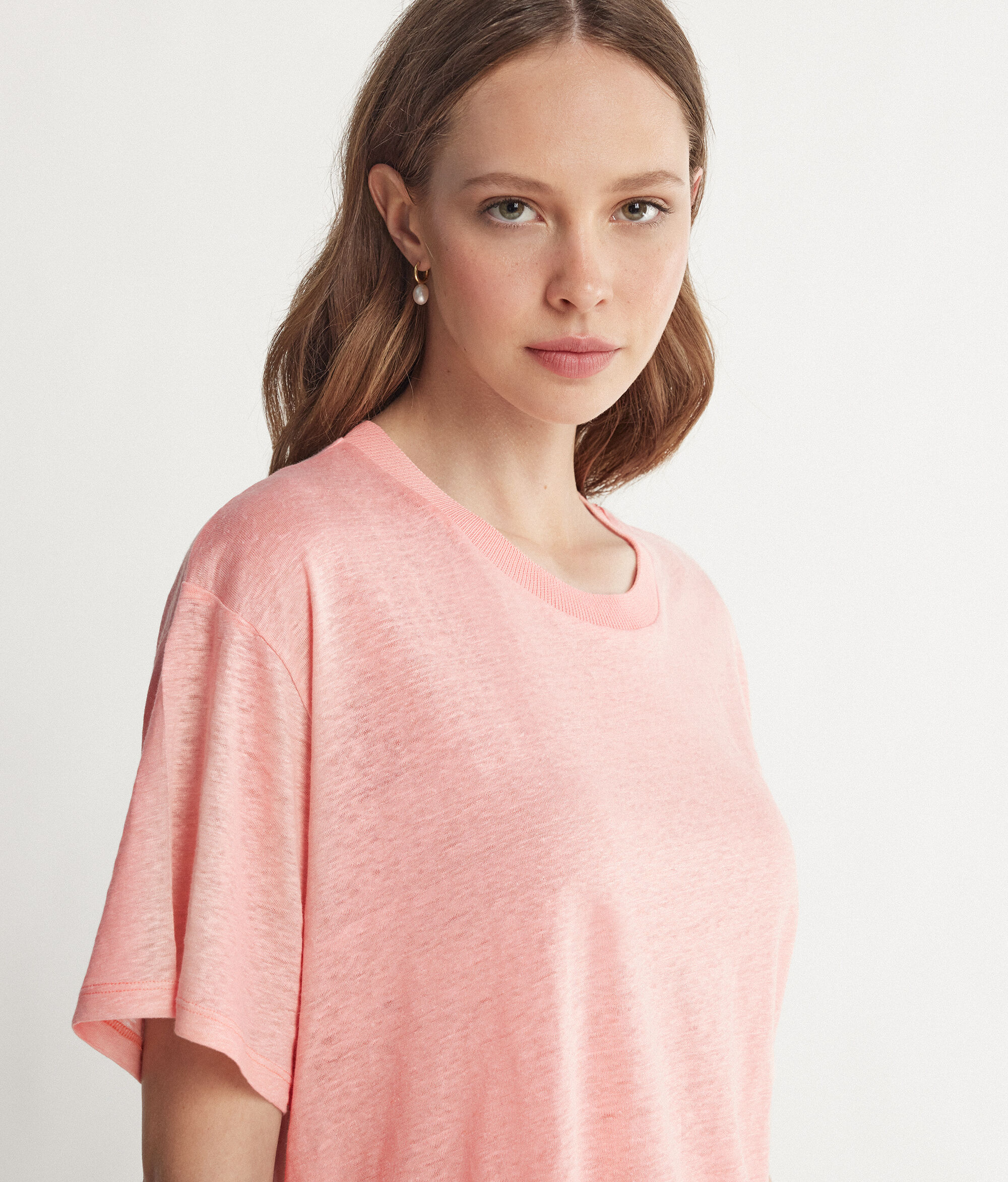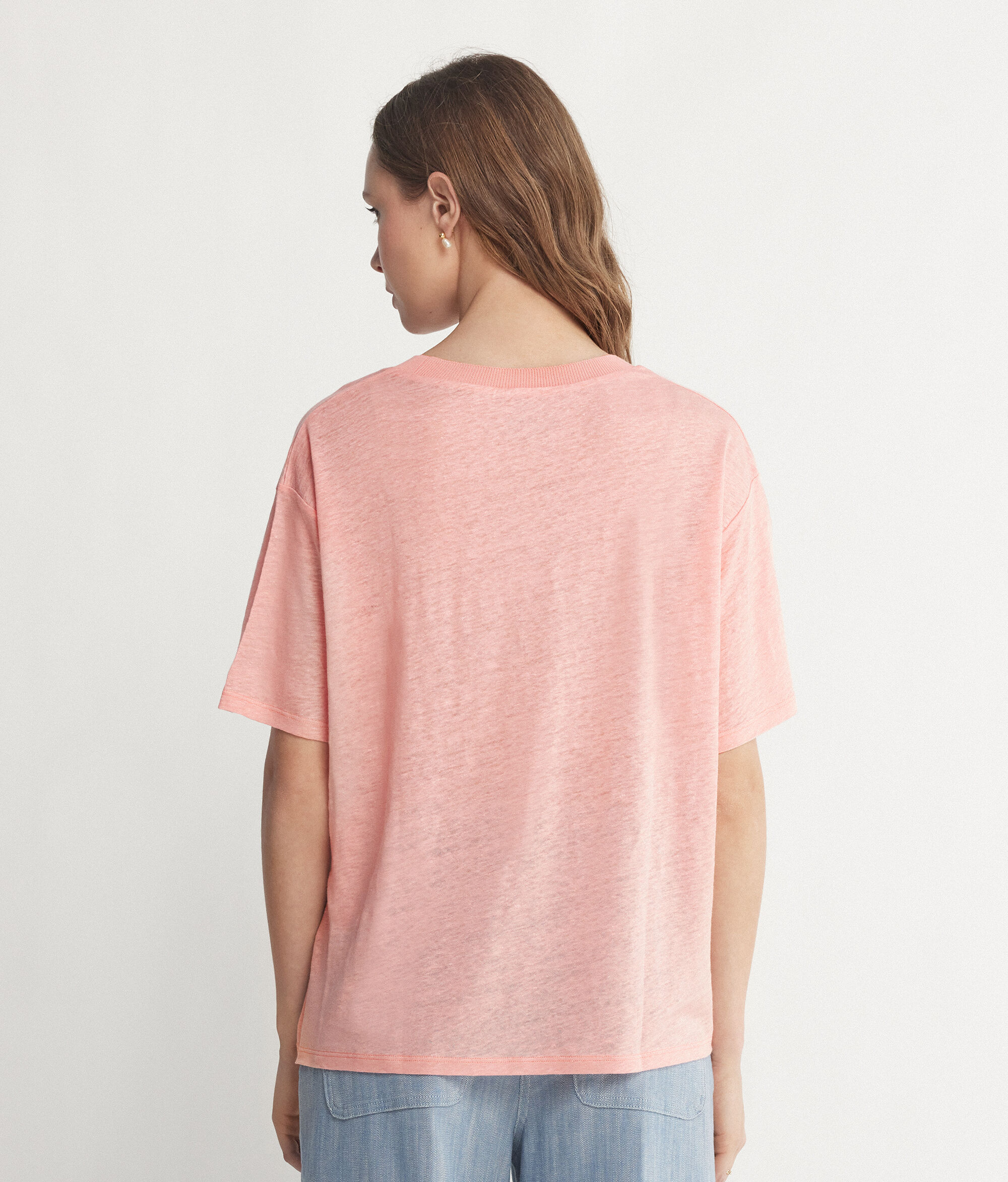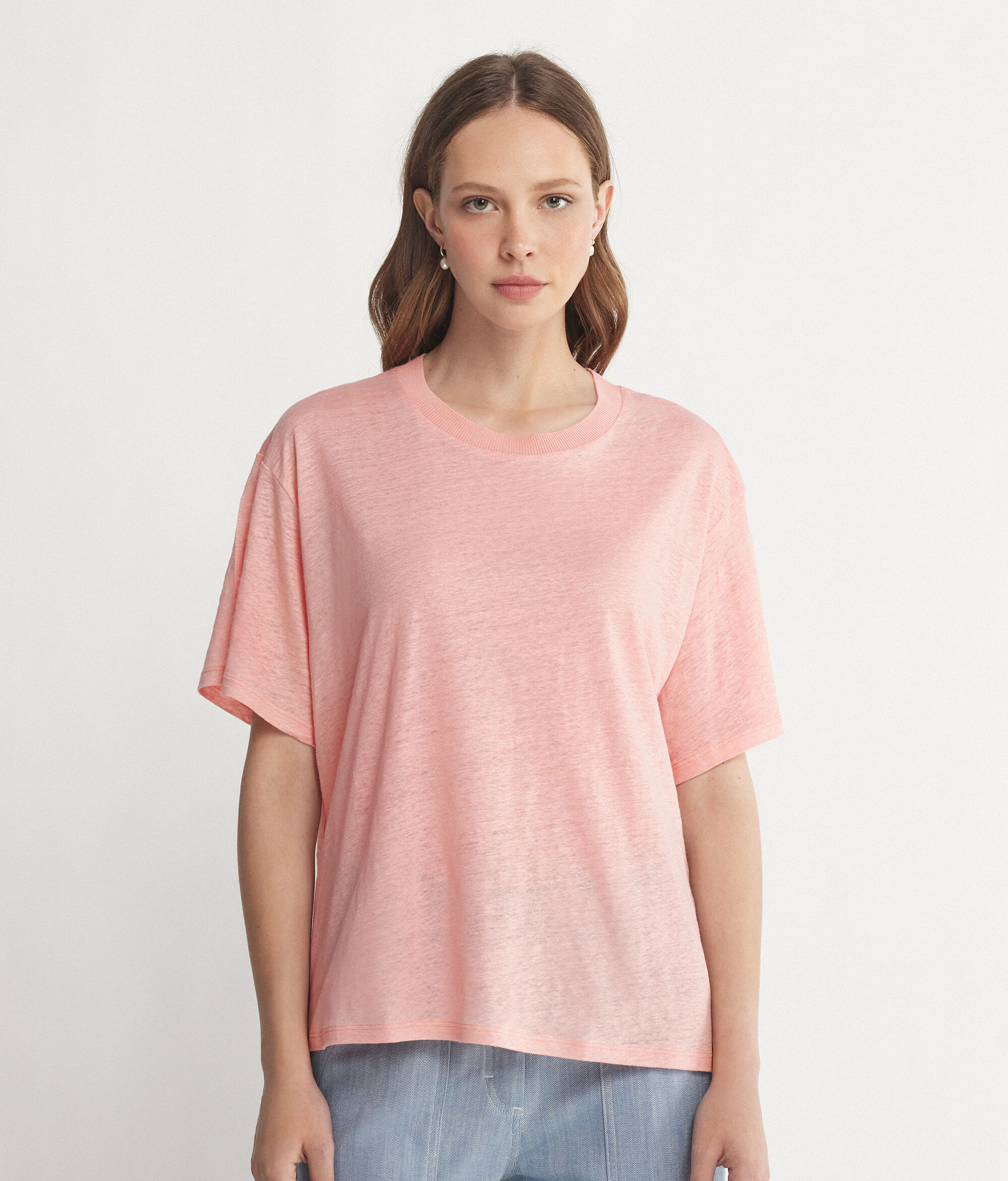 T-shirt Girocollo in Lino con Bordo in Maglia