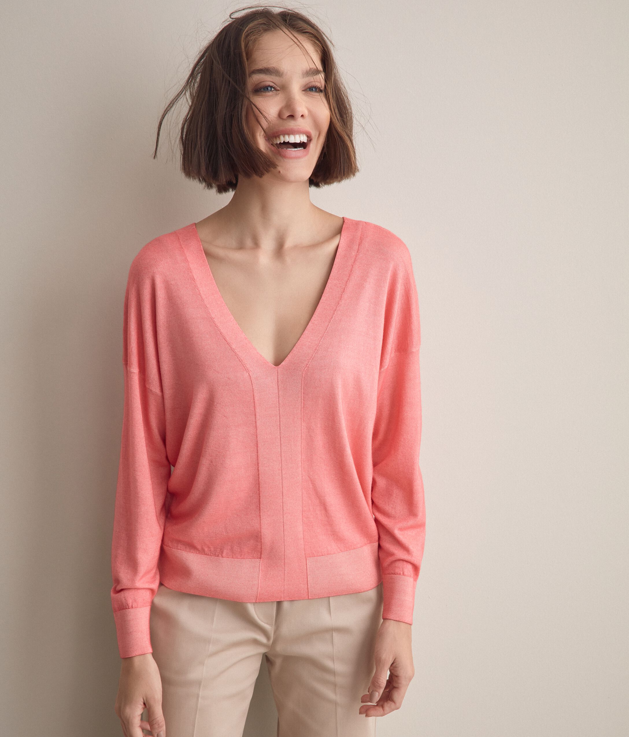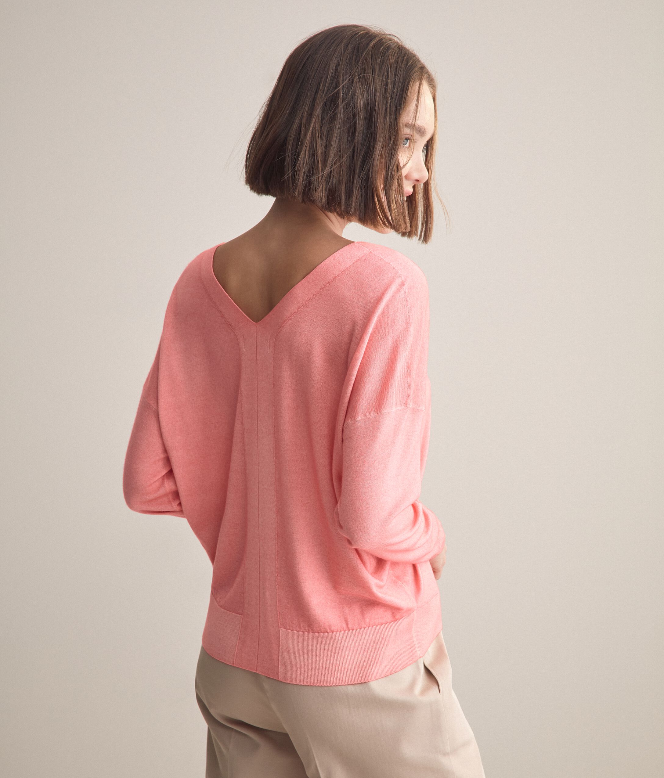 L'identità del brand si esprime nella pregiata scelta dei tessuti come il cashmere 2/50 e si evolve nella ricerca di volumi misurati con uno sguardo sempre attento ai dettagli di stile. Le forme morbide e pulite di questa maglia in puro cashmere sottolineano la simmetria di una pregiata lavorazione che disegna un'ampia scollatura anteriore a V ed accenna un misurato scollo posteriore.