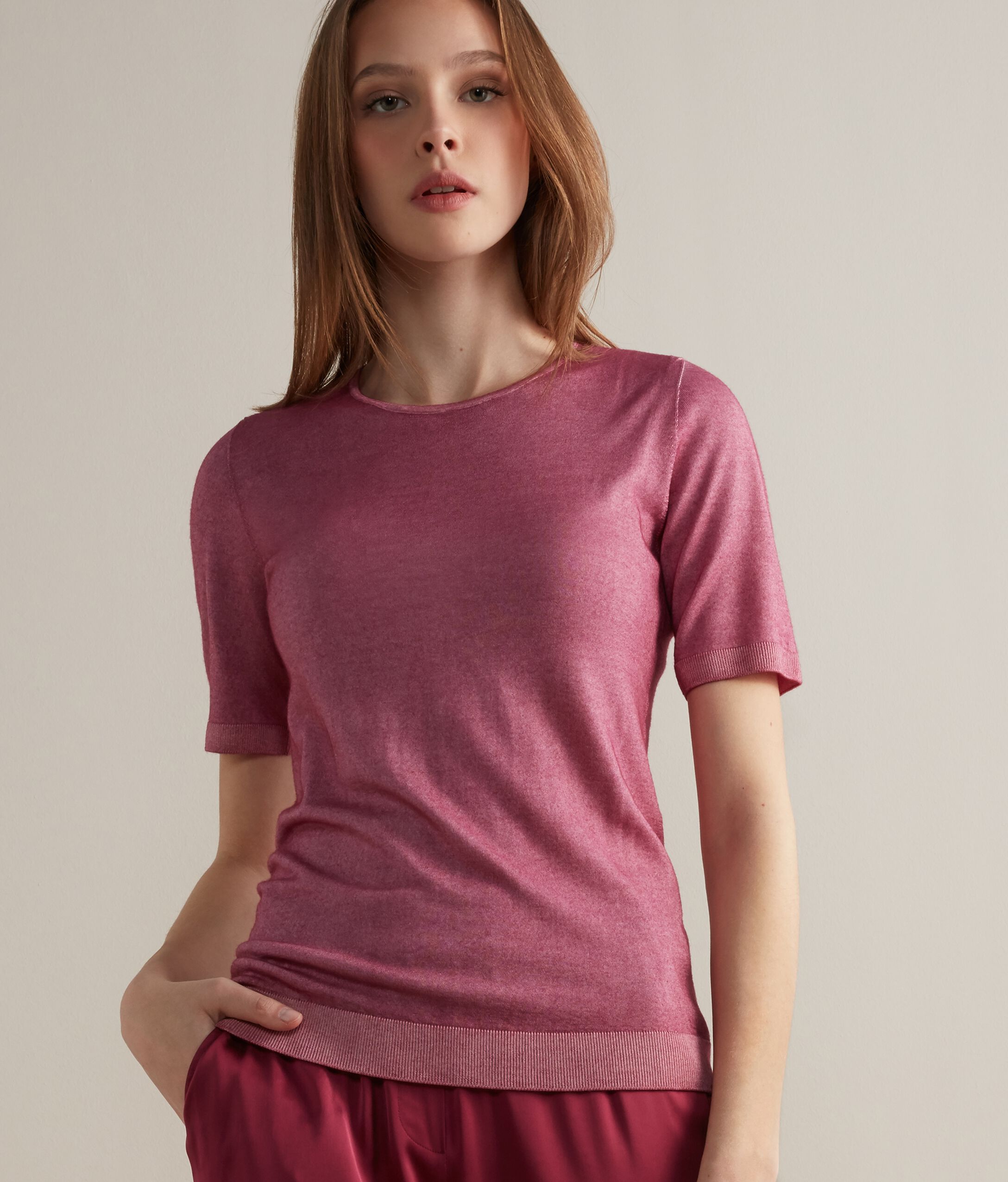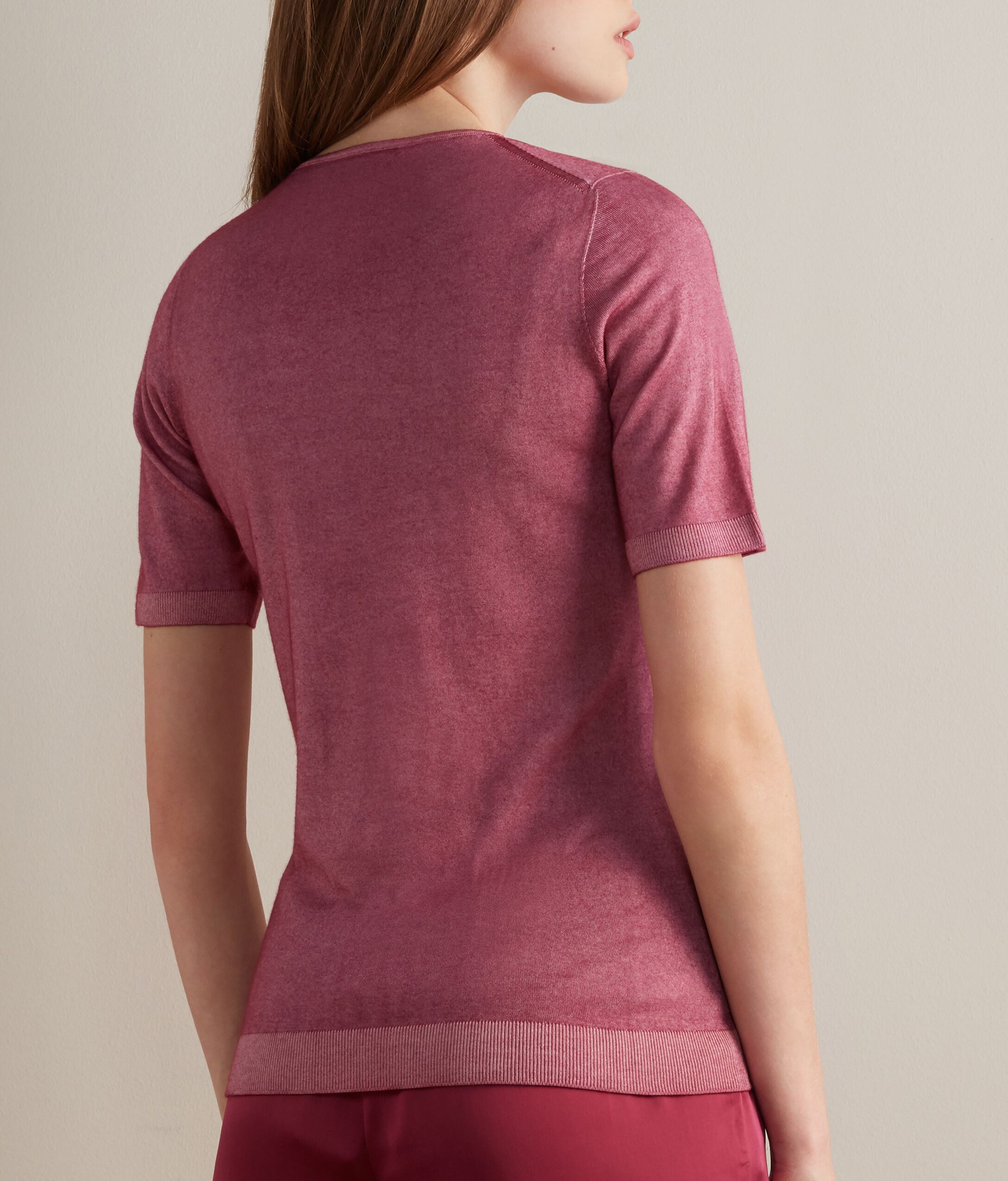 Maglia girocollo a manica corta, interamente realizzata in cashmere ultrafine senza cuciture. Vestibilità regolare. La modella è alta 179 cm e veste una taglia MPetto: 88cm / Vita: 67cm / Fianchi: 94cm