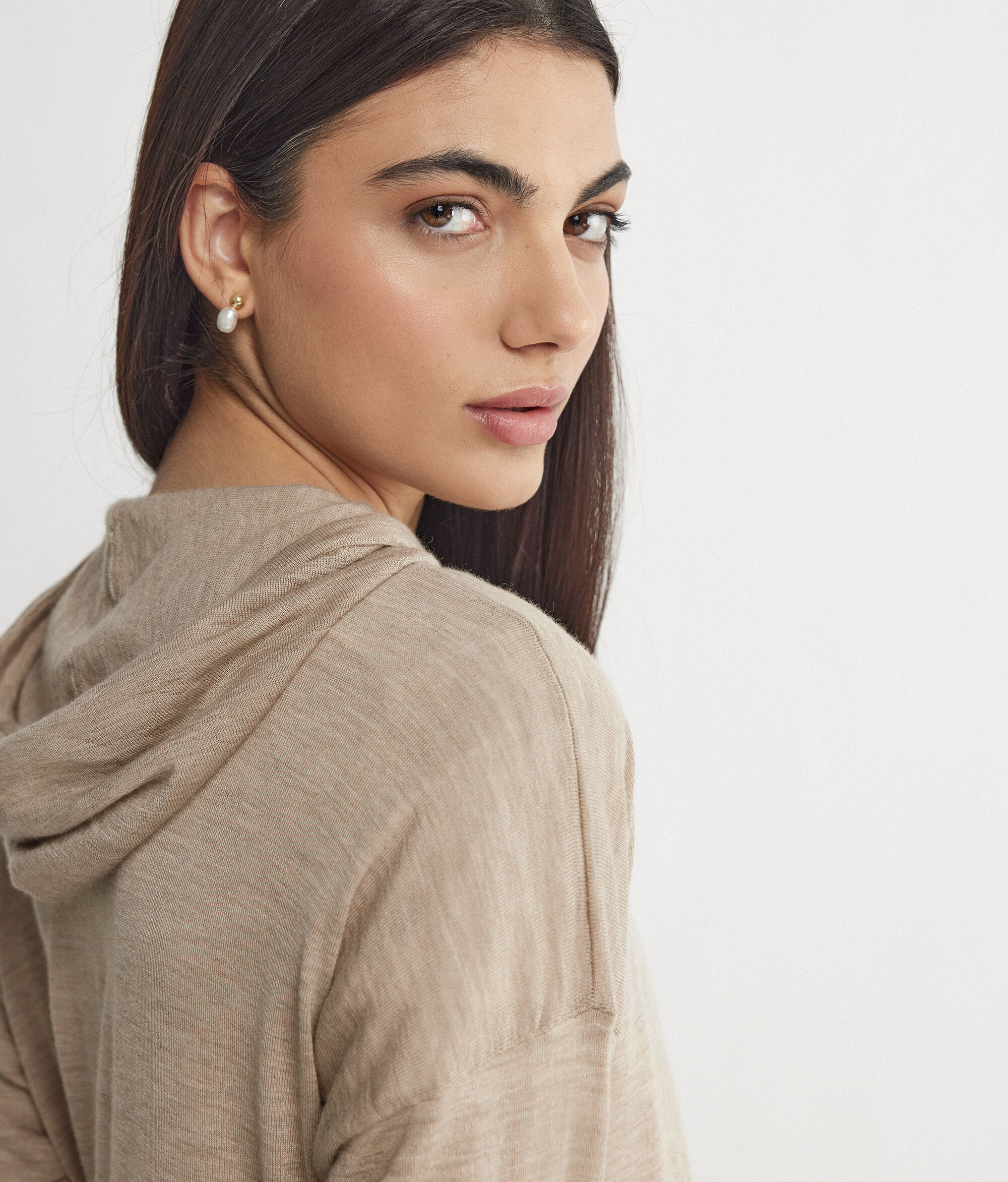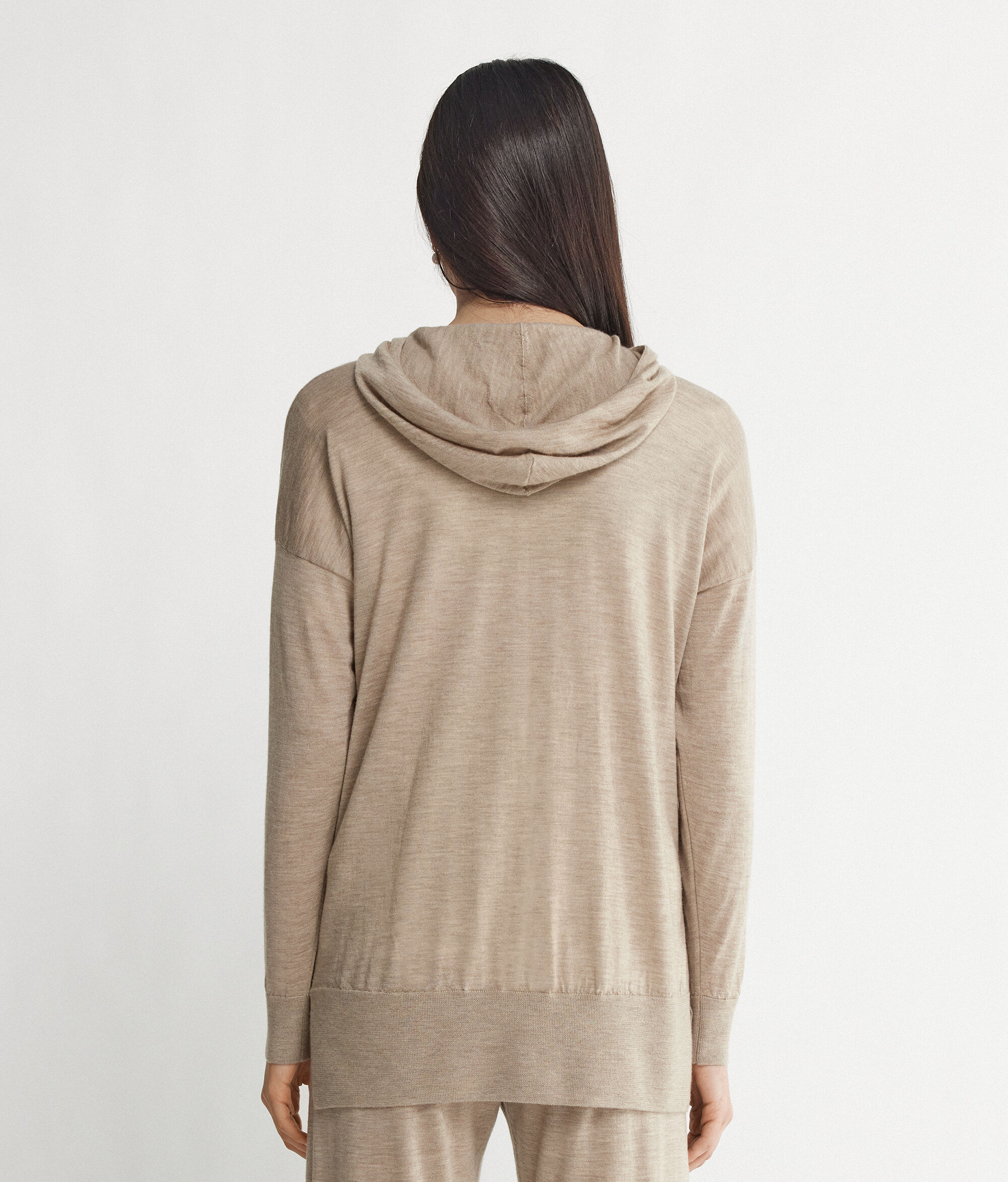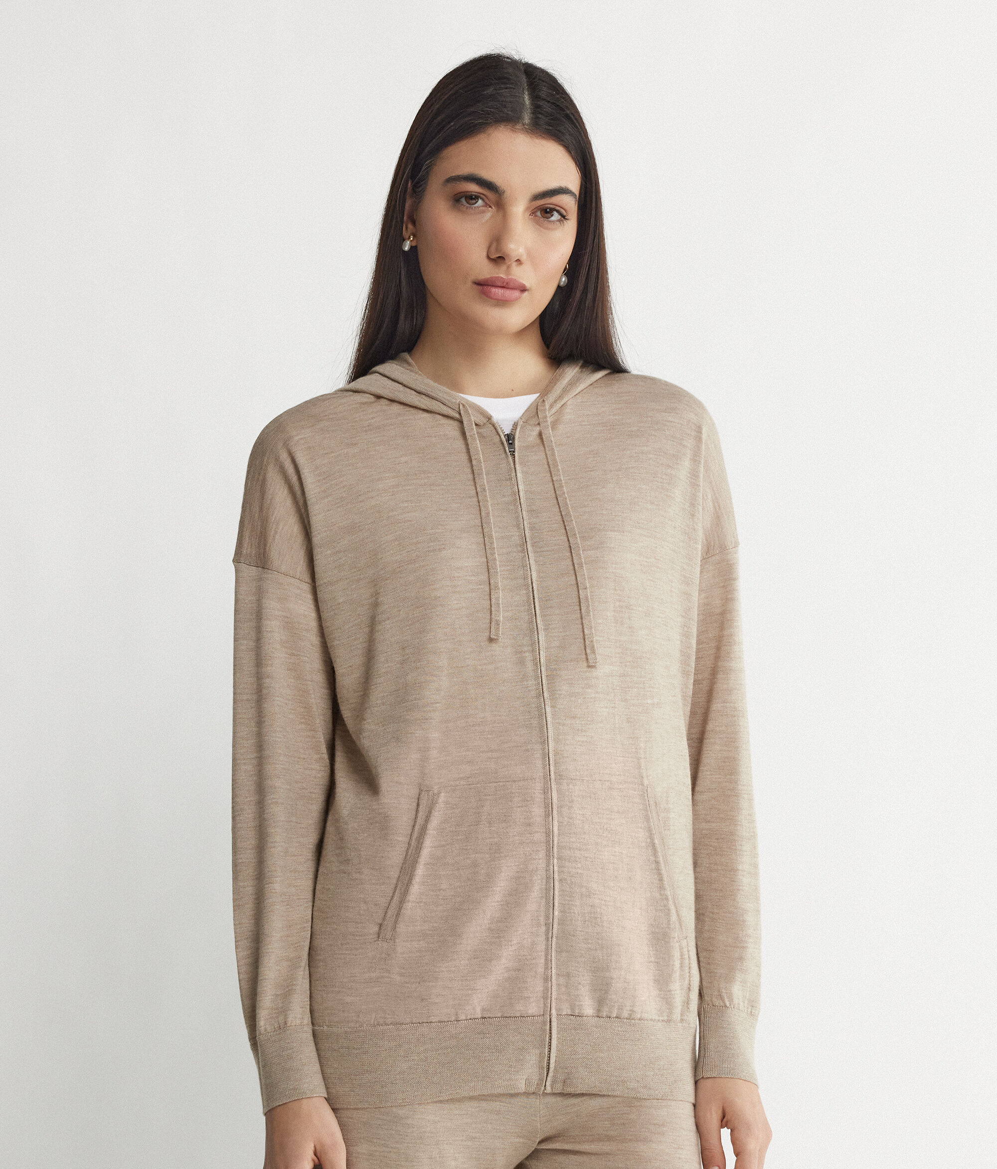 La felpa è realizzata in cashmere ultrafine a maniche lunghe ed è dotata di un cappuccio. Presenta un'apertura con zip fino al fondo, le spalle sono leggermente scese. La morbidezza del cashmere che la caratterizza ne conferisce una vestibilità morbida.