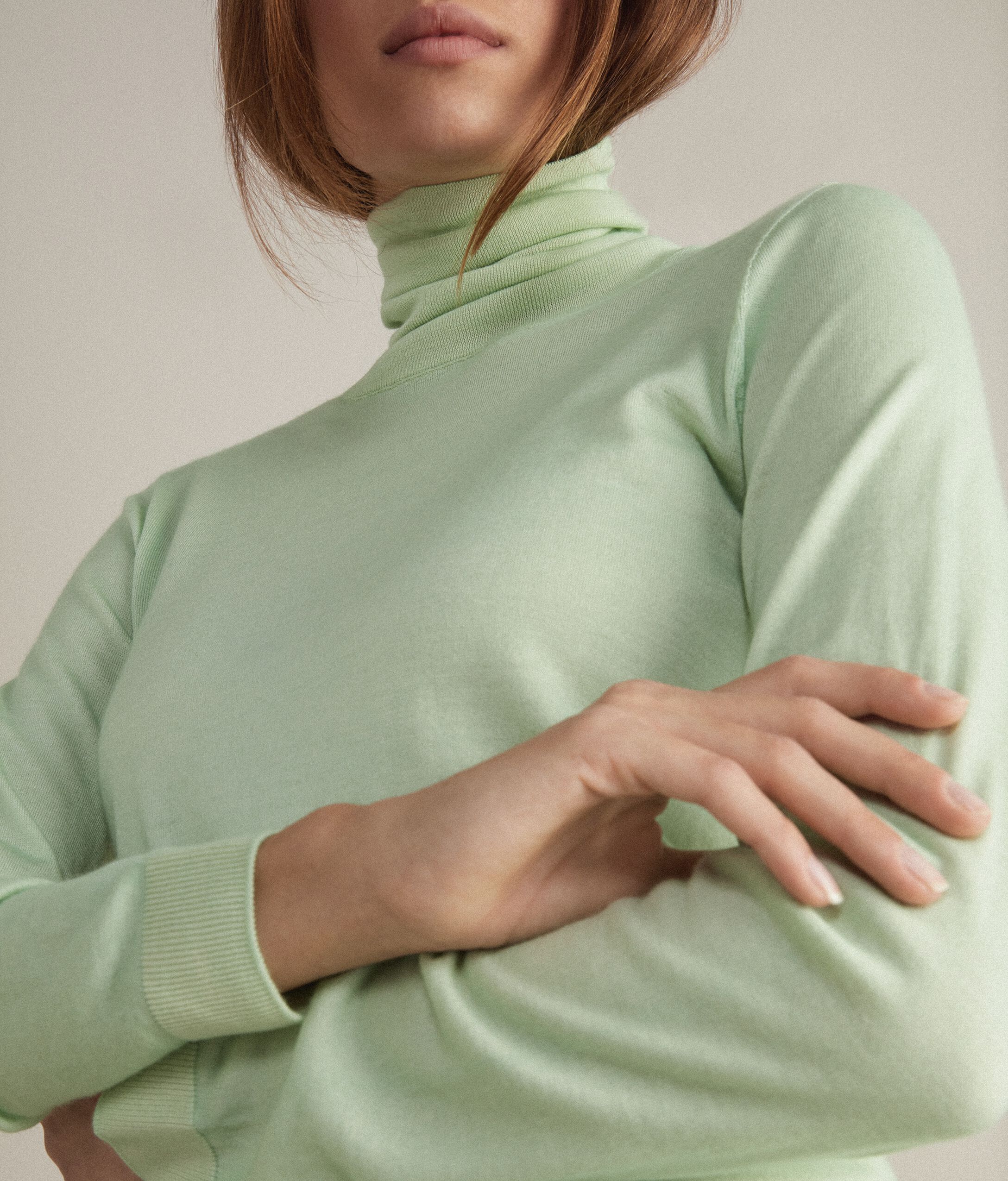 Maglia dolcevita a manica lunga interamente realizzata in cashmere ultrafine senza cuciture. Vestibilità regolare. La modella è alta 179 cm e veste una taglia MPetto: 88cm / Vita: 67cm / Fianchi: 94cm