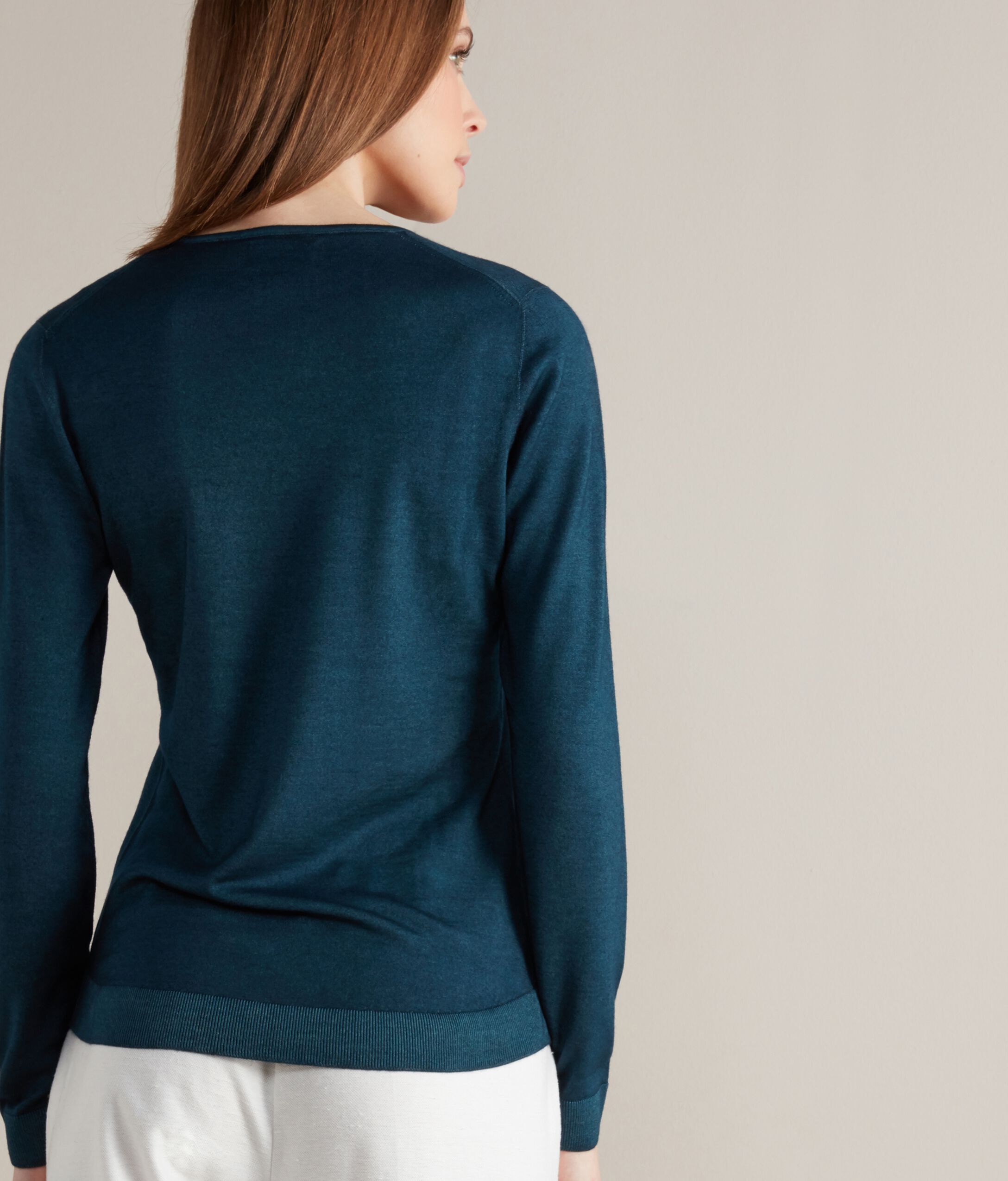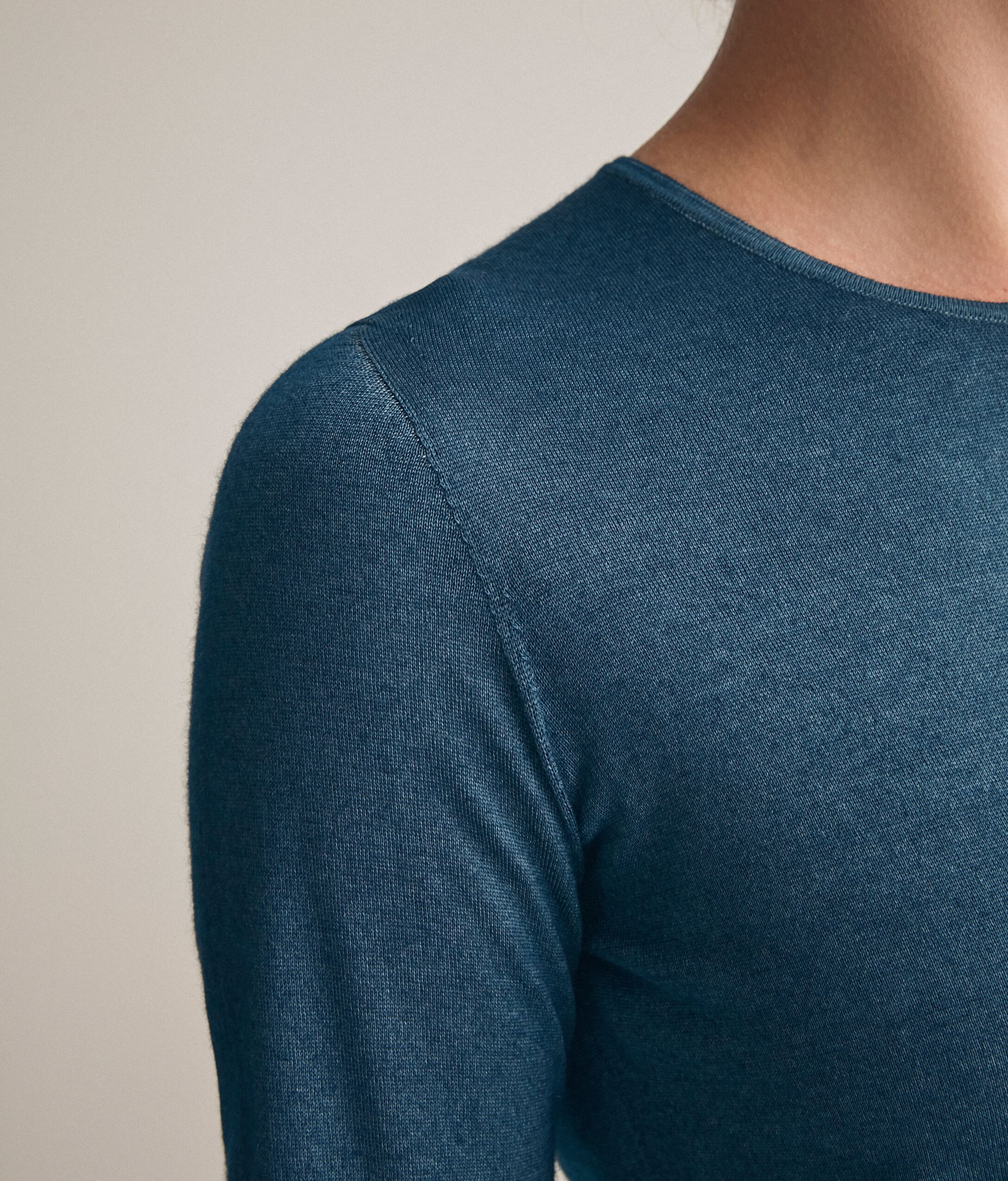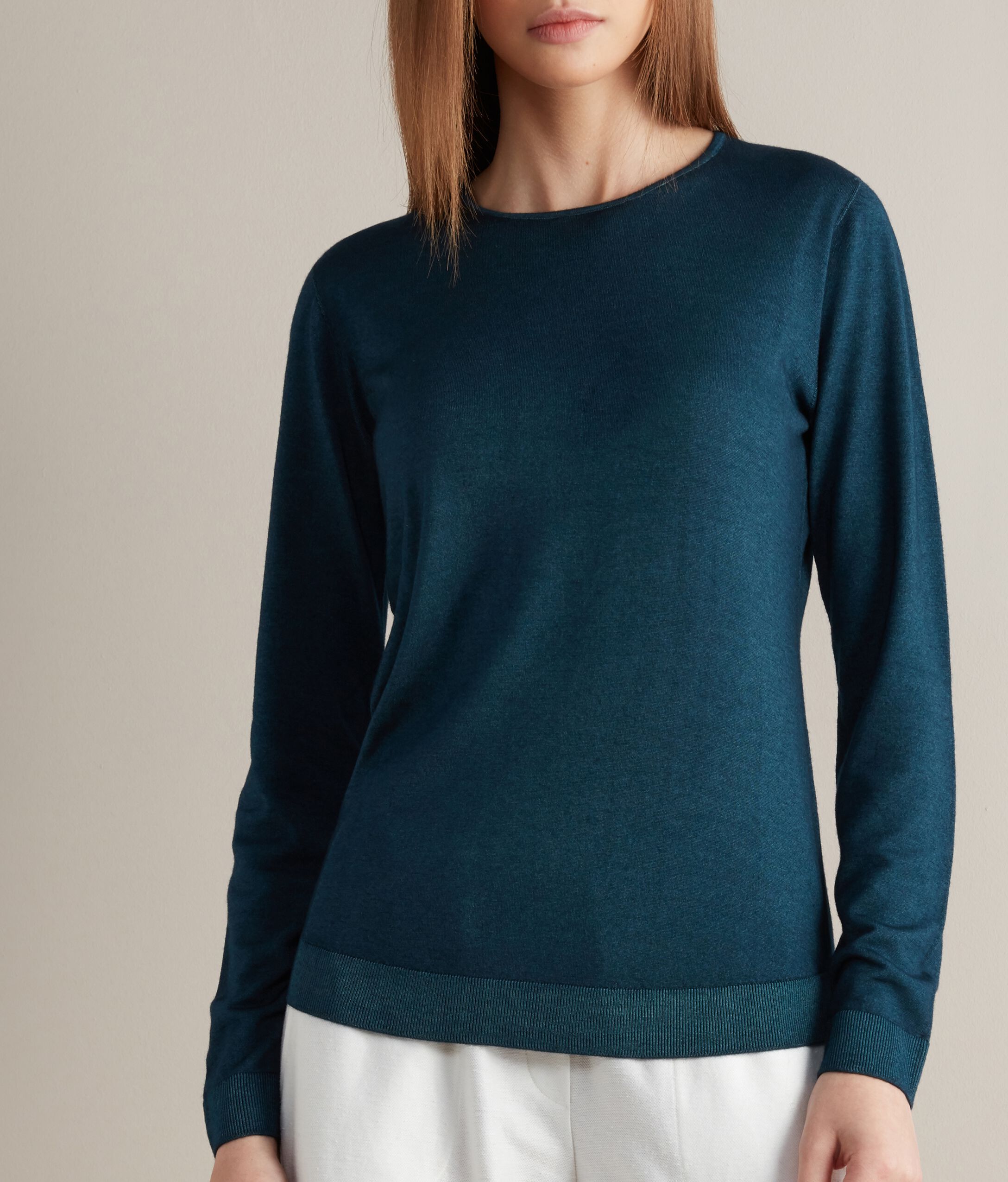 Maglia girocollo in cashmere ultrafine a maniche lunghe, con fondo leggermente arrotondato. Capo classico, perfetto come sottogiacca. Vestibilità regolare. La modella è alta 179 cm e veste una taglia MPetto: 88cm / Vita: 67cm / Fianchi: 94cm