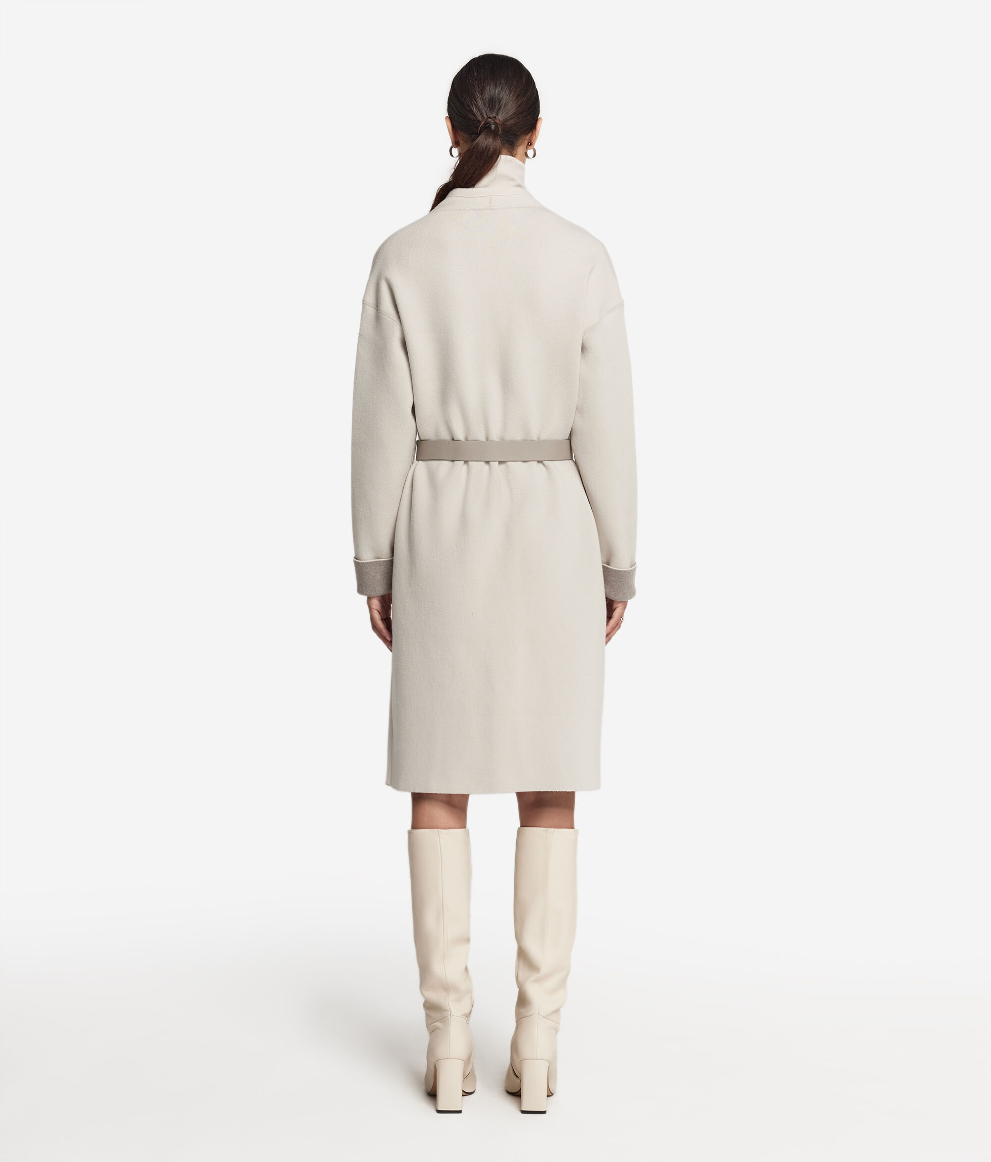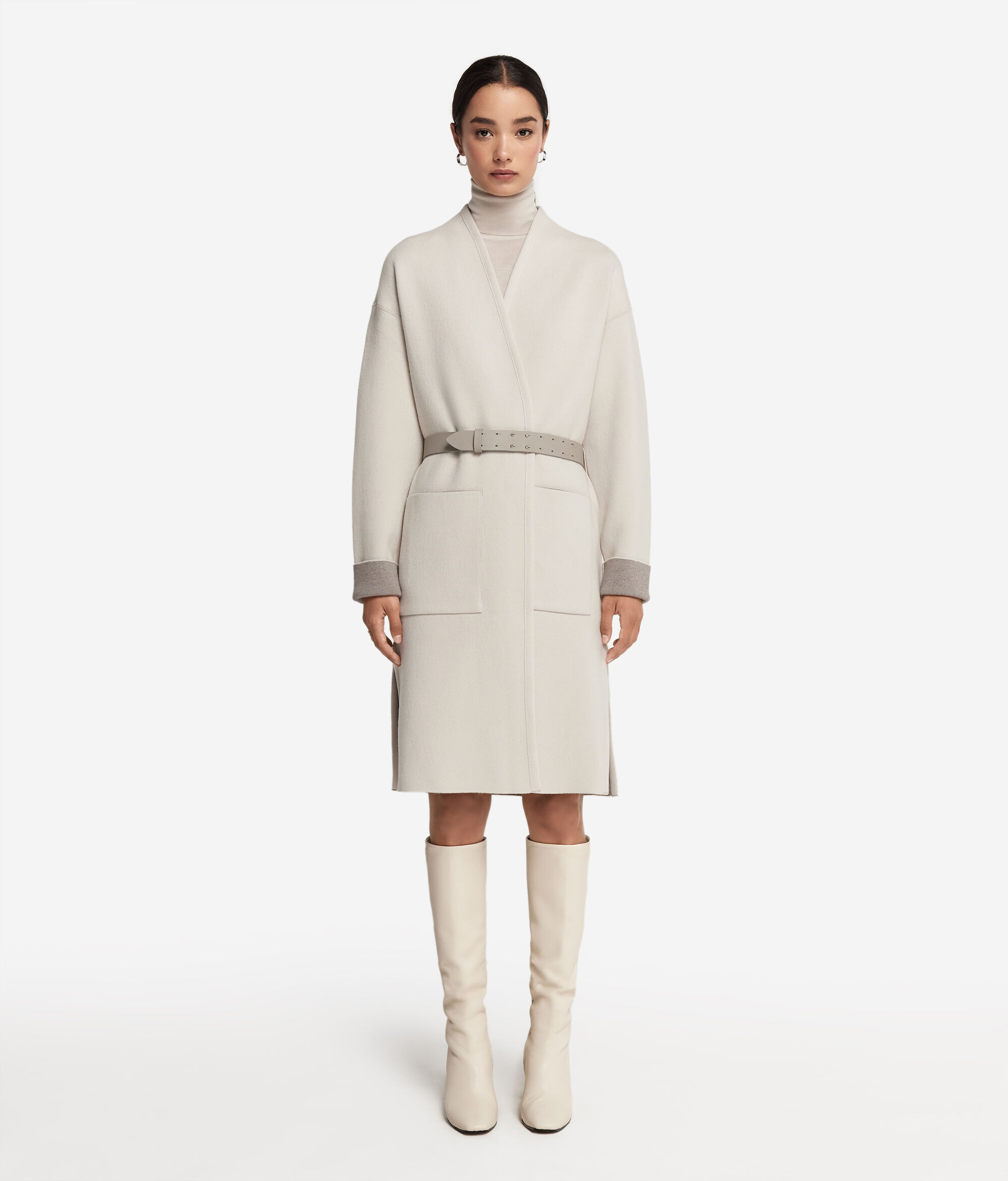 Un cappotto double face che interpreta il gusto di uno stile elegante e ricercato, un capo che esalta le finiture sartoriali attraverso l'utilizzo del puro cashmere e ne valorizza le linee con l'aggiunta in vita di una cintura in pelle.