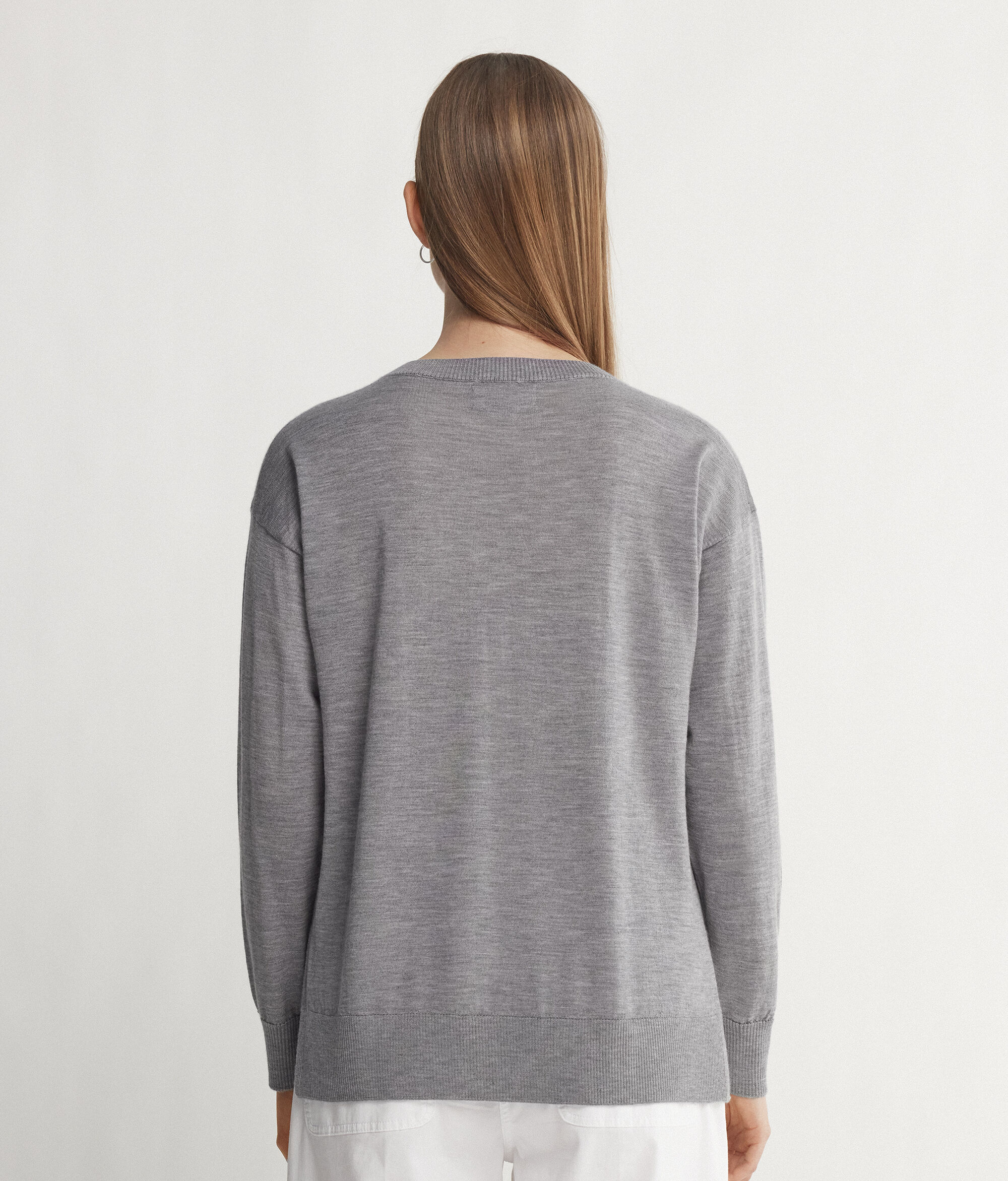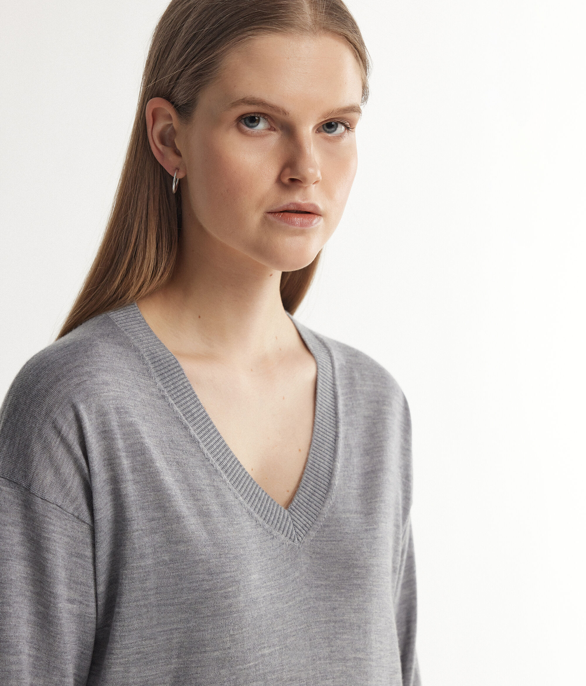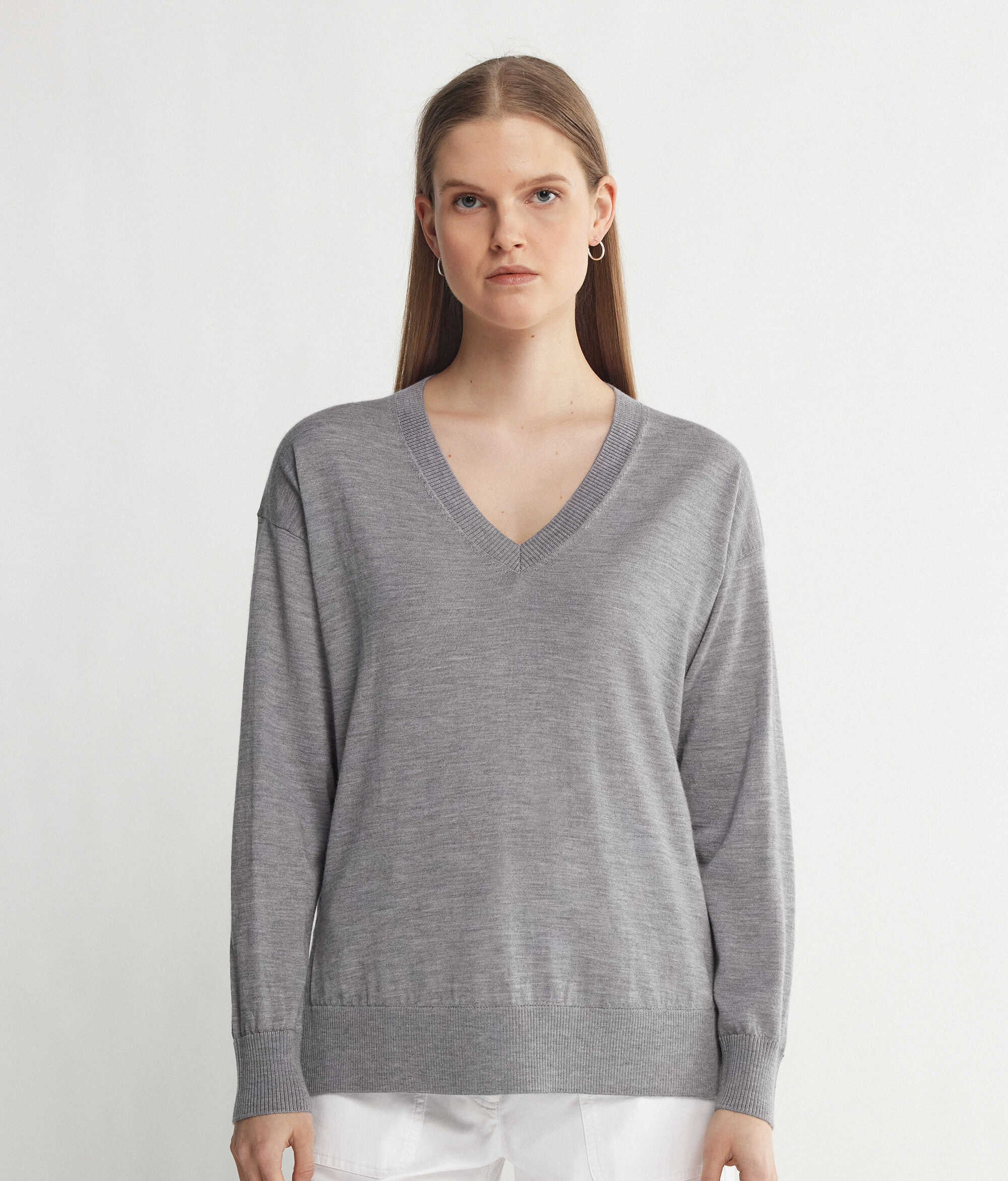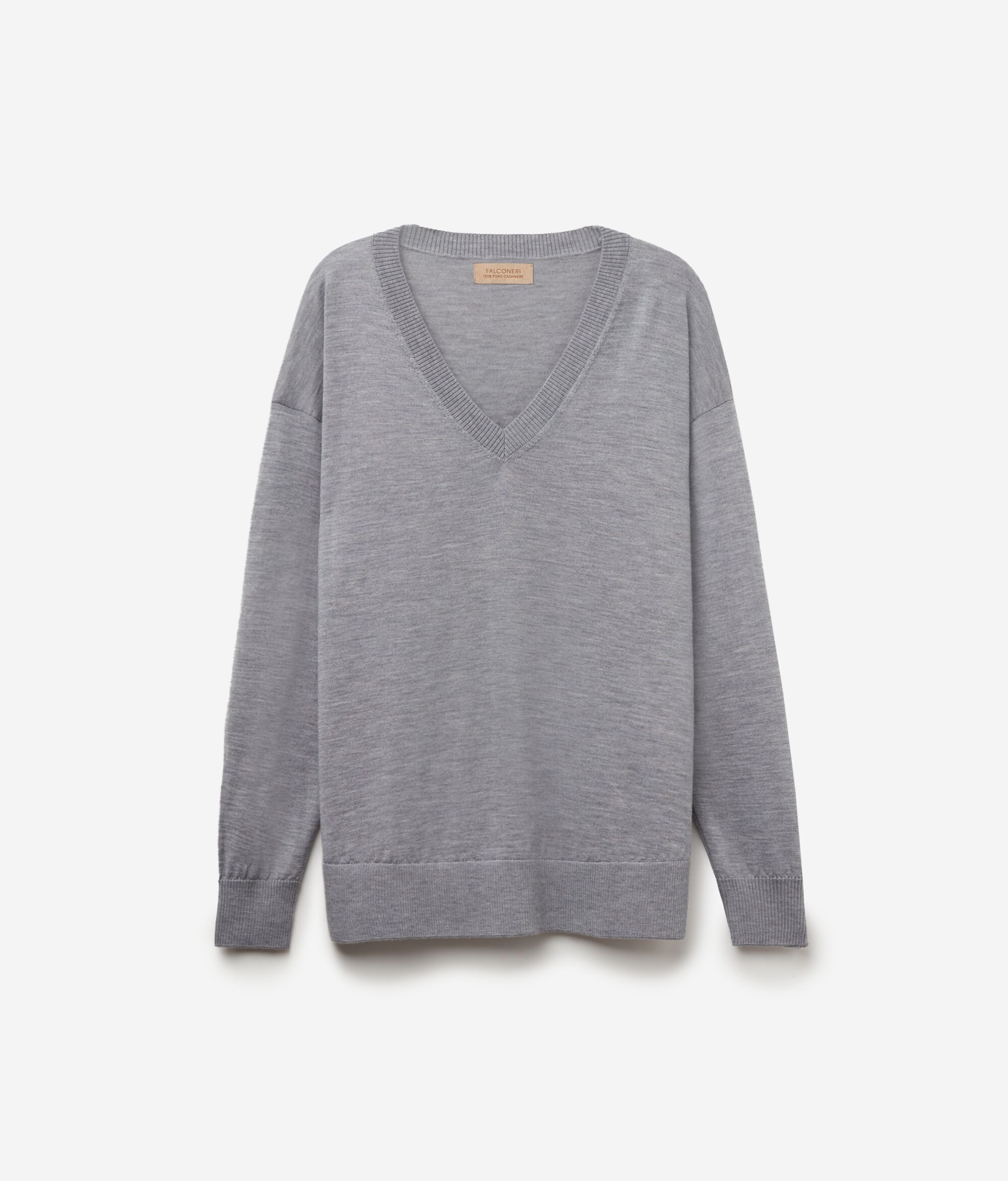 La maglia a scollo a V realizzata in cashmere ultrafine è un modello a manica lunga che si caratterizza da una lavorazione a costina sullo scollo, sui polsi e sul fondo. La sua peculiarità sono gli spacchi laterali. Le spalle sono leggermente scese e sua vestibilità è morbida.