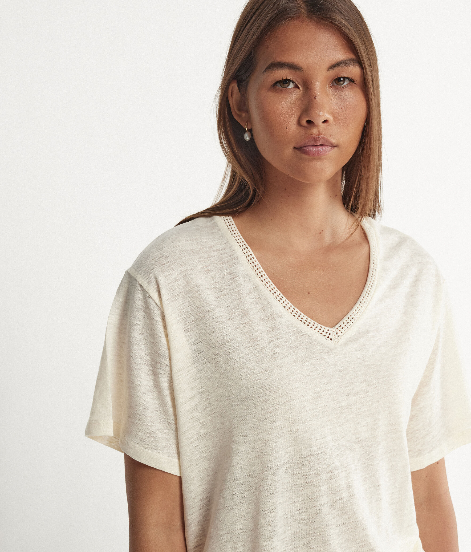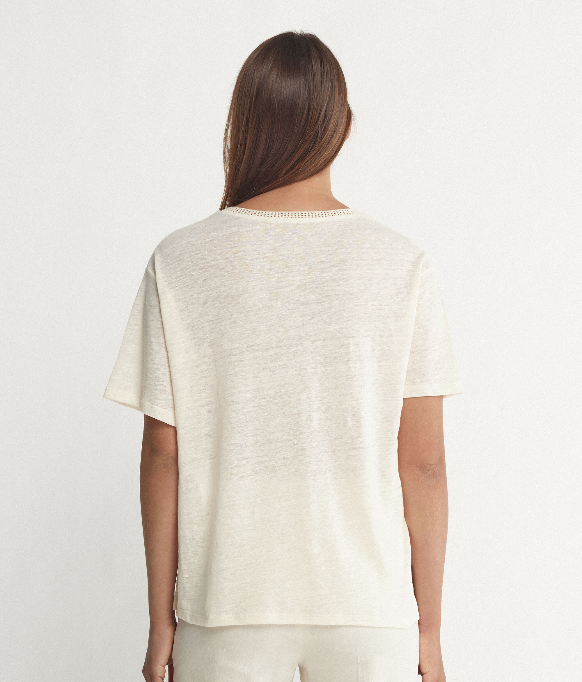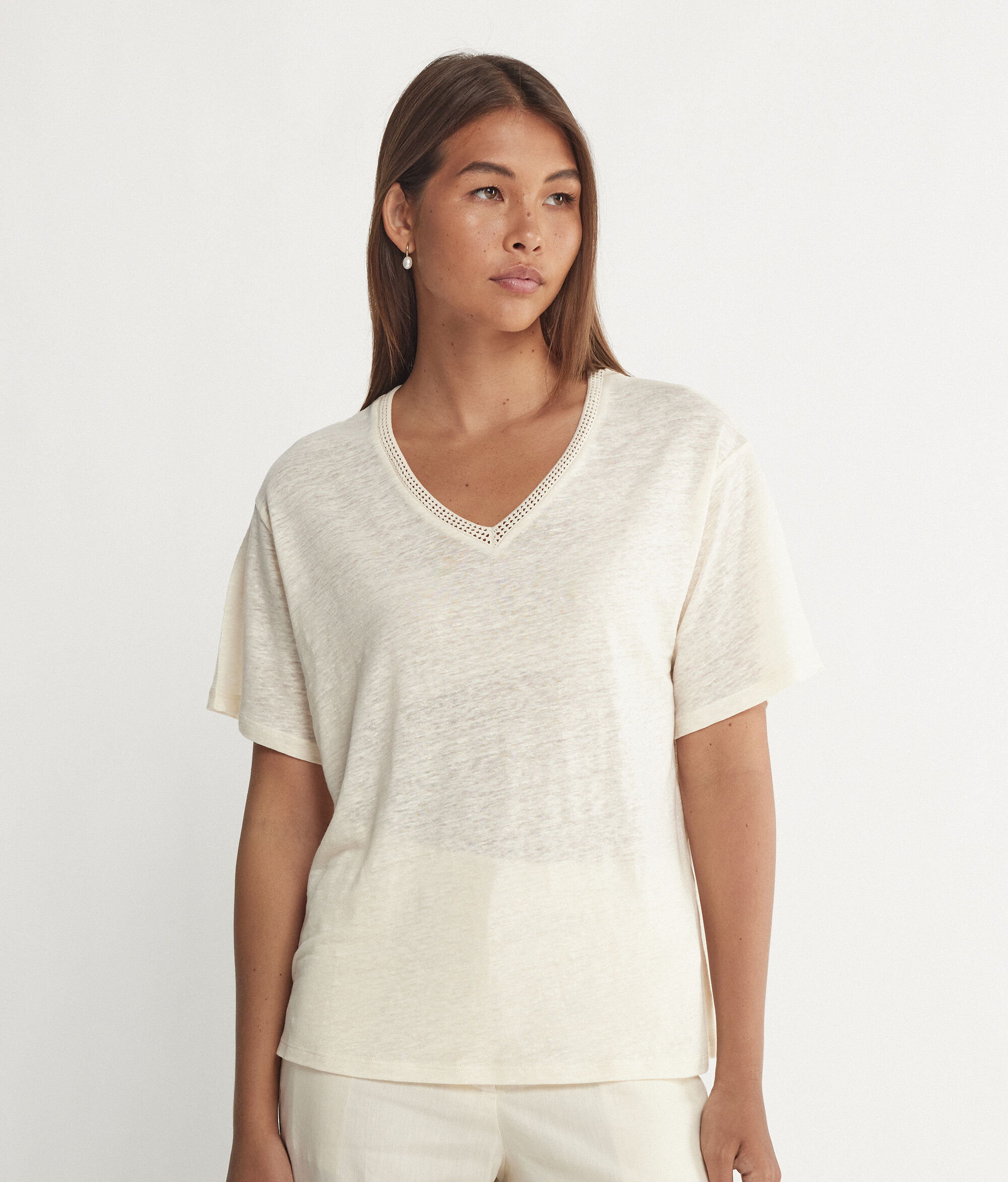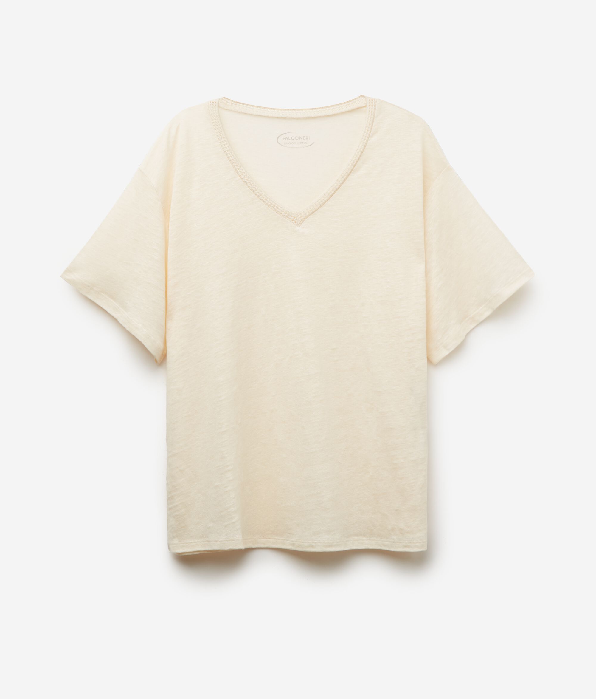 T Shirt con Scollo a V in Lino con Bordi in Retina