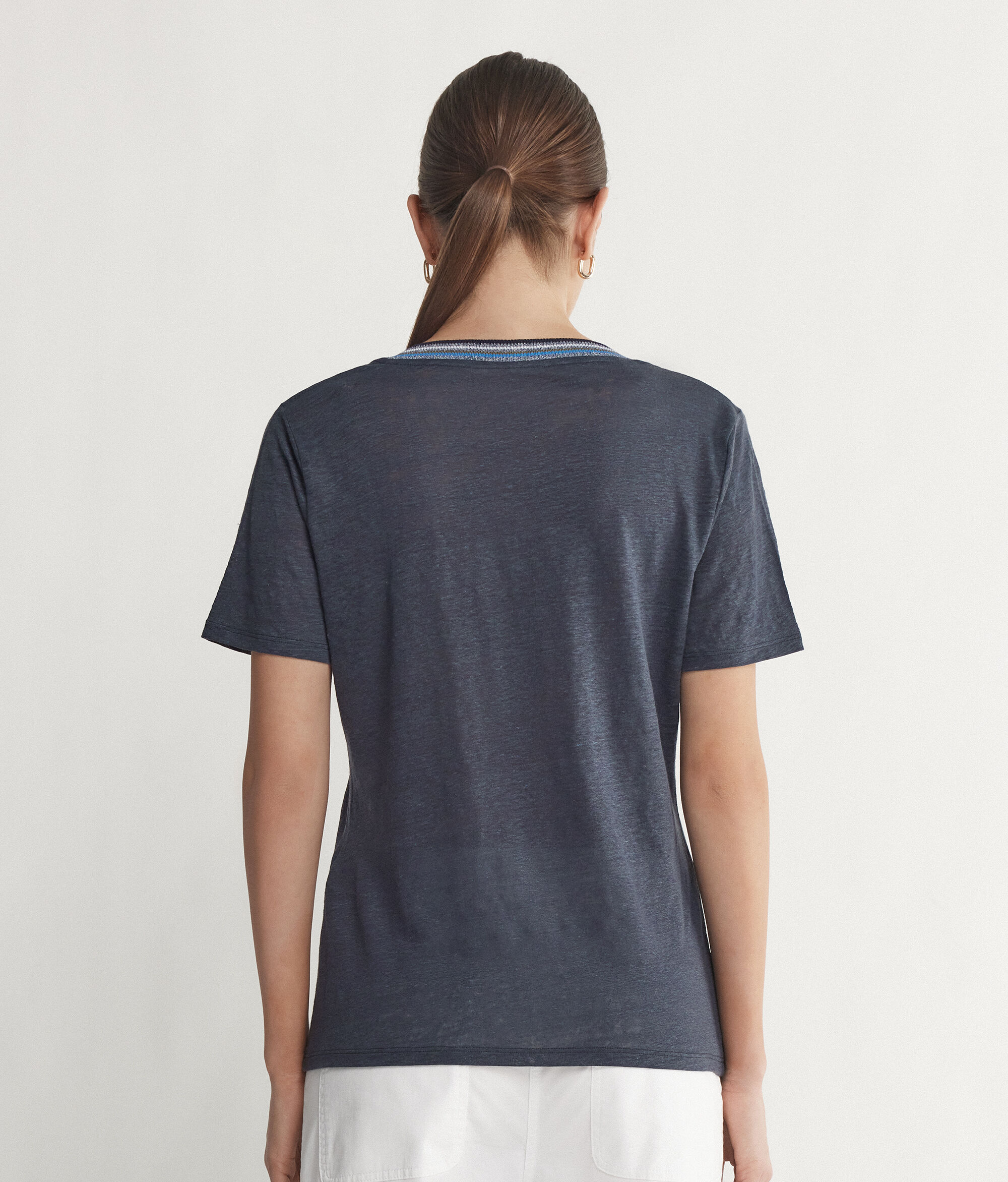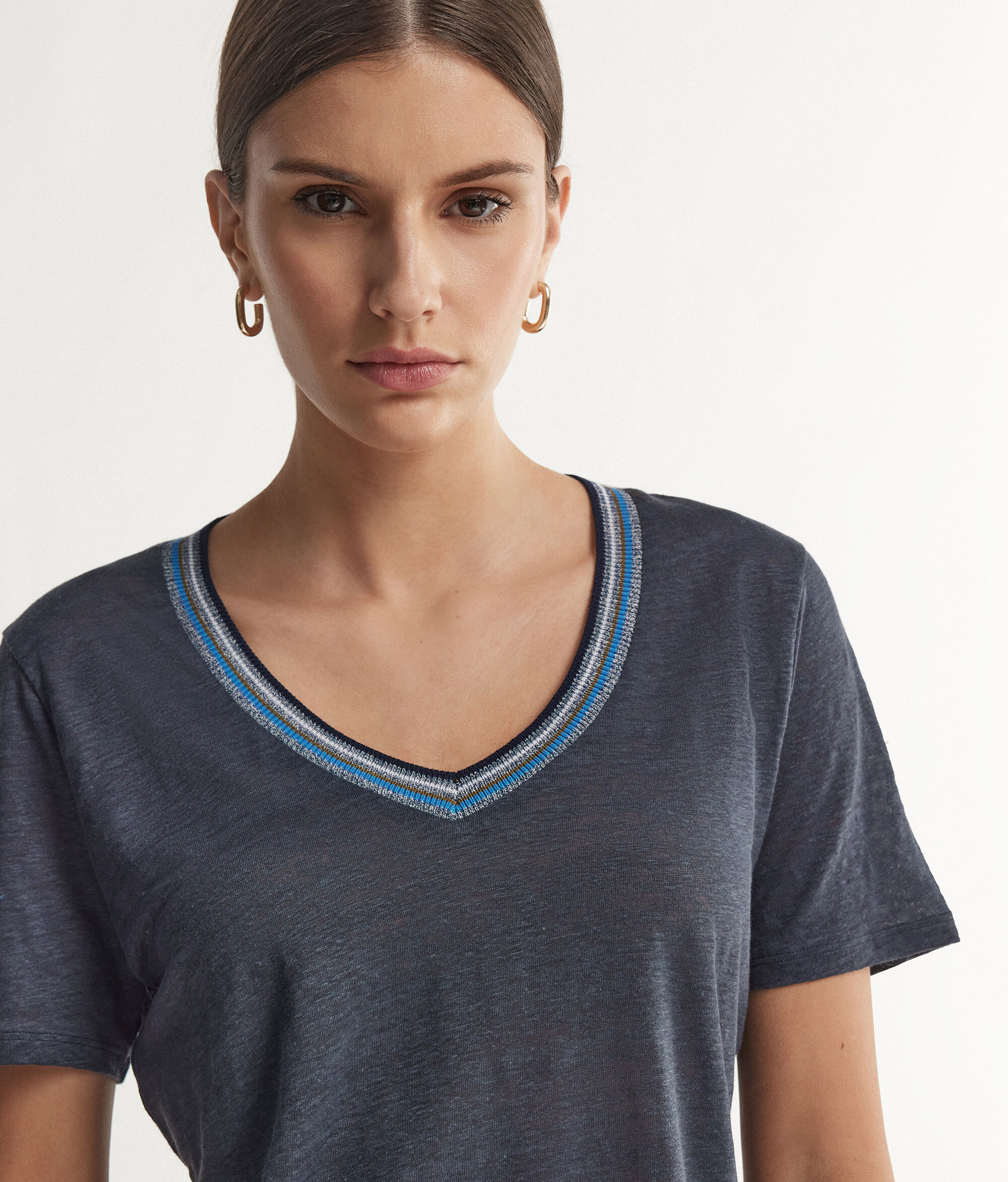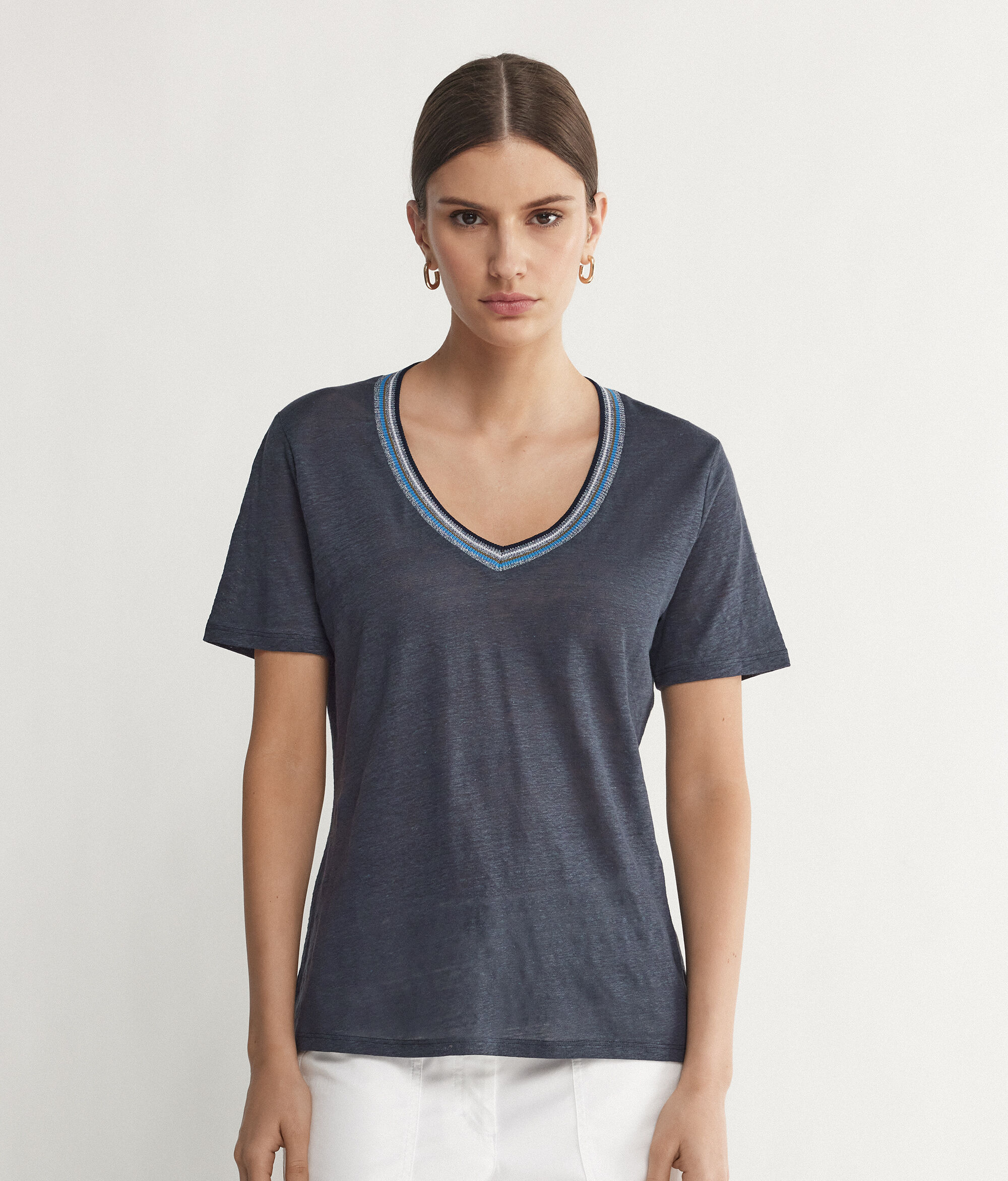 T-Shirt con Scollo a V Bordi Multicolor in Lino
