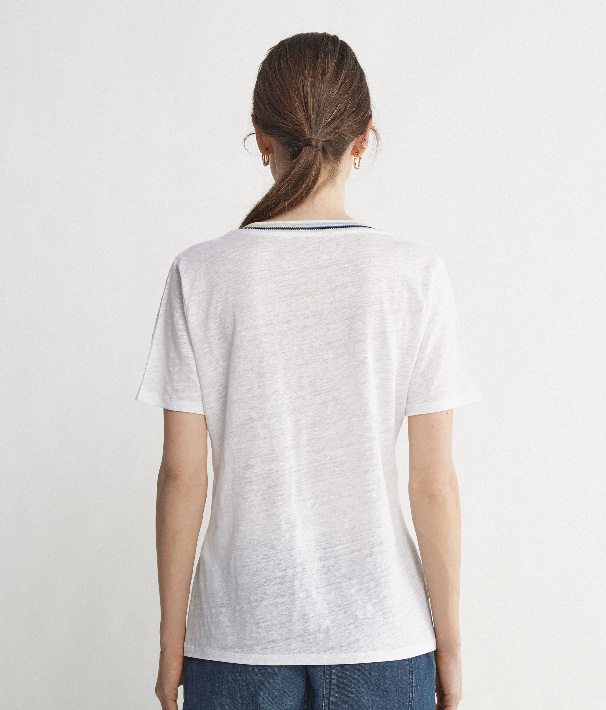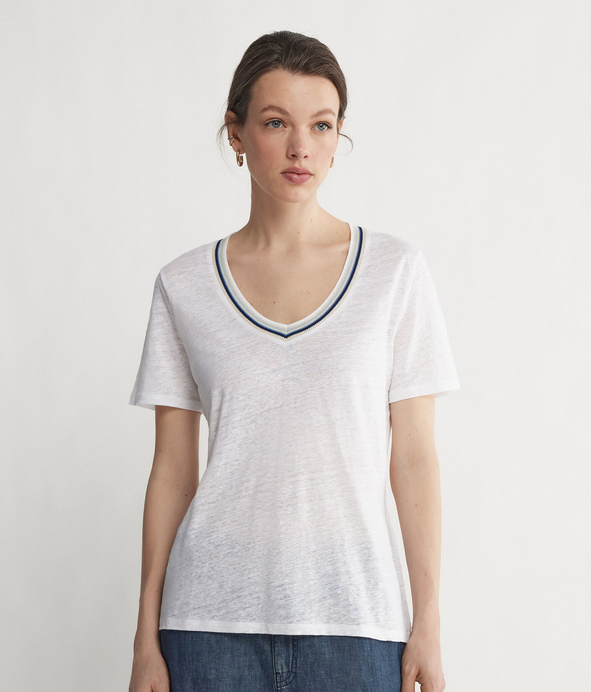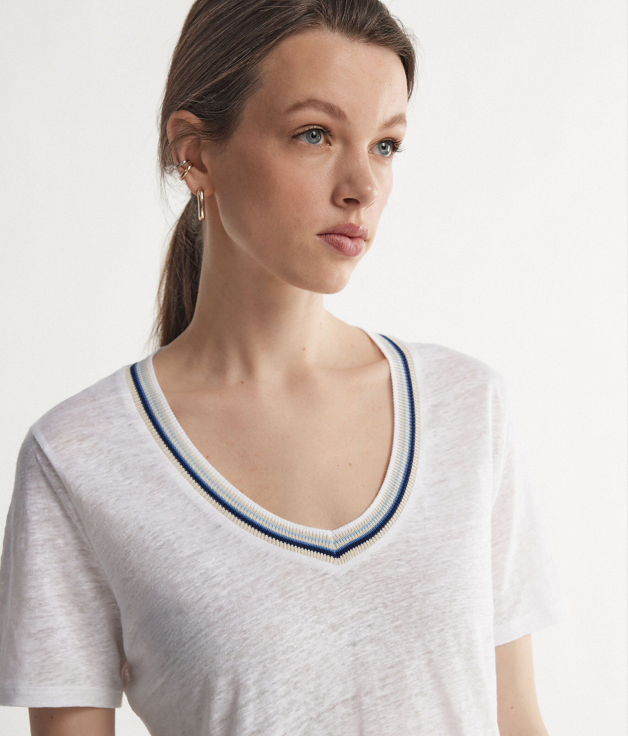 T-Shirt con Scollo a V Bordi Multicolor in Lino