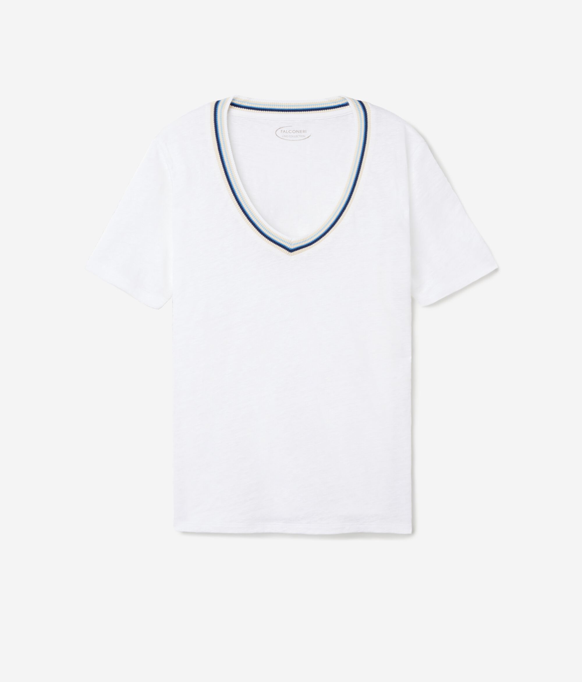 Linee morbide ed essenziali caratterizzano questa t-shirt dallo scollo a V firmata Falconeri. Il bordino multicolore dimostra ancora una volta l'amore per i dettagli che da sempre contraddistingue il brand. Perfetta con un pantalone dai toni neutri per un outfit raffinato ed elegante oppure con un pantalone cargo per uno stile casual-chic.