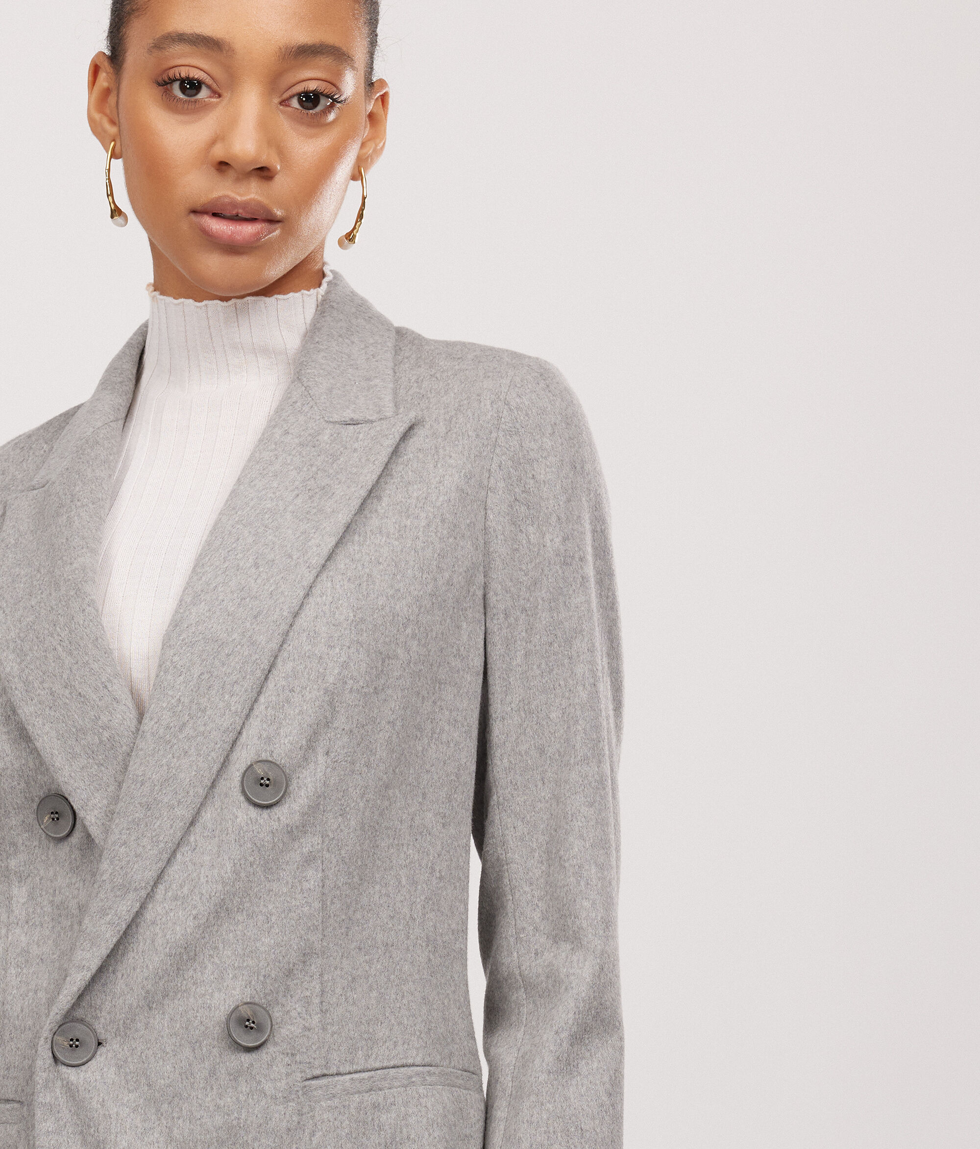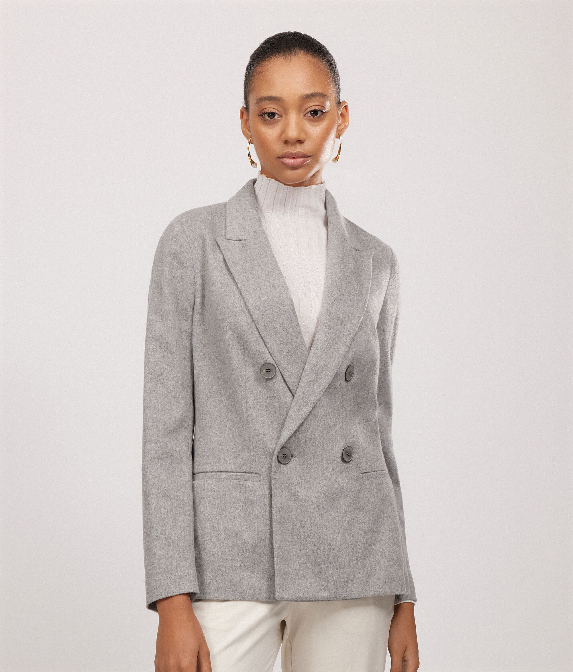 Questo modello di giacca doppiopetto in cashmere, presenta uno scollo rever, una chiusura arricchita da bottoni a vista e tasche a filetto. La spalla, la lunghezza e la sua vestibilità sono regolari.