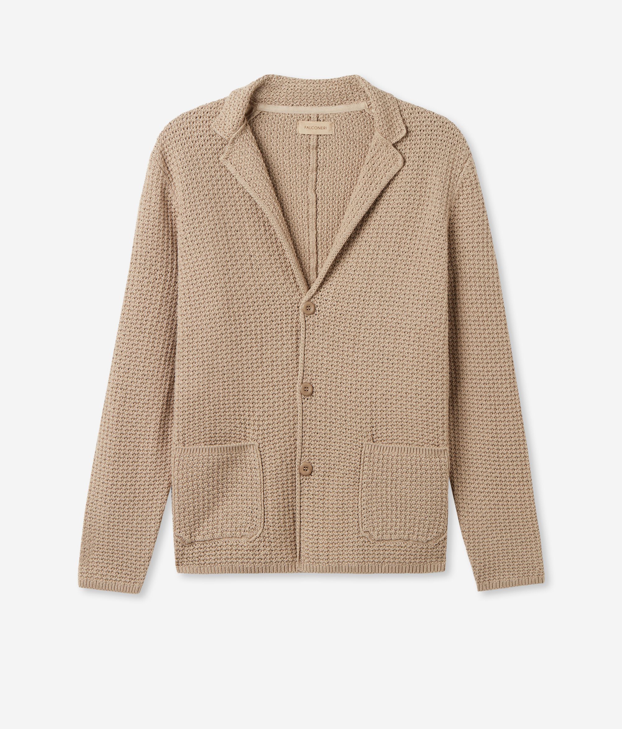 Giacca con trama a corda dal taglio casual ma raffinato. Particolare il tessuto con intreccio a corda, la cui intessitura crea un piacevole effetto cromatico e tattile.