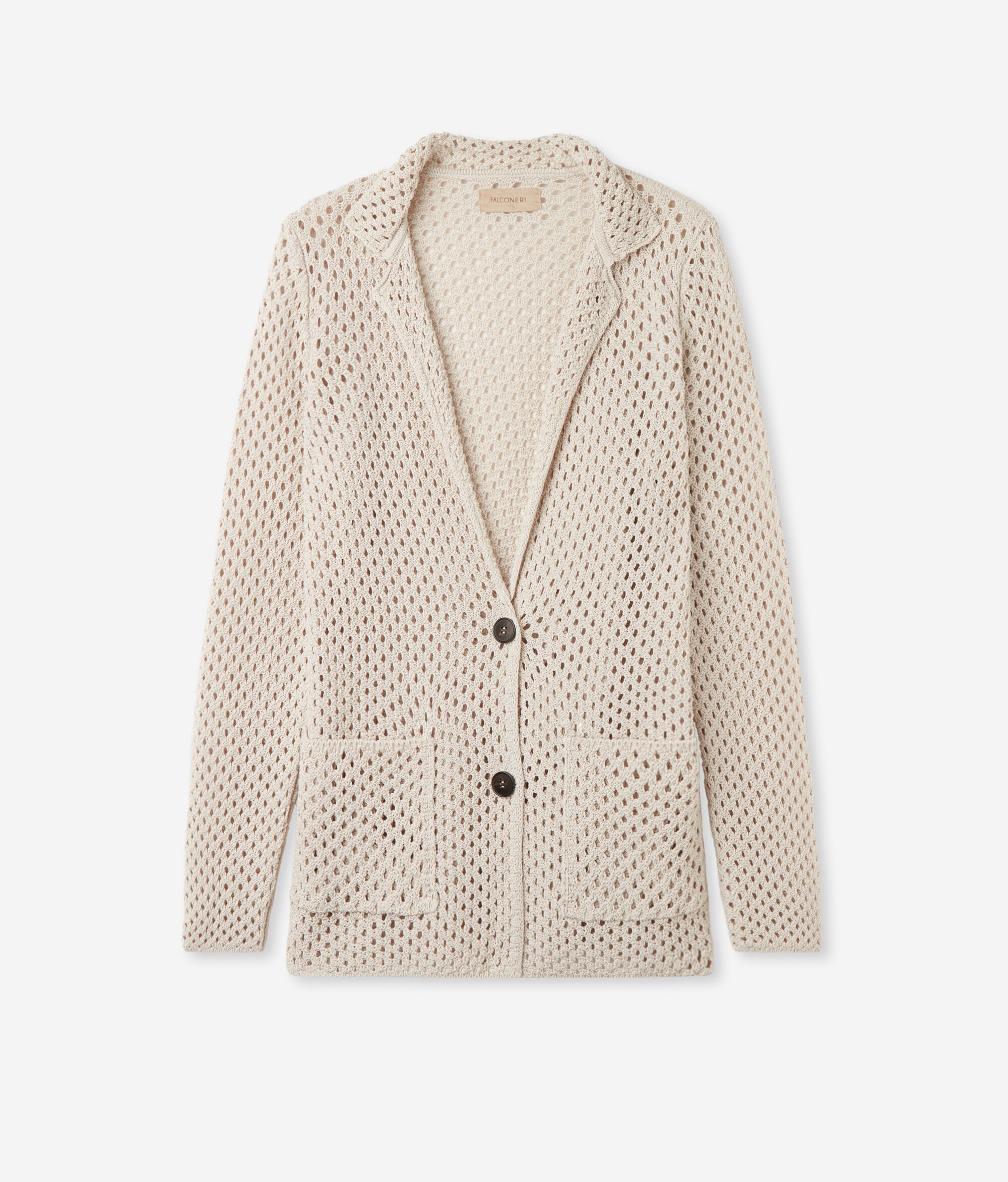 Il continuo studio di tessuti e forme rende Falconeri un brand inconfondibile e permette la realizzazione di giacche facili da indossare, ma uniche nel suo genere. La silhouette raffinata ed essenziale di questa giacca in maglia di cotone a punto traforato esalta la naturalezza del tessuto dall'aspetto lievemente irregolare e dà vita ad una texture croccante e fresca esaltando uno stile raffinato e moderno.