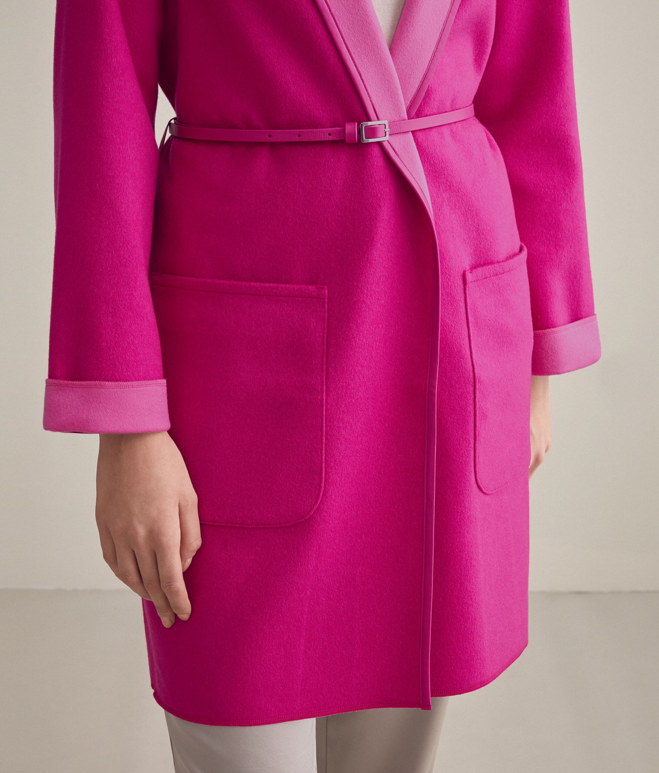 Sobretudo Bicolor todo em caxemira de malha lisa com jogo de contraste de cores no interior e exterior e perfis em pele. Fecho com cinto em pele e dois grandes bolsos aplicados. A modelo tem 1,78 m de altura e veste o tamanho M Made in ItalyPeito: 88 cm / Cintura: 67 cm / Ancas: 94 cm