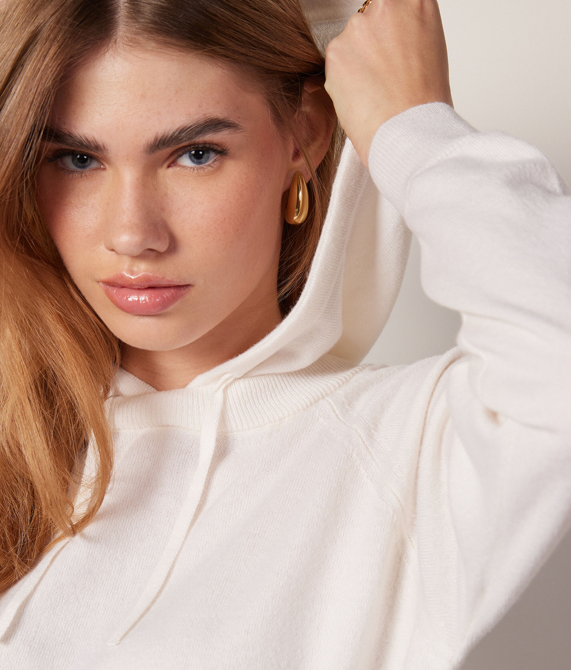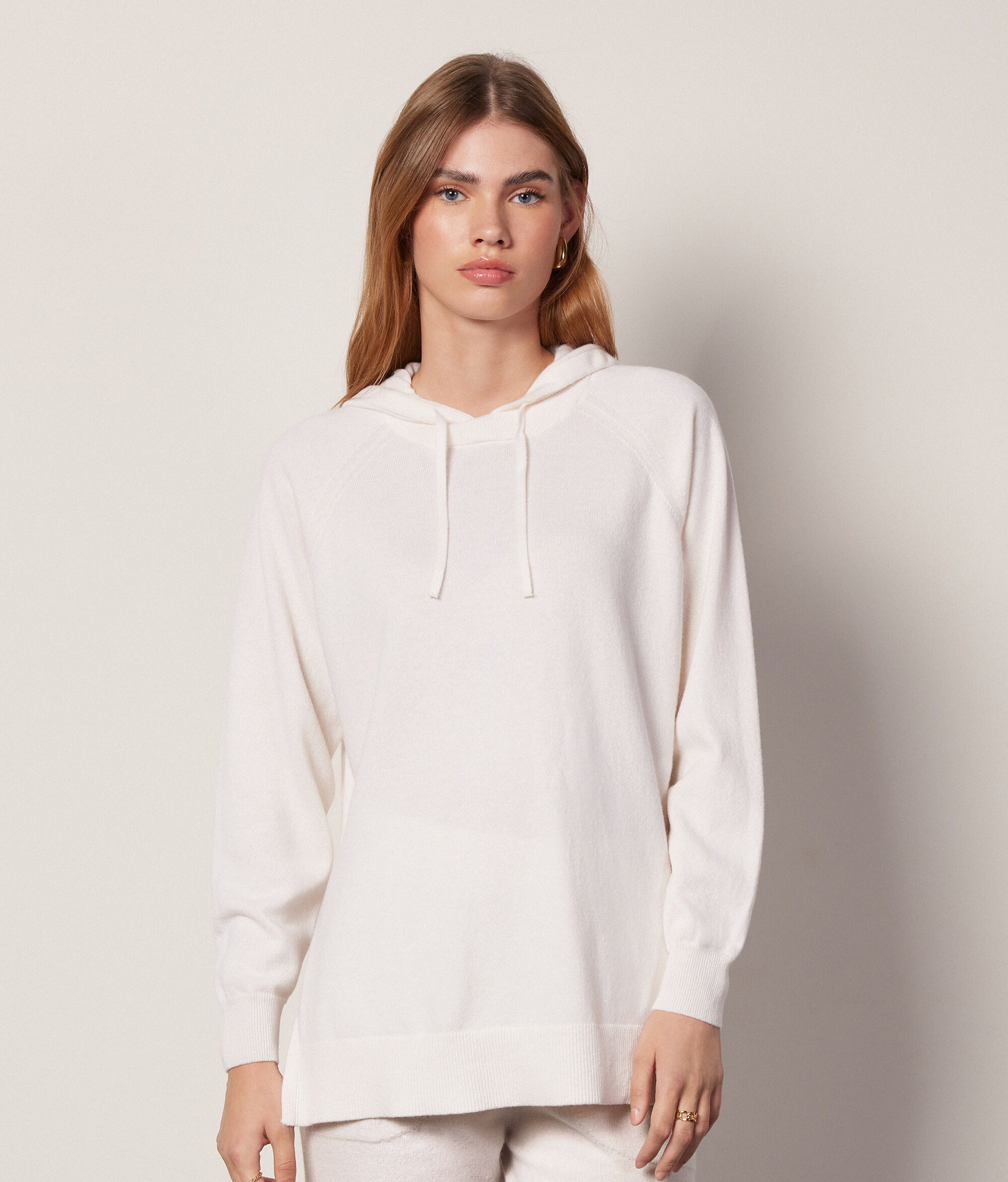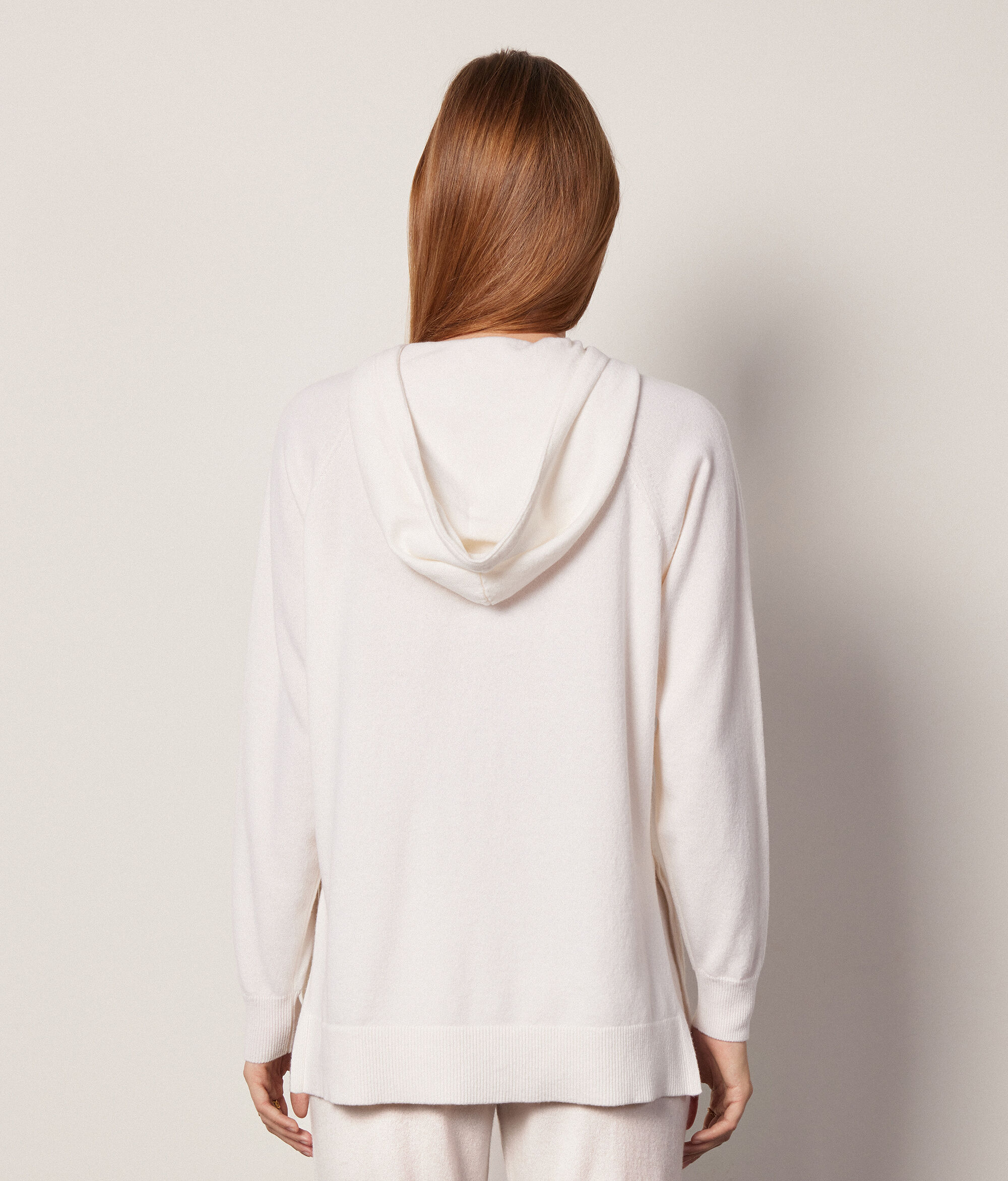 Let yourself be wrapped up in this soft sweatshirt entirely created in precious Ultrasoft Cashmere. Complete with hood with adjustable drawstring, it is also enriched by several ribbed knit finishes on the round neck, cuffs and hem. The design is further enriched by small side slits, a refined touch that gives the garment movement. Its loose wearability and raglan sleeves provide a relaxed and natural fit that comes up to a contemporary style.