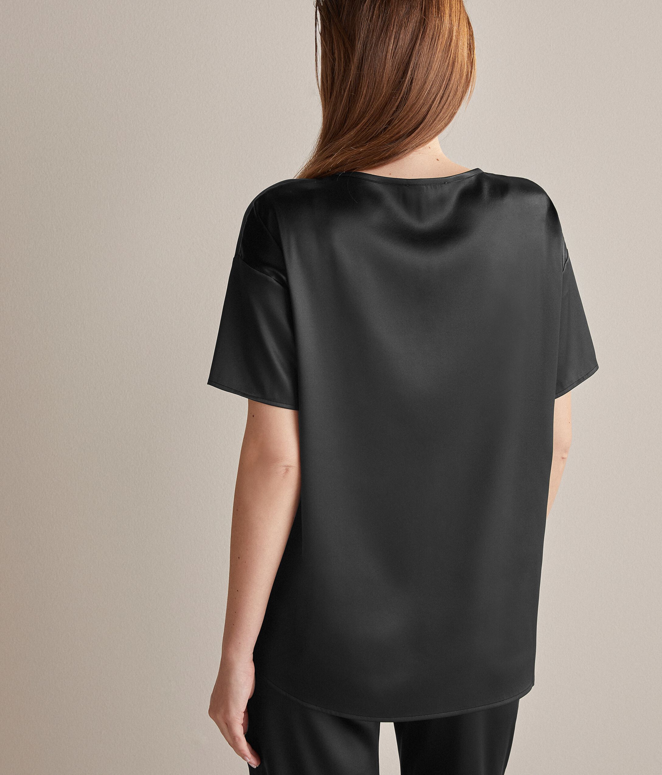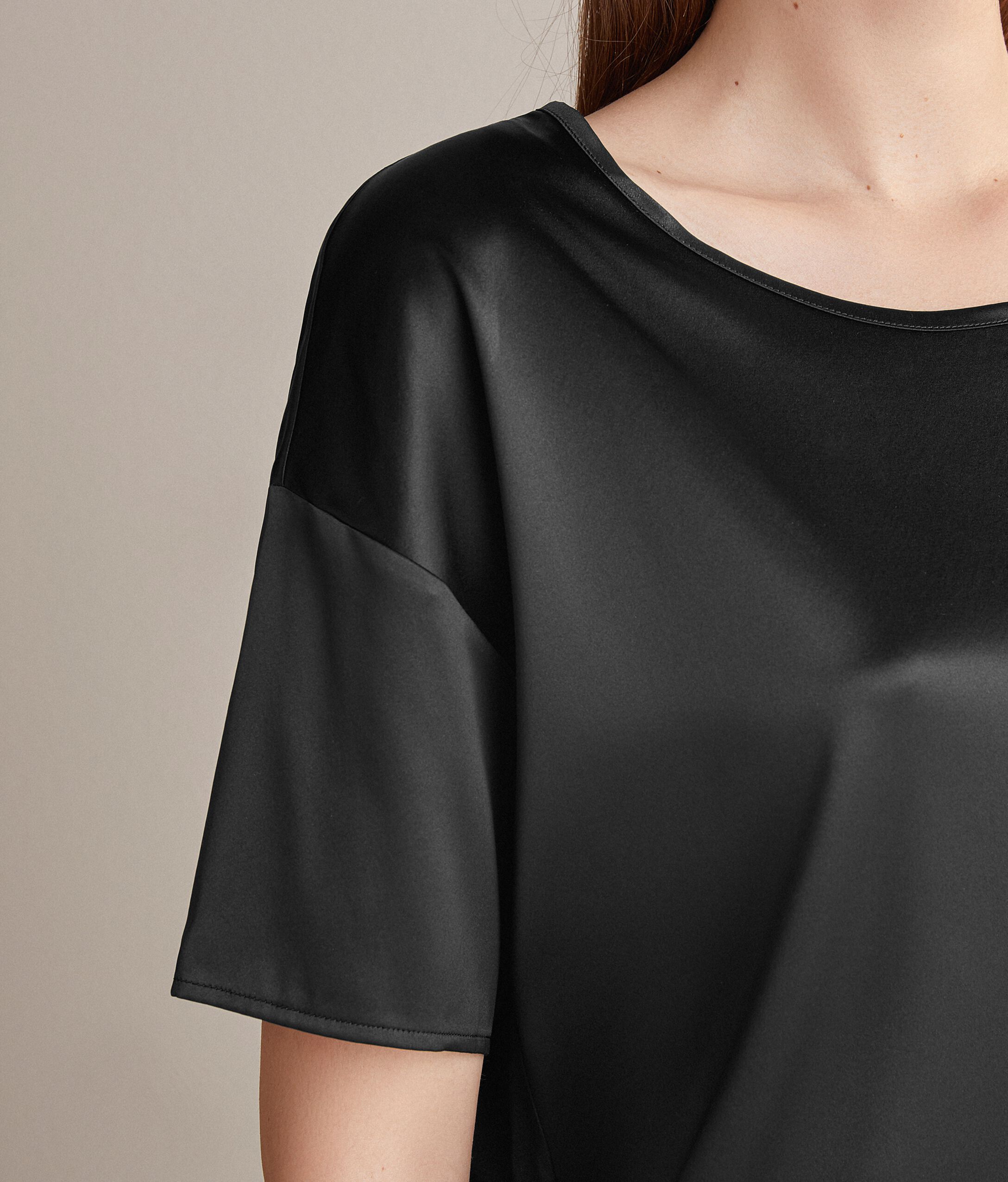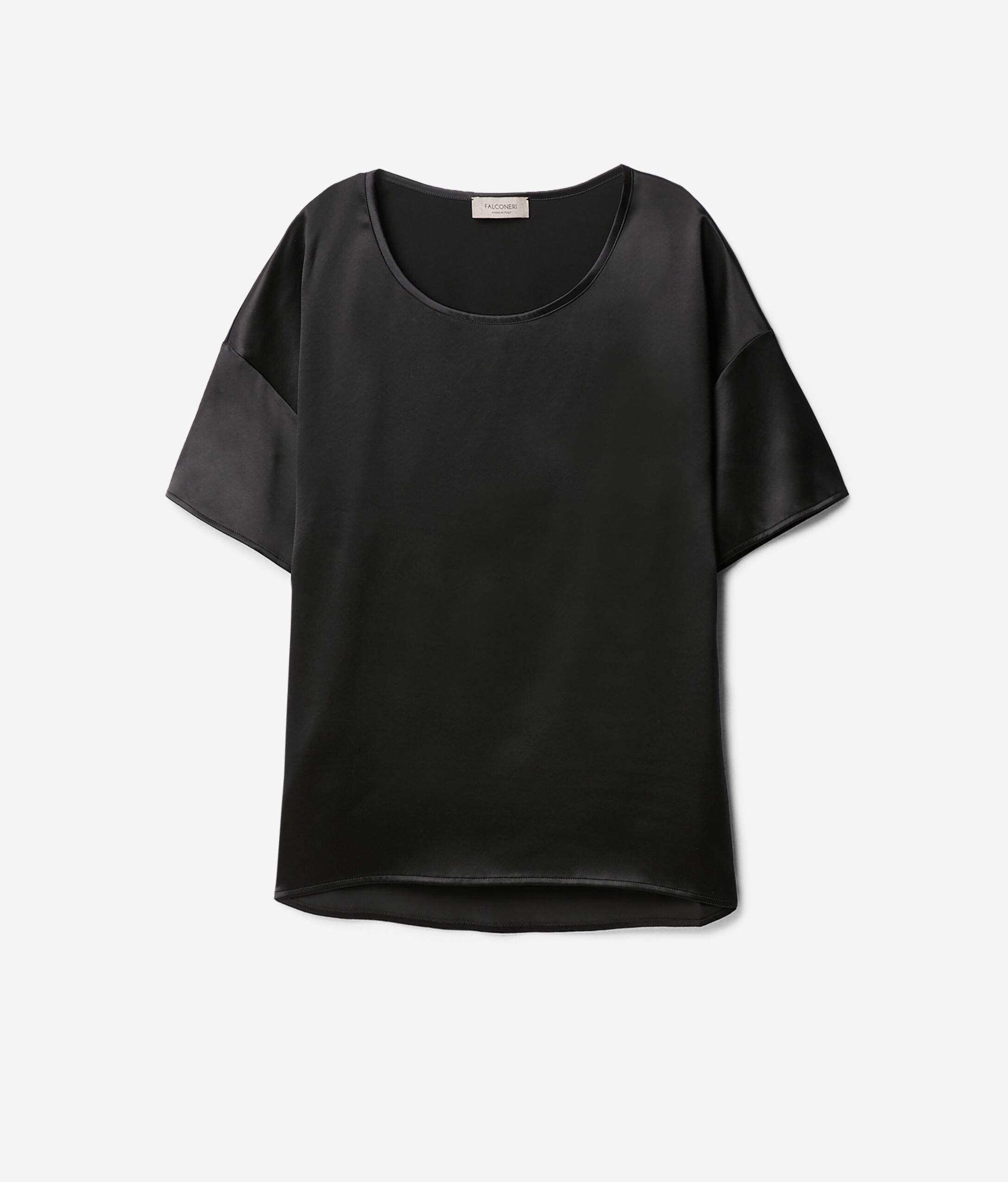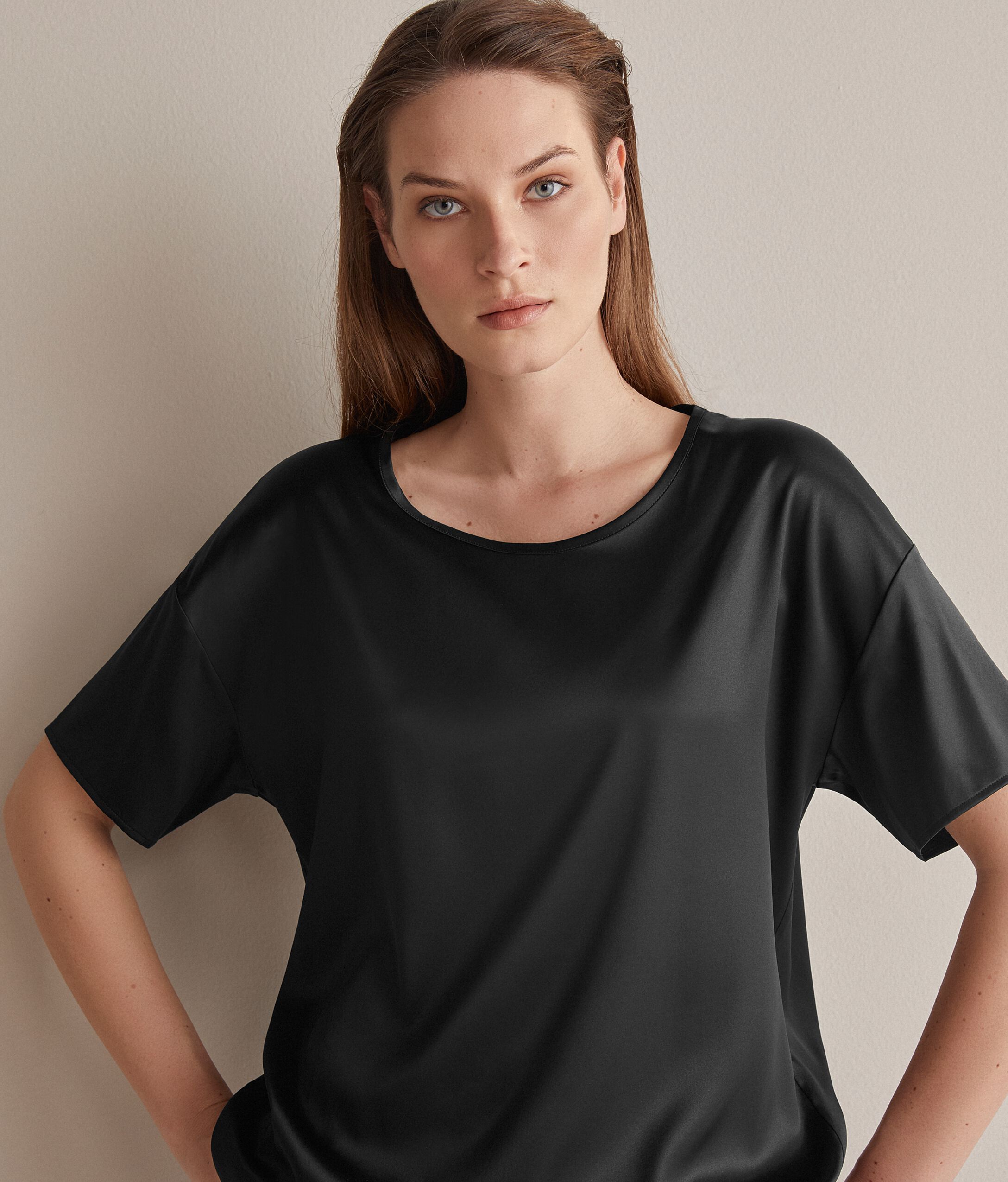 Falconeri koleksiyonu, doğal malzemelerle mükemmel bir şekilde eşleşen, form ve hacimler arasında oluşturduğu denge ile şüphesiz öne çıkar. İpek, bu streç saten tişörtün nazik formuyla ustaca birleşir. Kadın gardırobu için bir çok parça ile kombinlenebilen, seçkin bir parça. DPL406C veya DPL406D pantolonlarla mükemmel uyum sağlar. Modelin boyu 179 ve giydiği beden M Göğüs: 88 cm / Bel: 67 cm / Basen: 94 cm