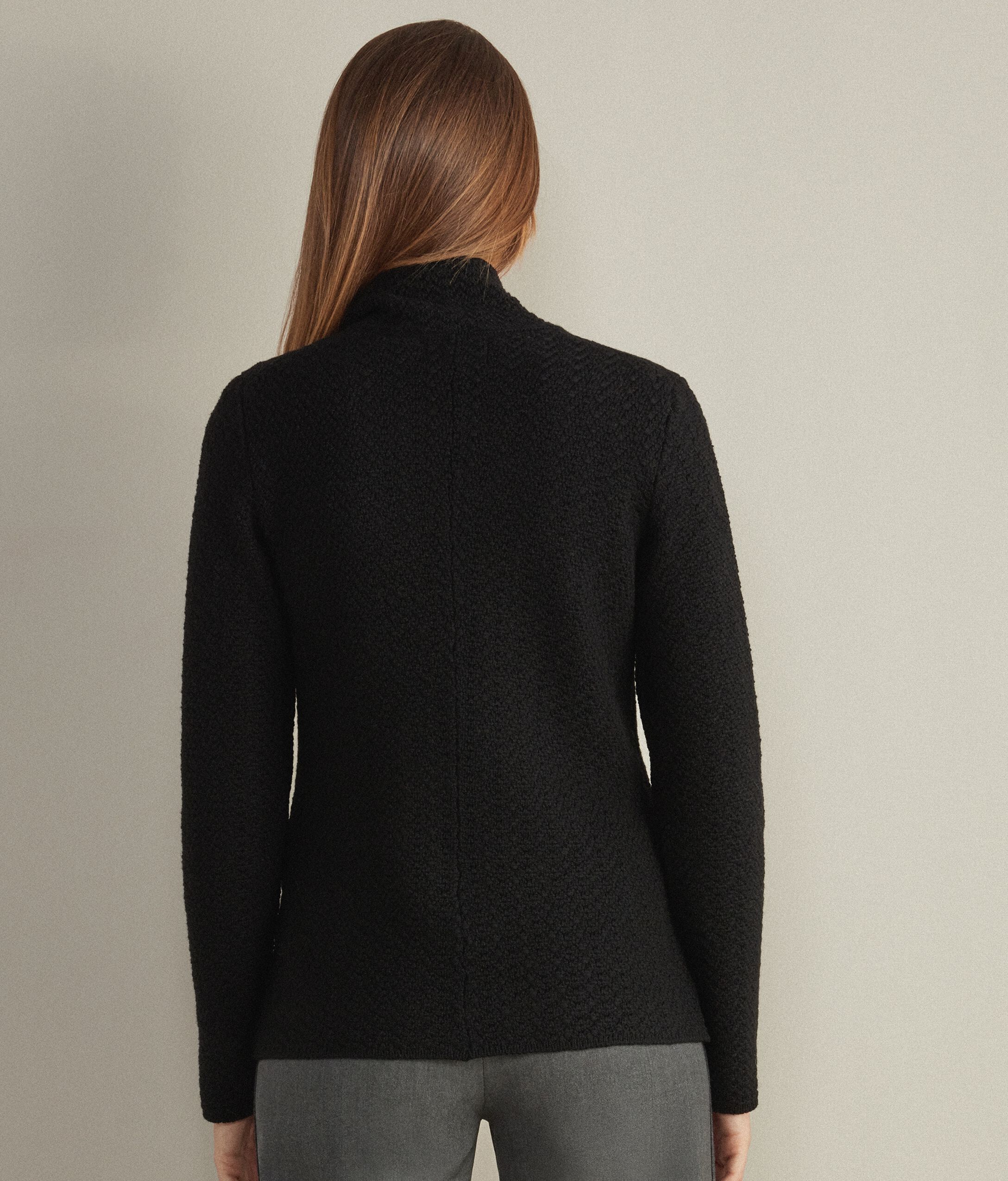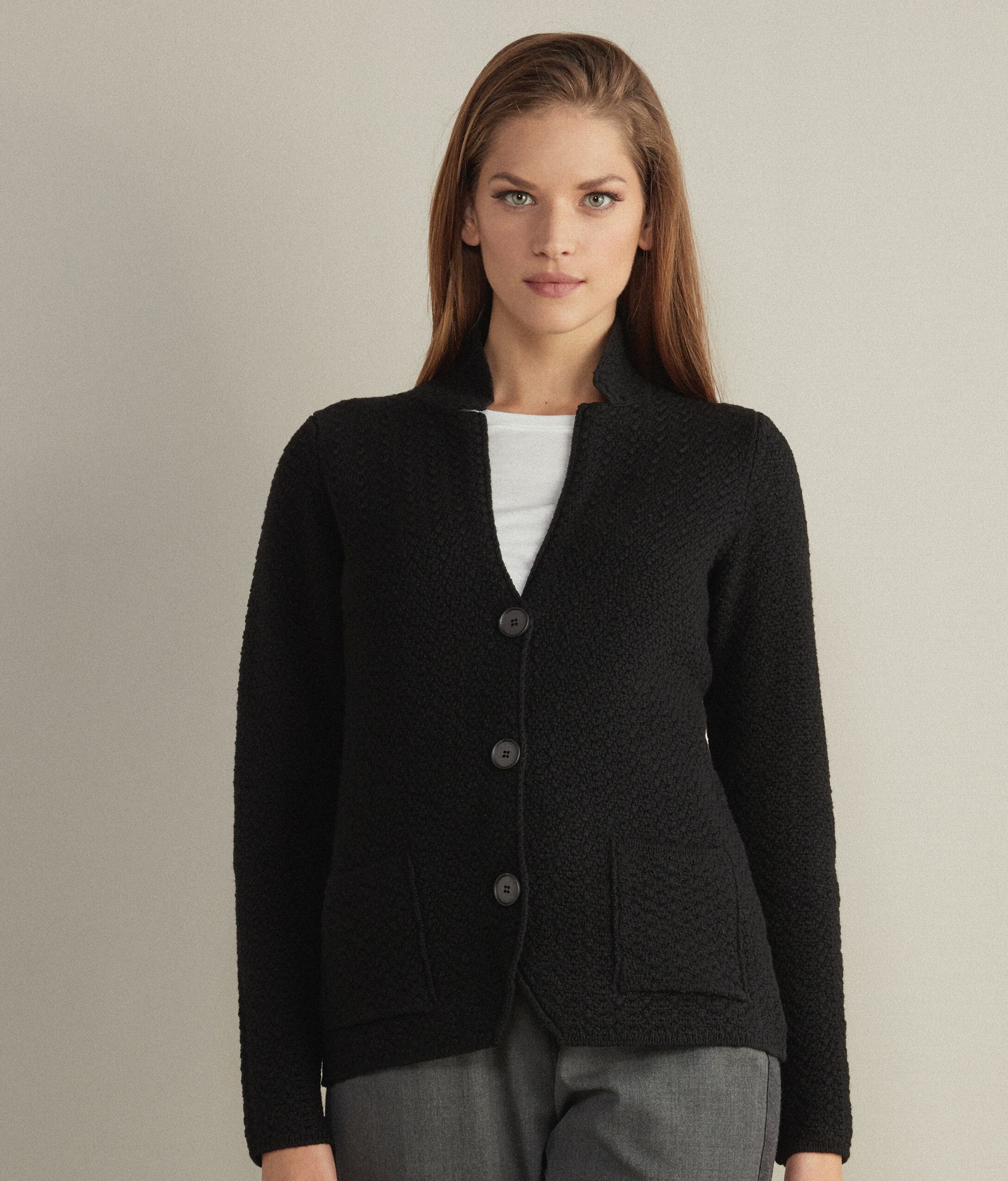 Sirtaki kabartmalı kroşe örgü yün ceket. Düğmeli ve yama cepli.