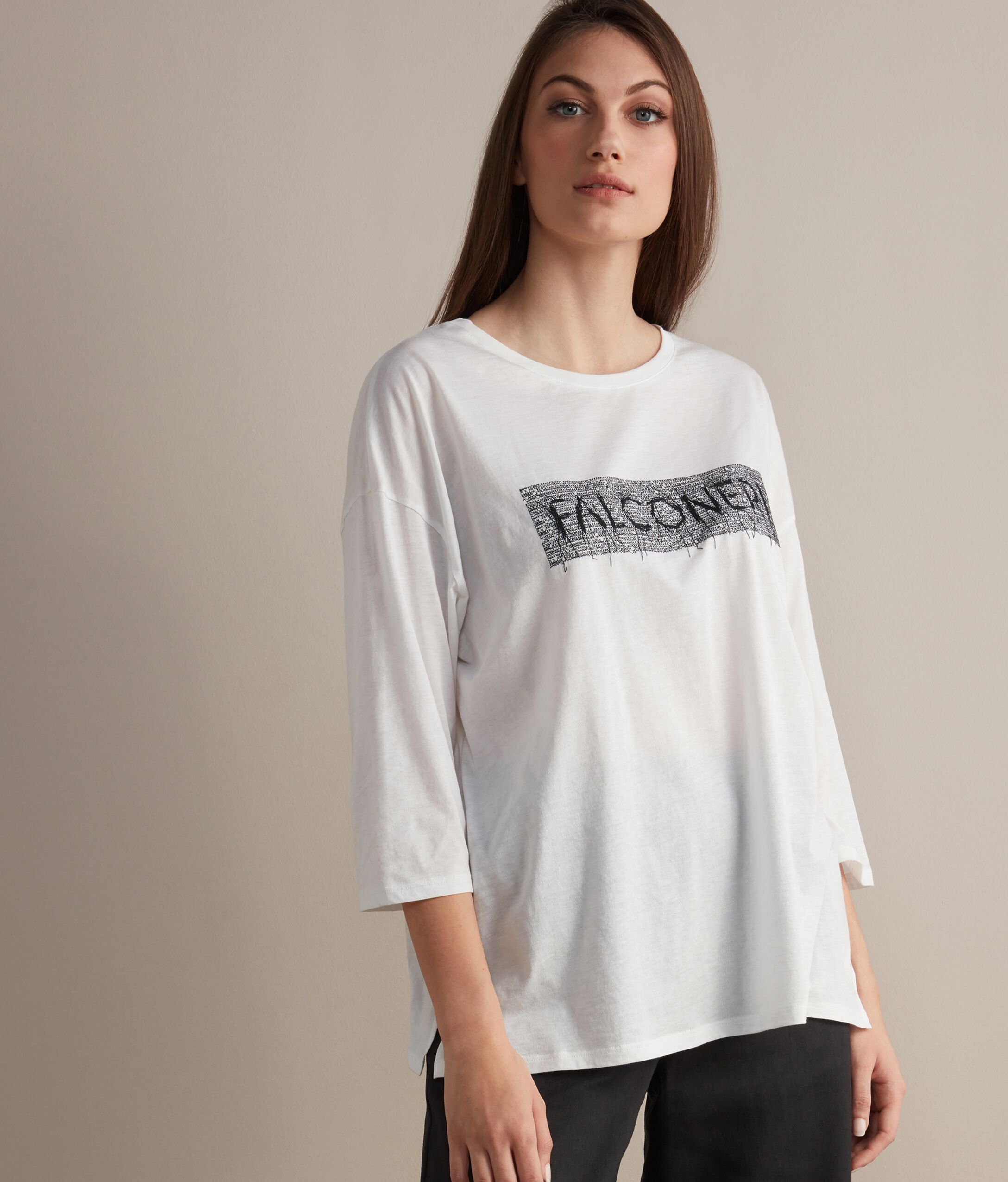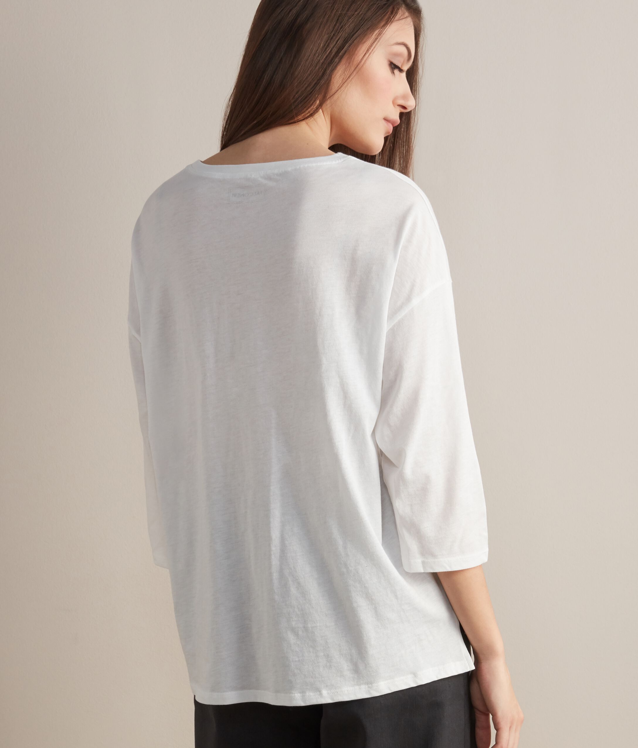 Fine embroidery enriches the casual style of this fresh silk, oversized t-shirt. A pleasant, fresh and breathable, yet soft and light texture elevates the versatile, essential style of a garment made for leisure.