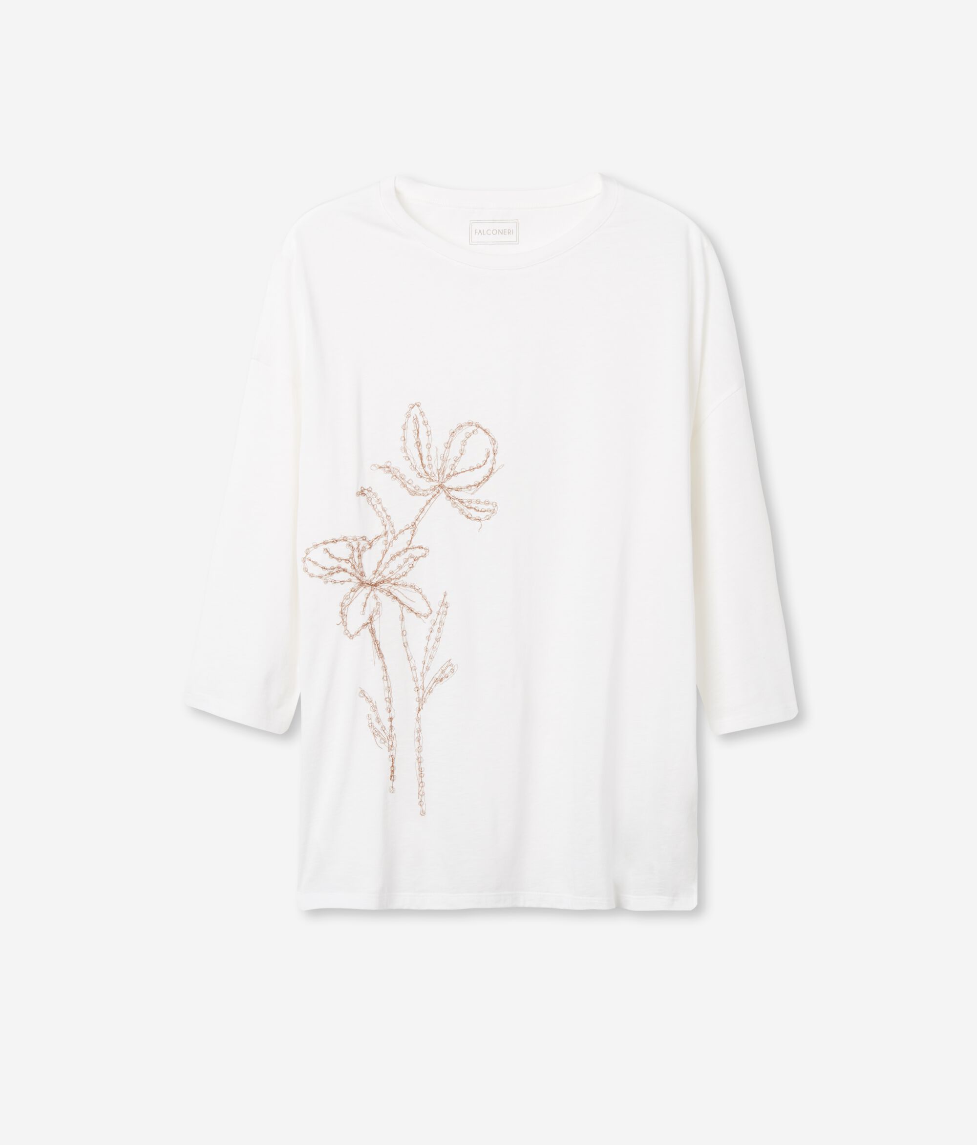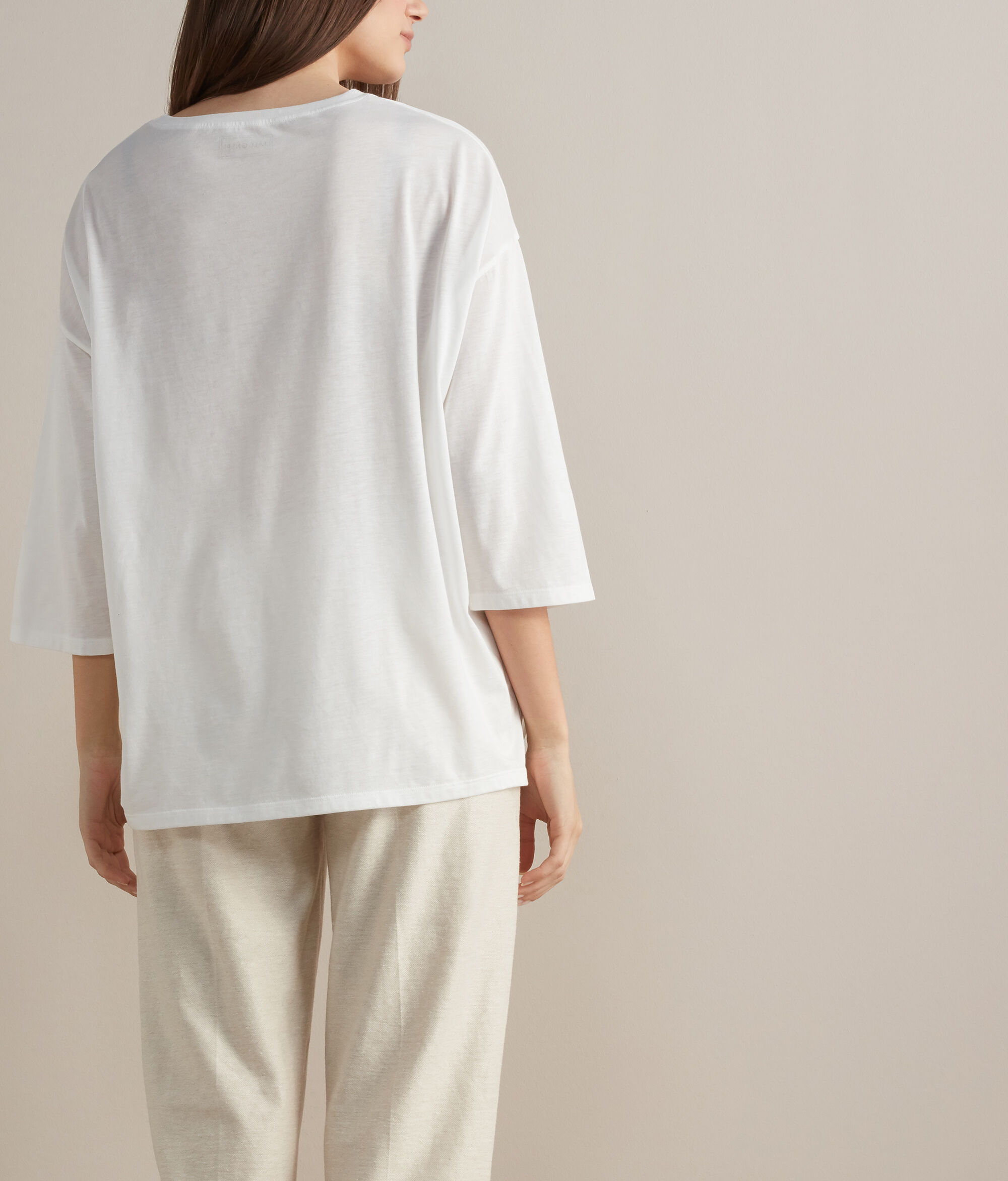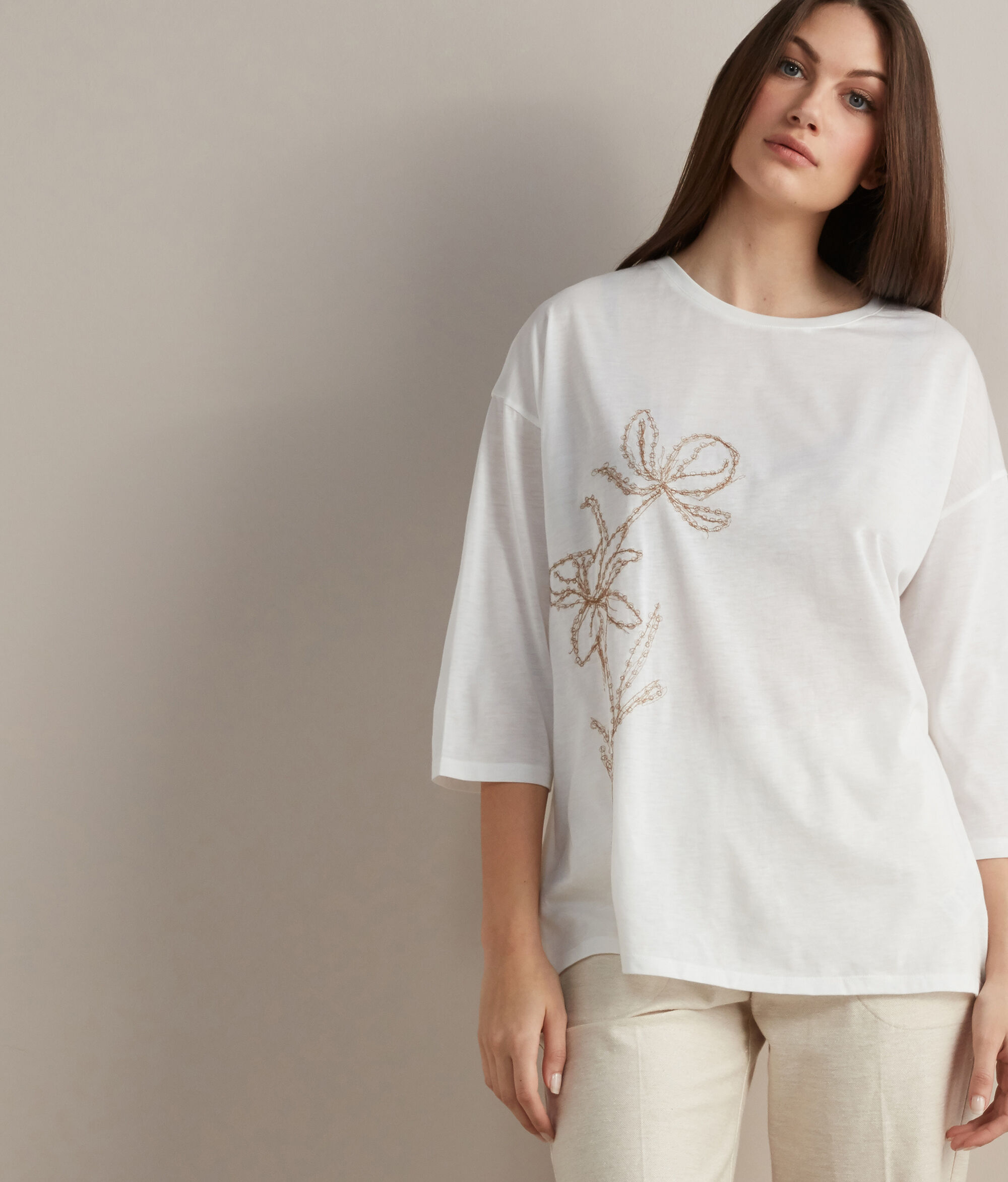 Exclusive embroidery enriches the casual style of this fresh silk, oversized t-shirt. A pleasant, fresh and breathable, yet soft and light texture elevates the versatile, essential style of a garment made for leisure.