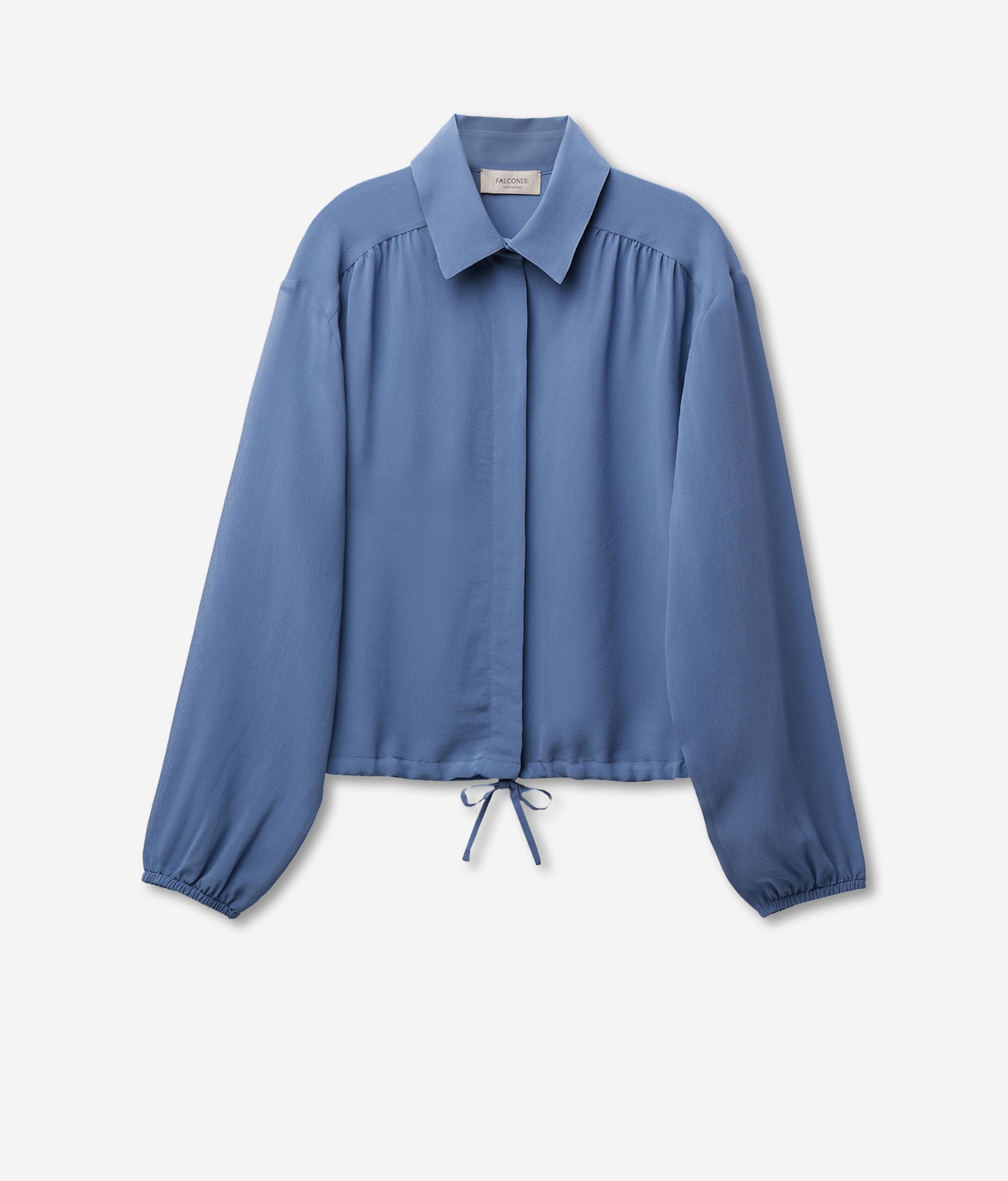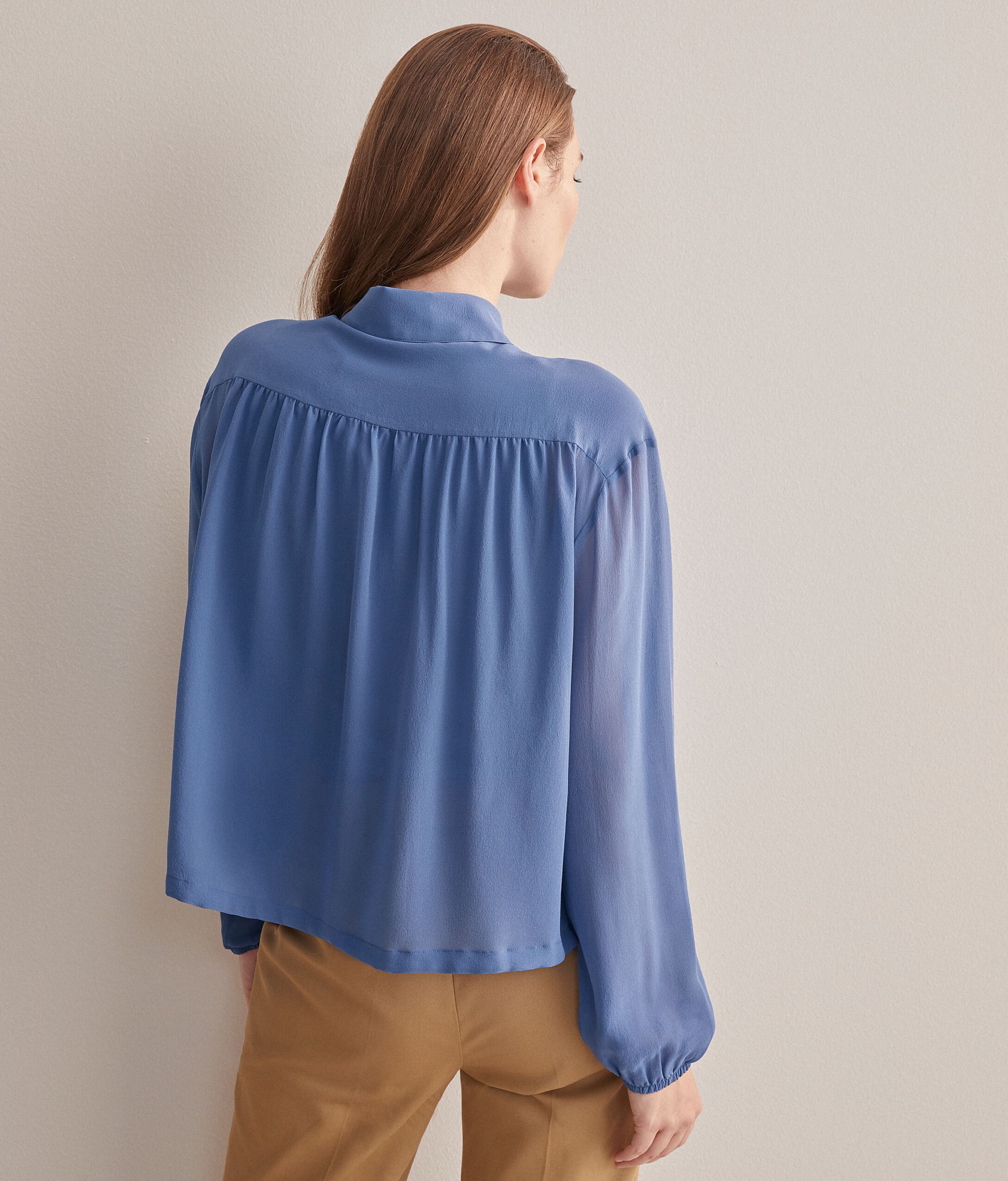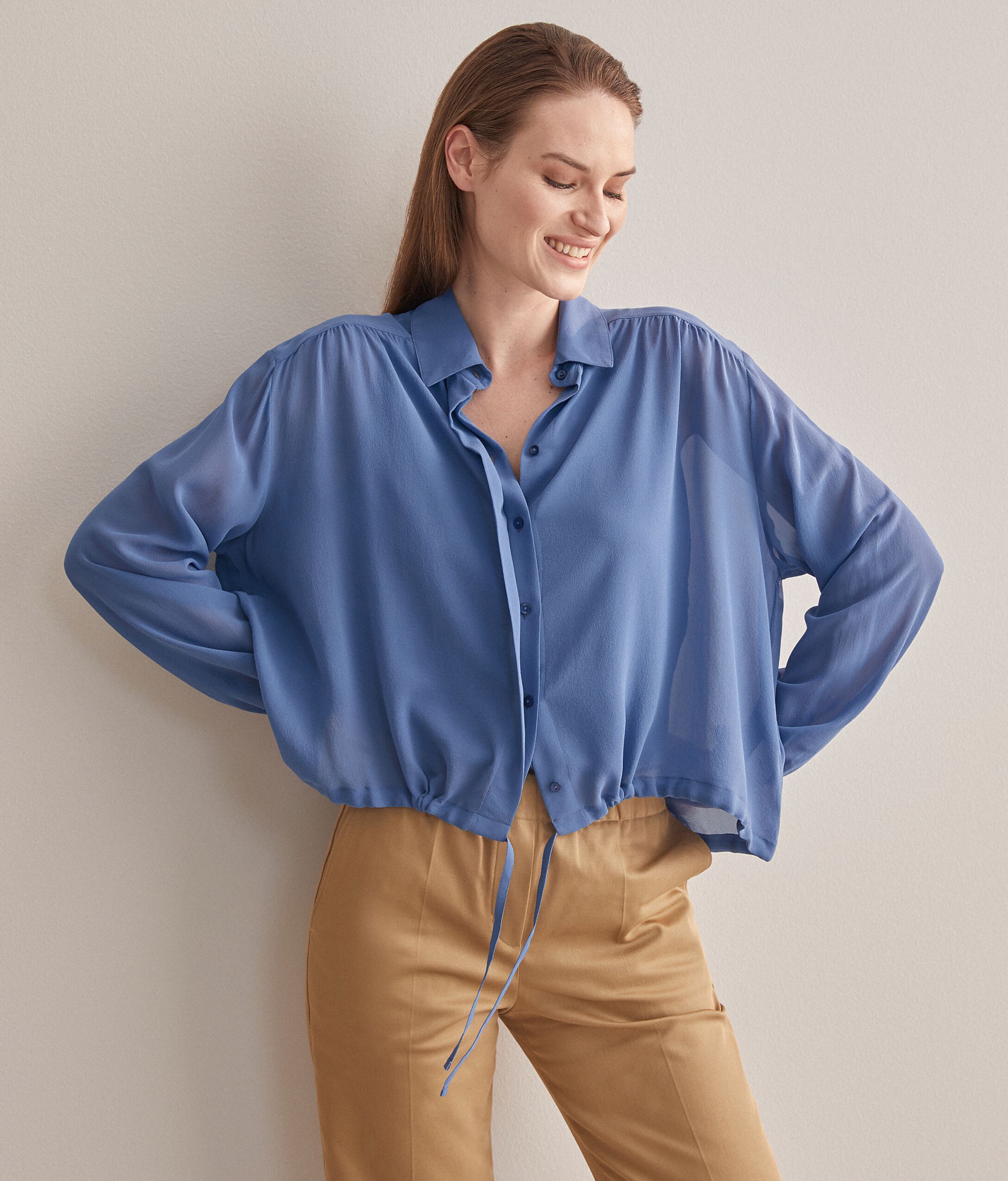 The brand's sophisticated balance of charm and style shines through in the collection's exquisite yarns and sleek, harmonious lines. The subtle and slightly rippled texture of the pure silk georgette enhances the generous volumes of this fluid and delicately sheer shirt, the wide sleeves standing out defined by their elasticated cuffs, and a drawstring on the hem to adjust the length and gather the shirt at the waist. Classic concealed button fastening.