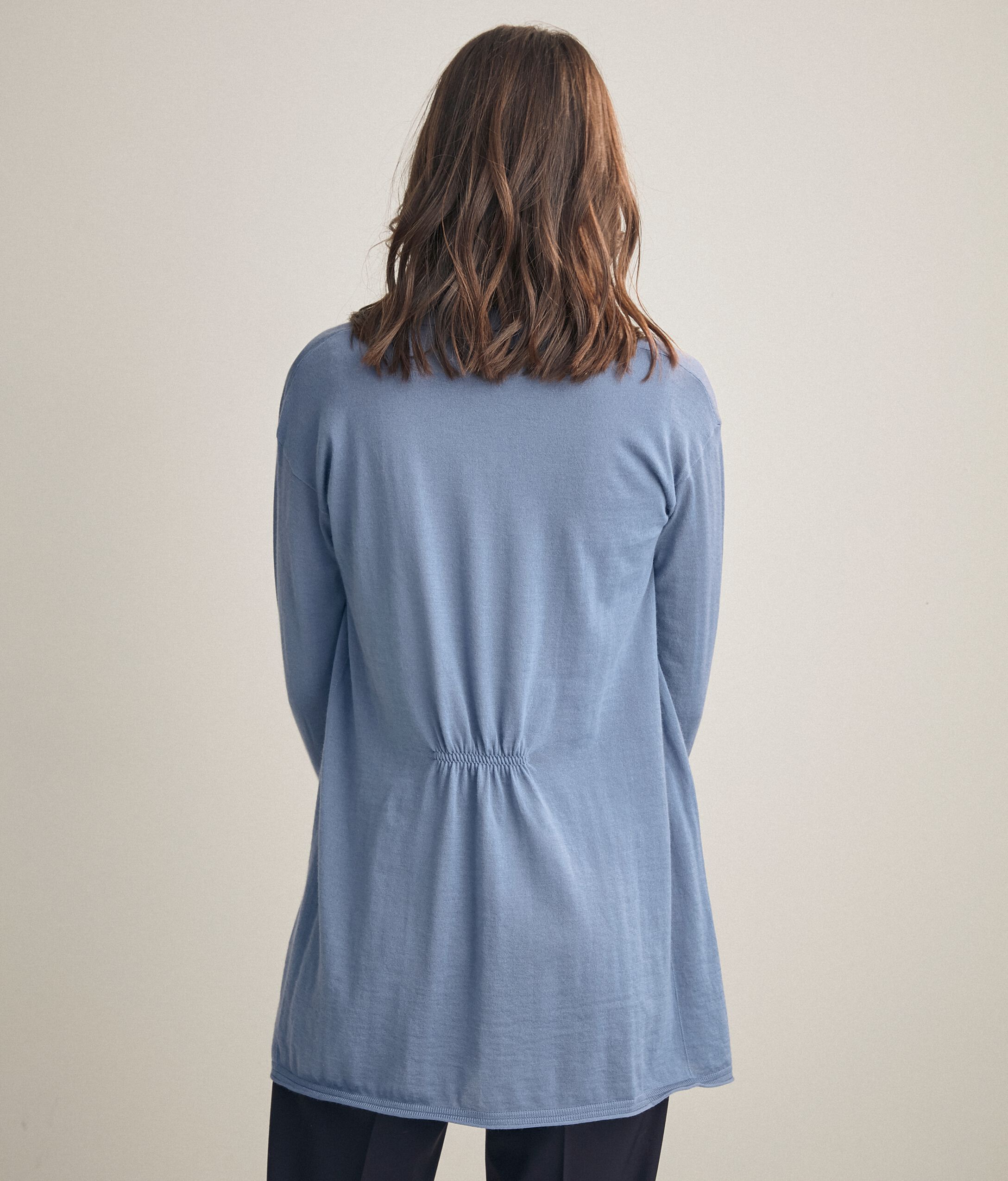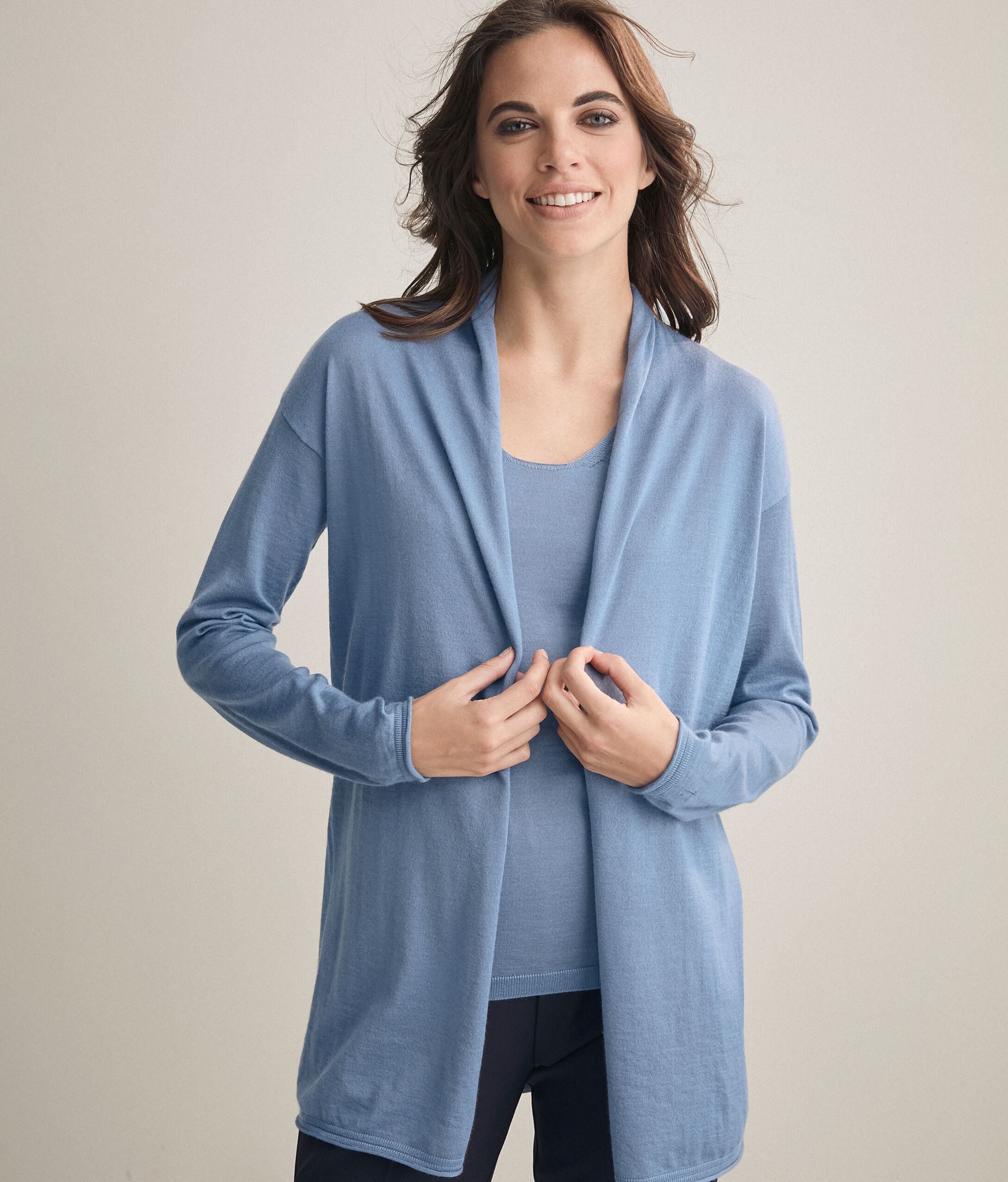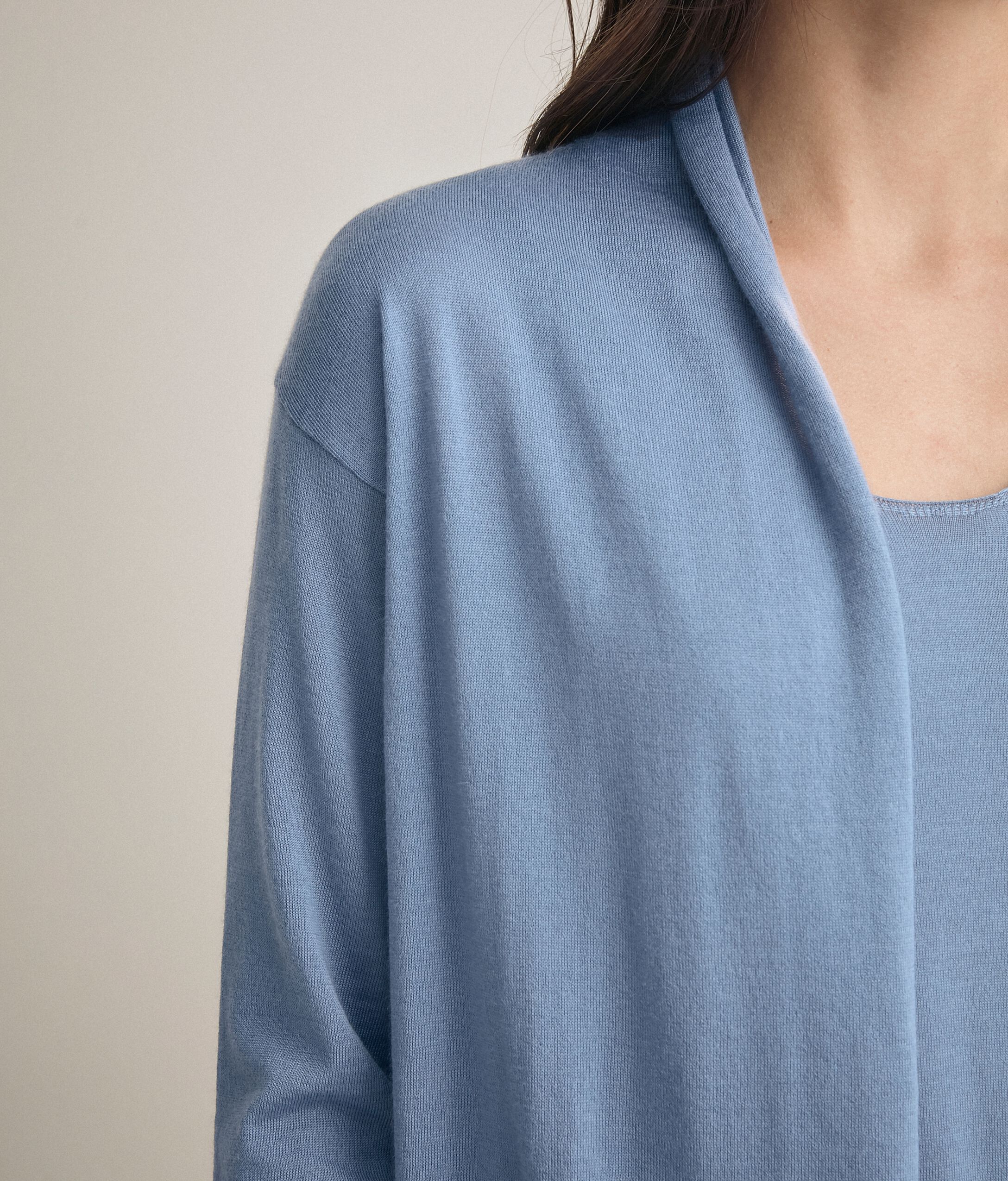 Long-sleeve long open cardigan in 100% Ultrafine Cashmere with a shawl-collar and seamless construction. The sleeves feature a tubular-design decoration and the back is gathered for a more comfortable fit. Please note that this item is fitted, we advise purchasing a larger size. Model is 179 cm and wears a size M Chest: 88 cm / Waist: 67 cm / Hips: 94 cm