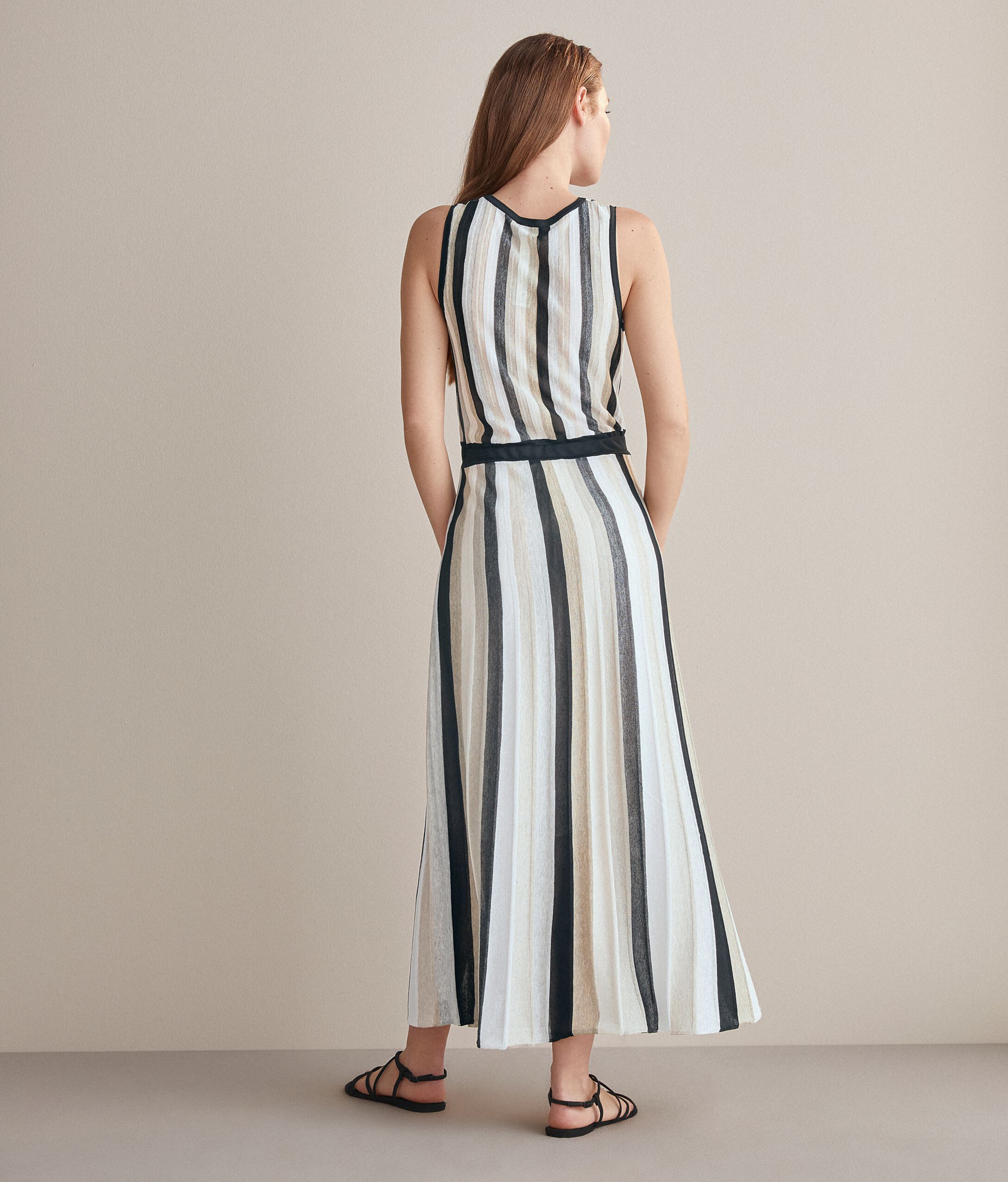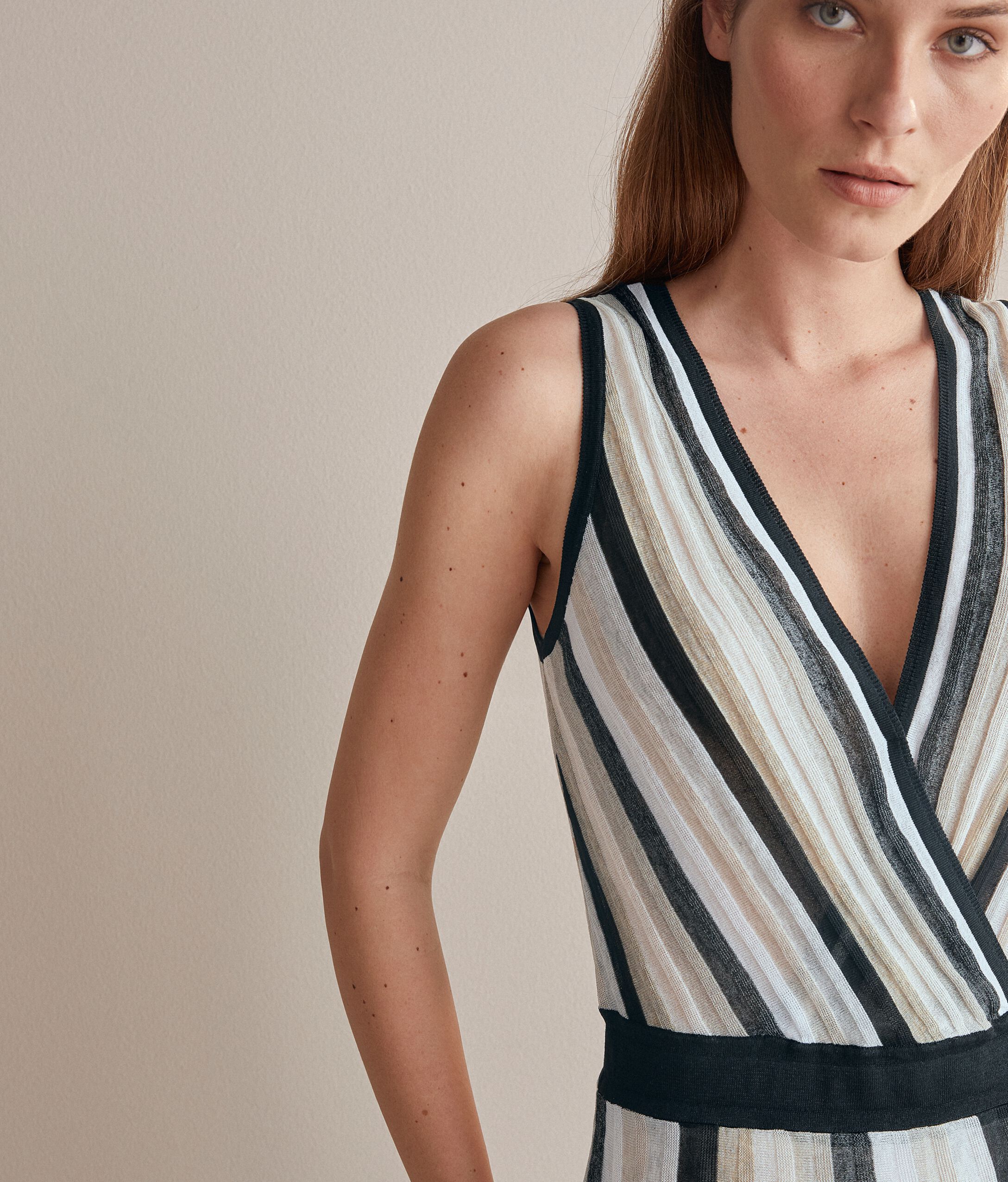 A romantic and feminine touch is combined with innovative materials, creating an elegant yet modern, Falconeri style. The shiny viscose thread alternates bright shades of colour and illuminates the stripes. The crossed bodice with its soft and shiny texture sweeps through the shape of this refined summer dress. The long, slightly flared skirt at the bottom creates a perfectly balanced circle movement. Regular fit. Ankle length.Model is 179 cm tall and wears a size M Chest: 88cm / Waist: 67cm / Hips: 94cm