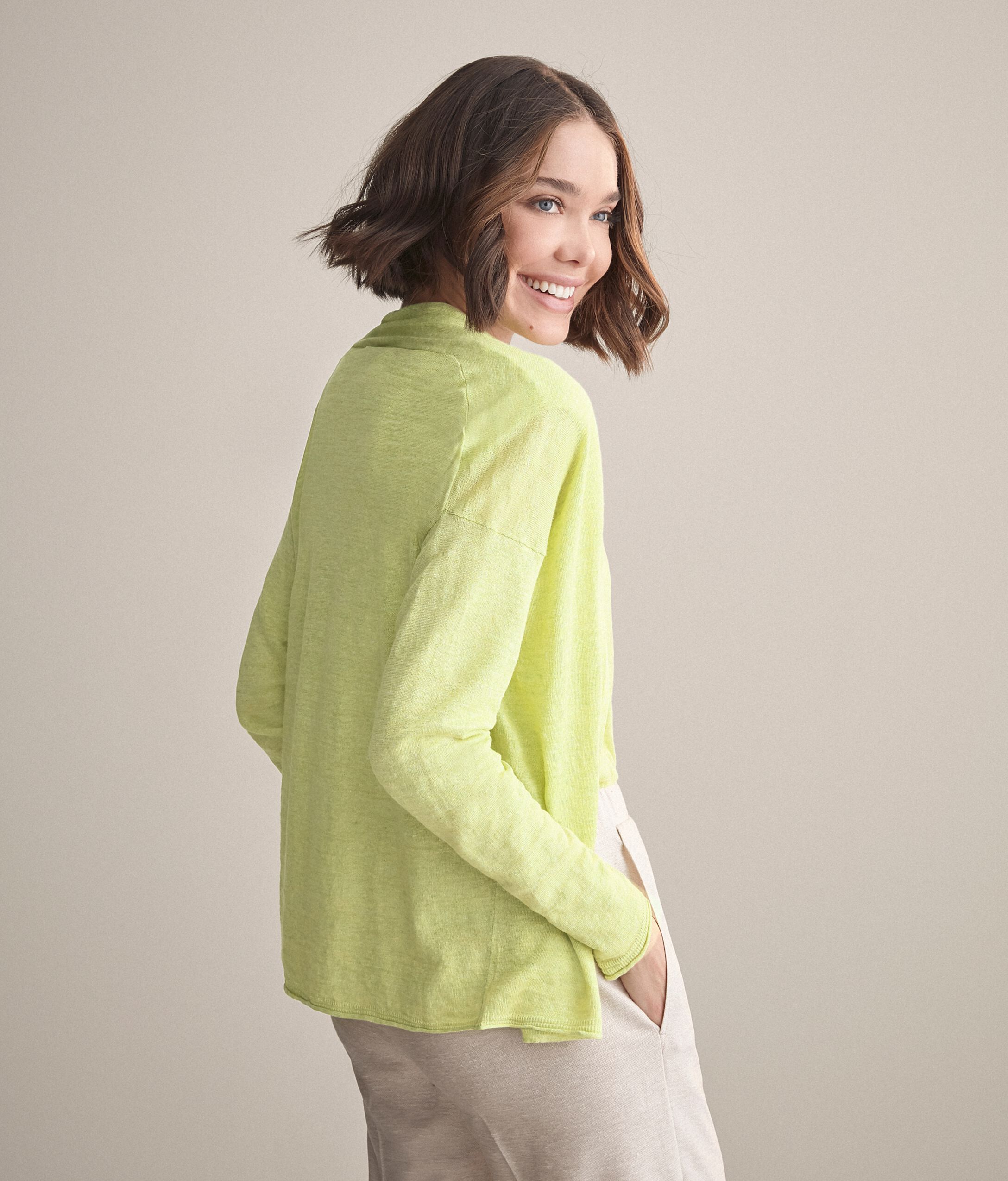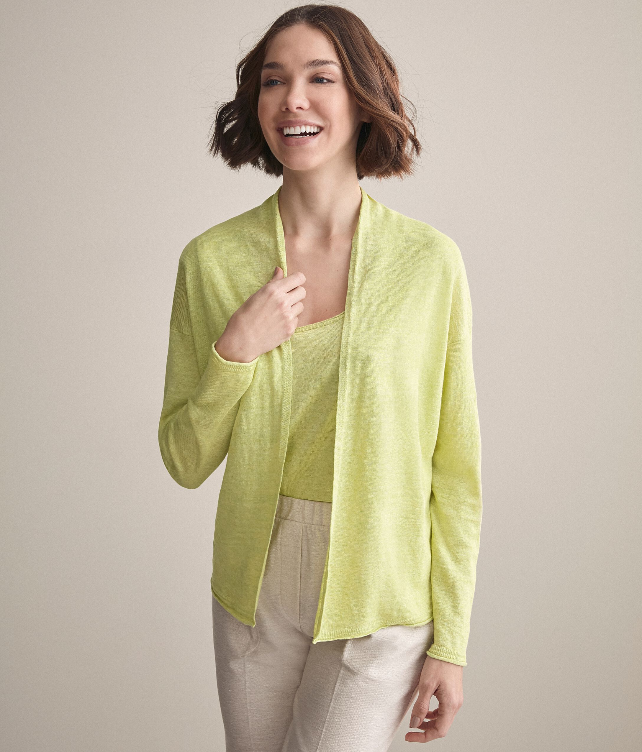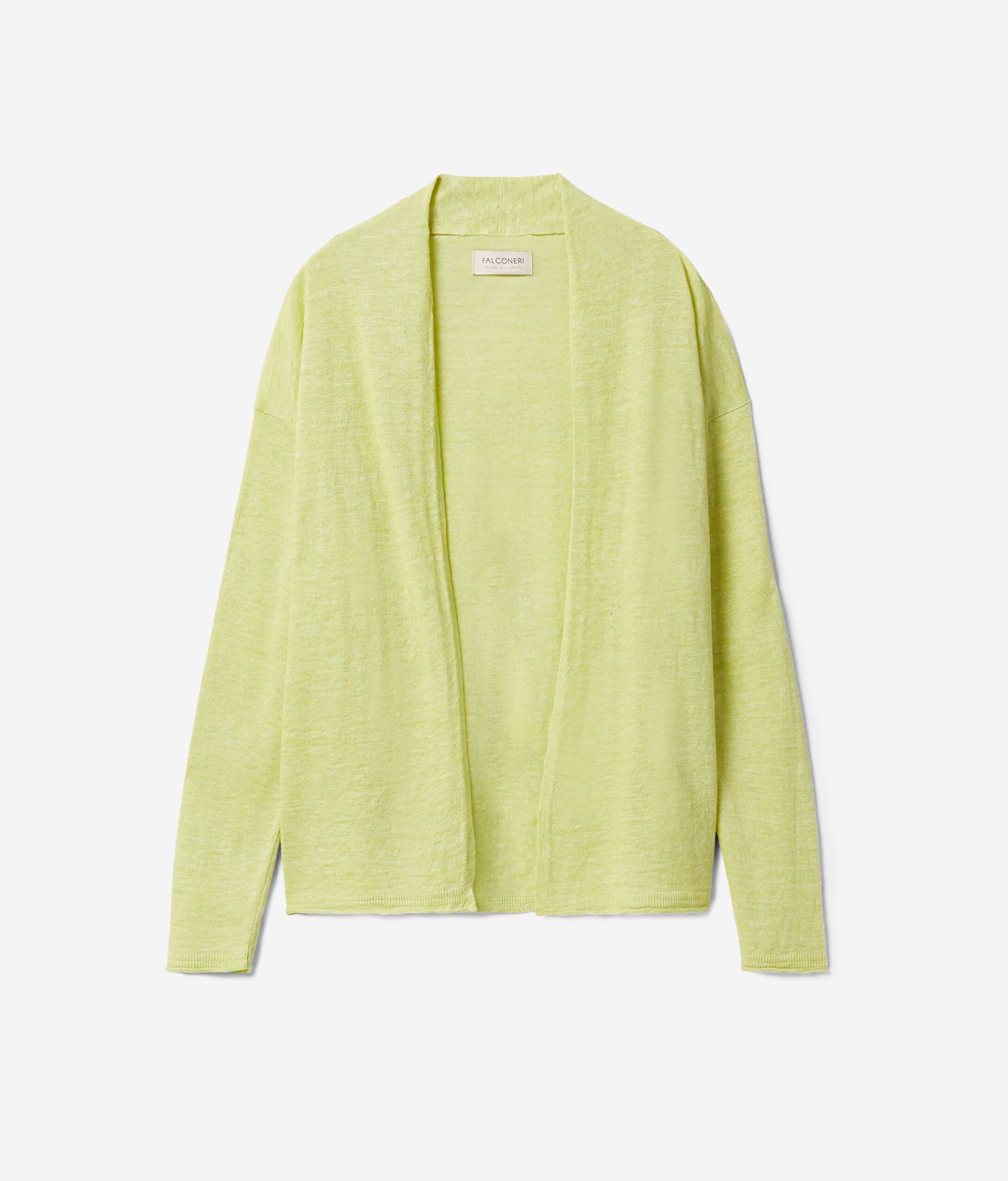 Simple lines and light, slightly rippled fabric make way for a new season with warmer temperatures and casual style. Linen and cotton create a fresh, light texture, which perfectly express the Falconeri style. Open front mini cardigan with shawl collar, without buttoning. The slight unevenness of the fabric adds uniqueness to the natural features of the material. Regular length. Short length.Model is 179 cm tall and wears a size M Chest: 88cm / Waist: 67cm / Hips: 94cm