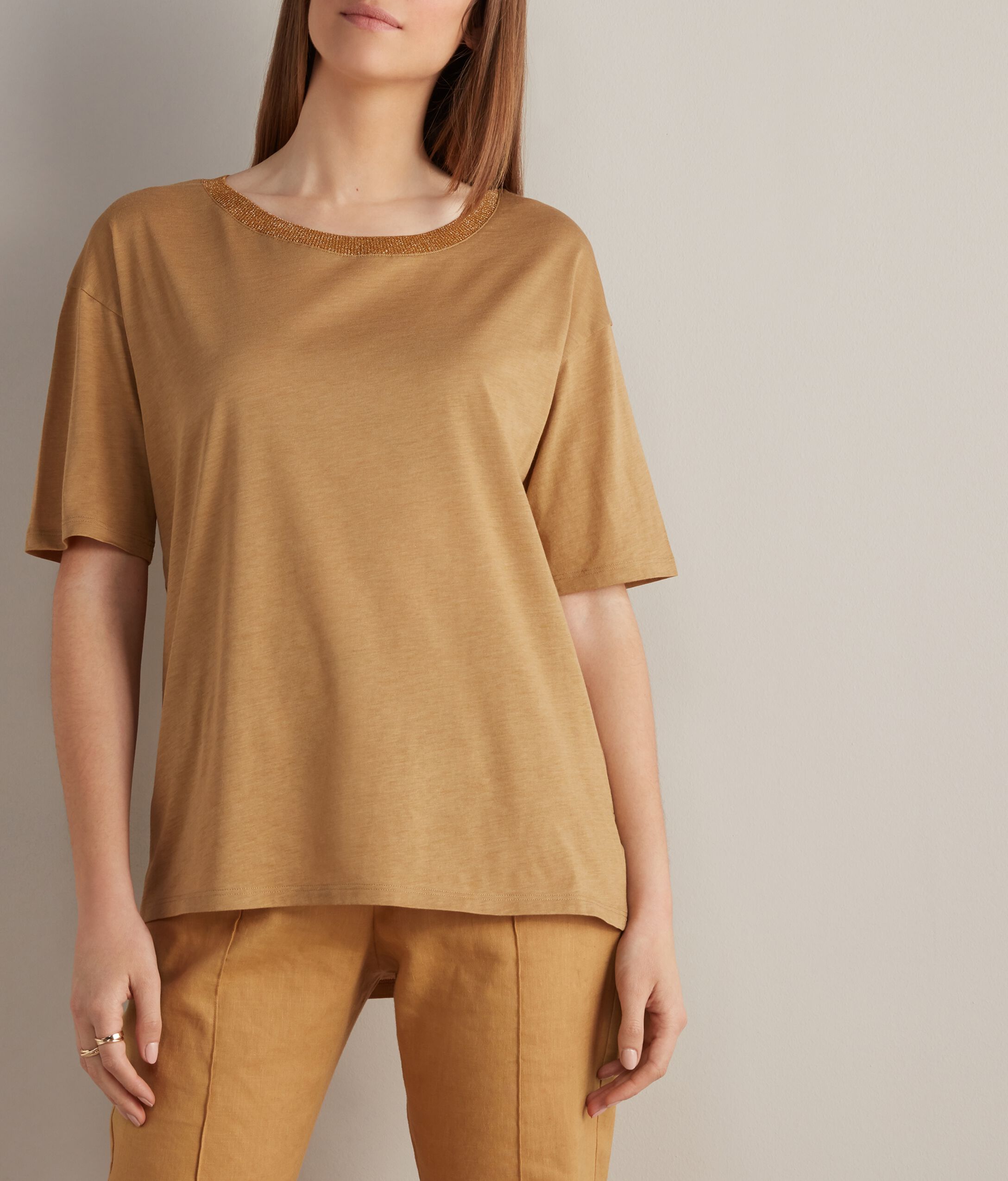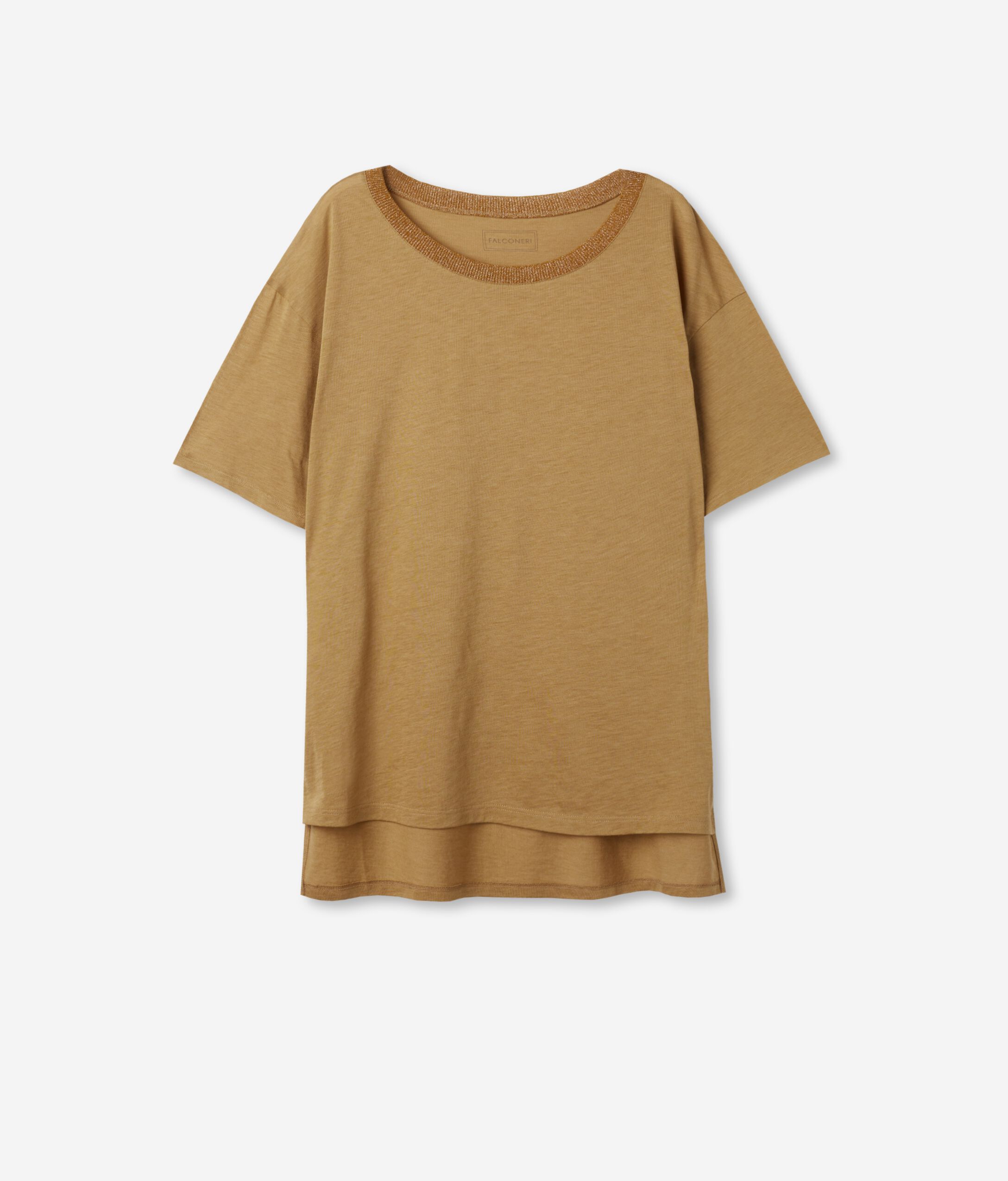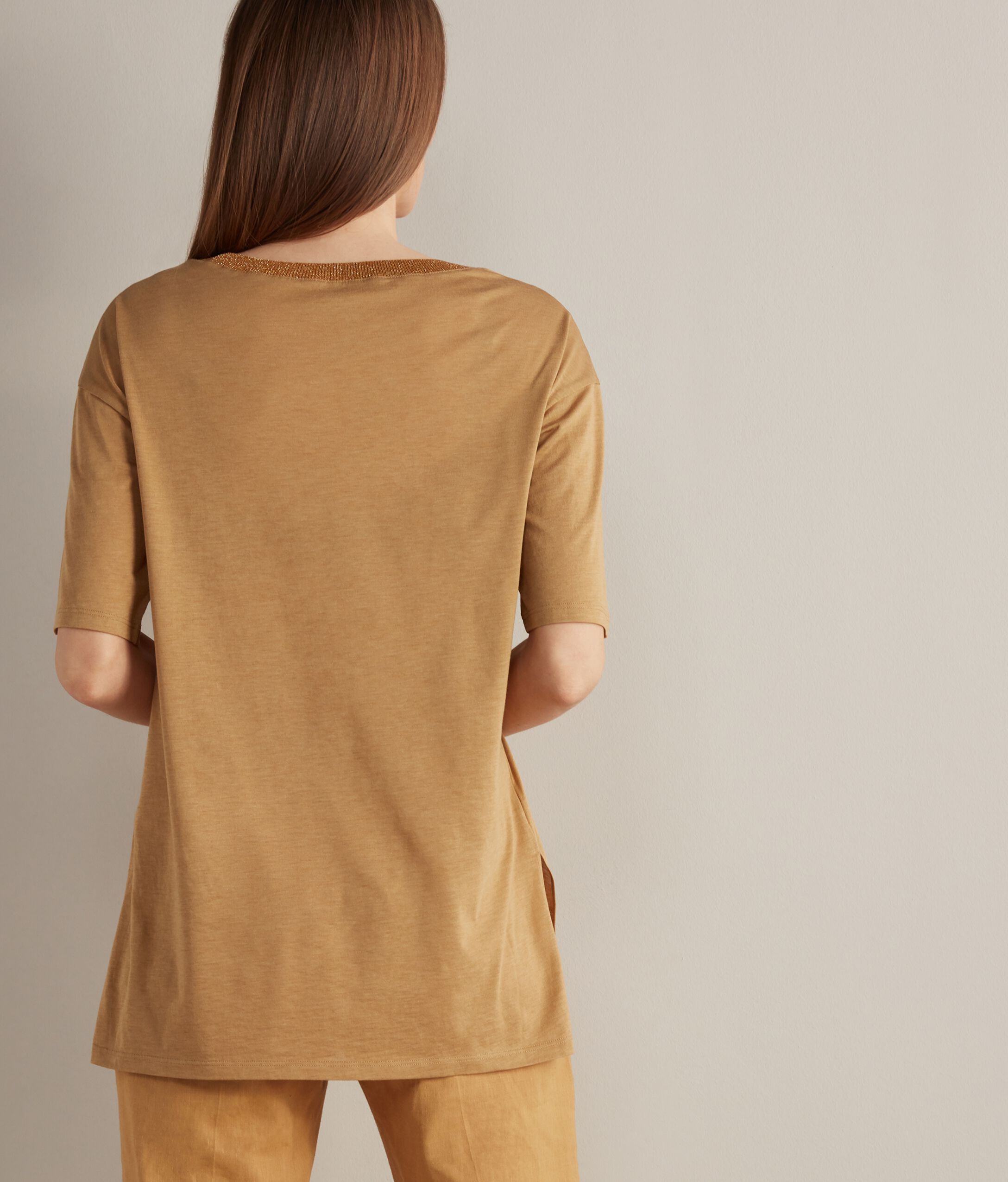 This V-neck t-shirt crafted in fresh silk jersey features a ribbed lamé knit trim on the neckline. Slightly dropped shoulders and side slits define the asymmetrical lengths on the front and back of the garment. Oversize fit and regular length.