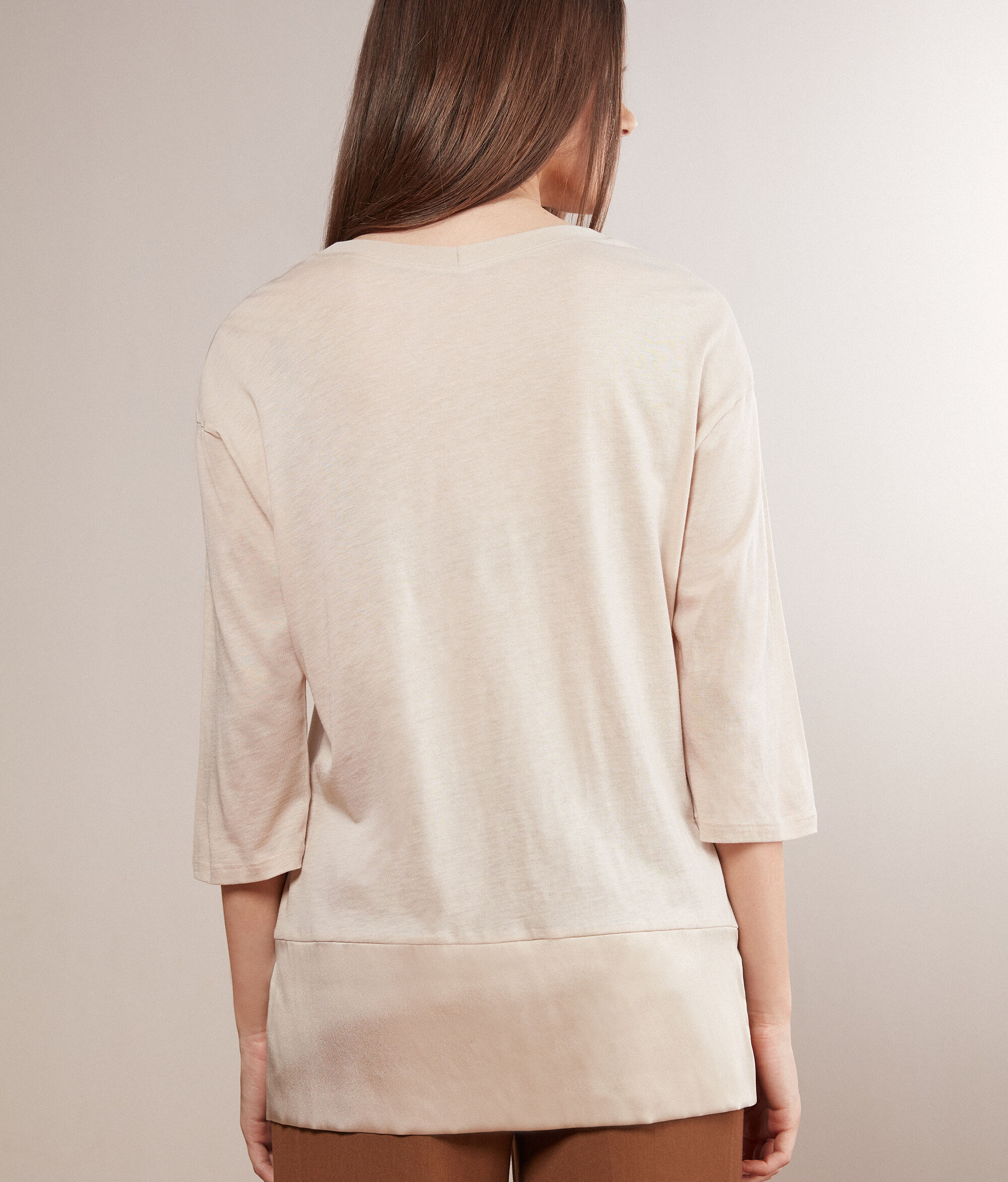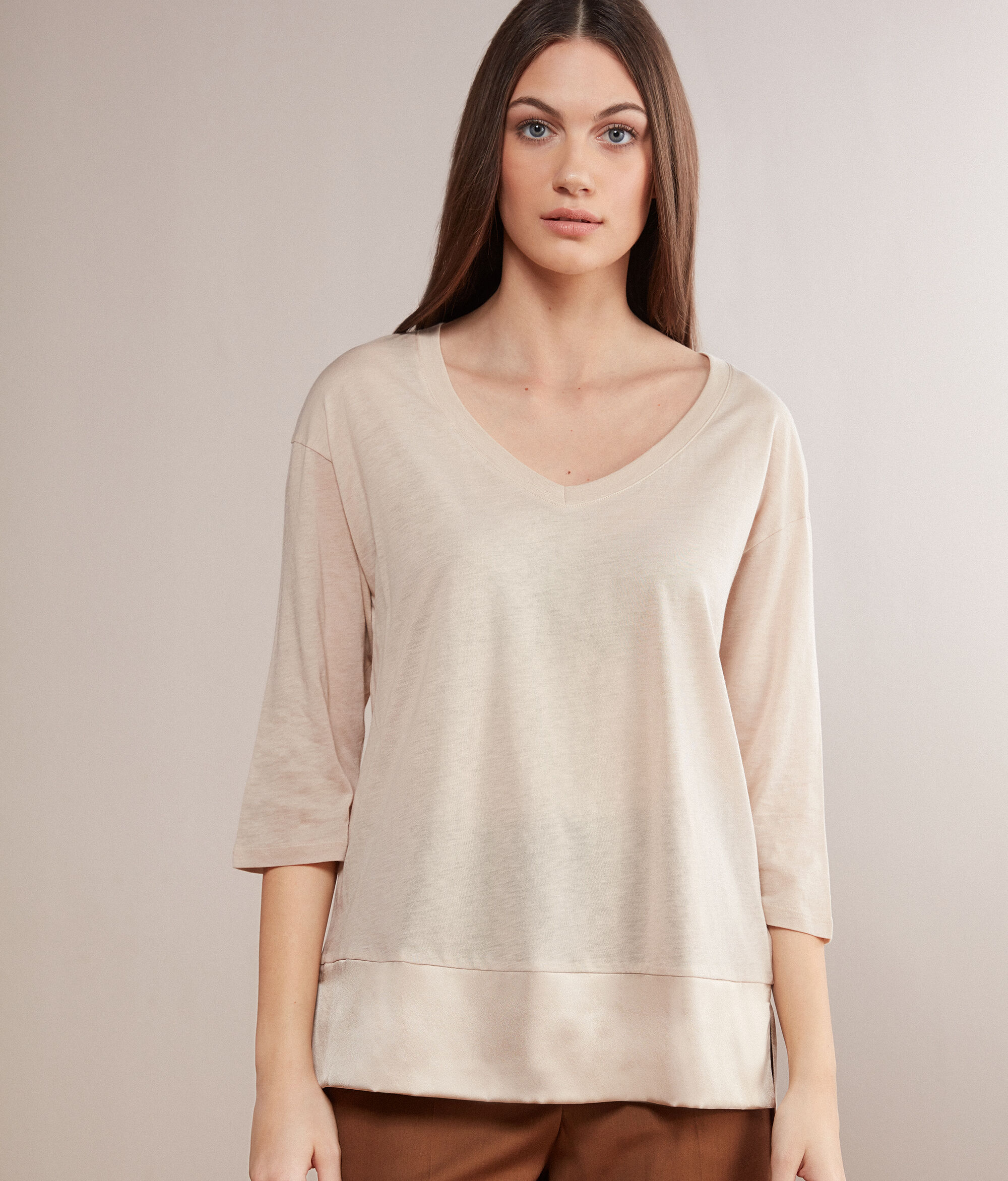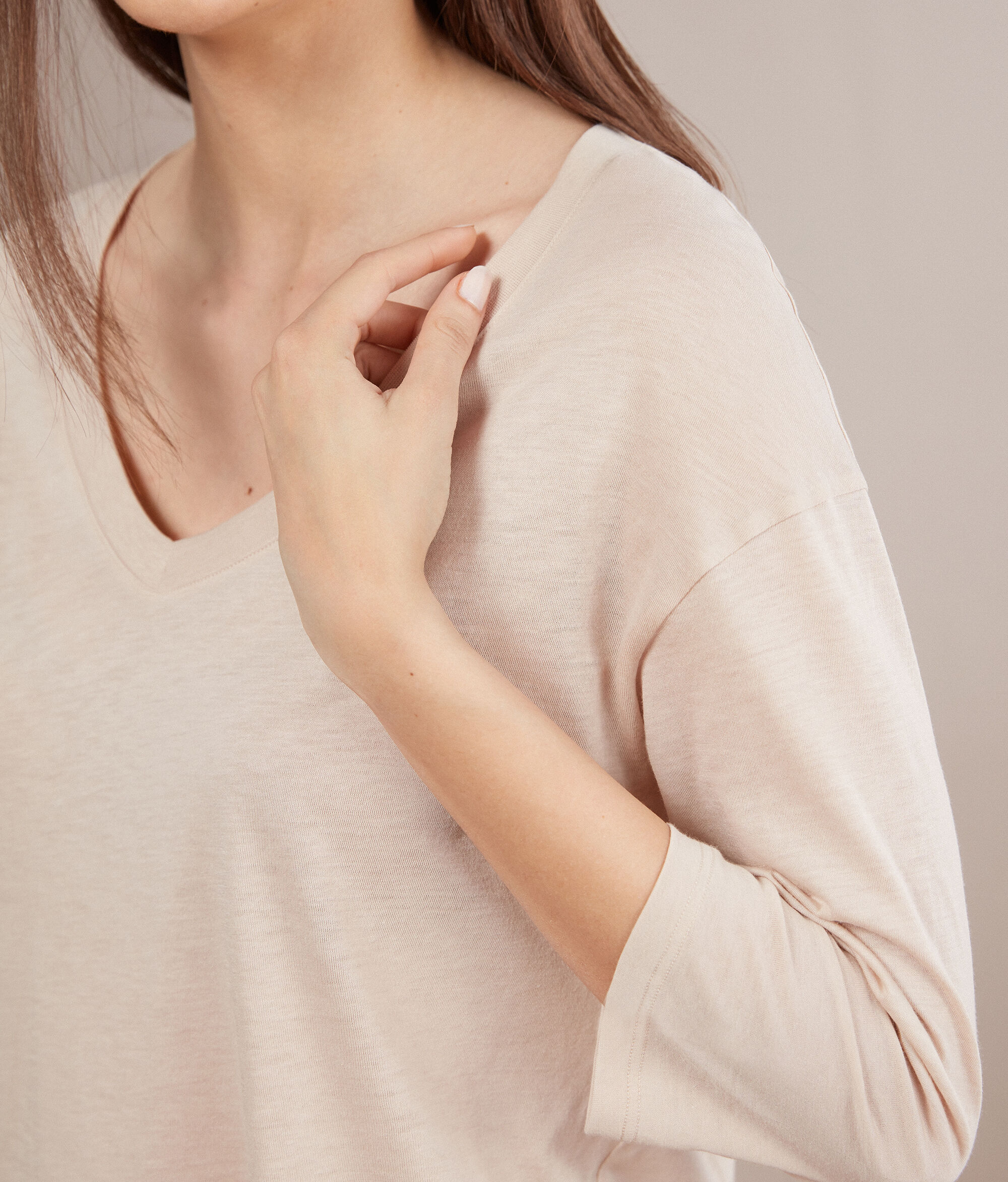 The pleasantly fresh and breathable texture which is at the same time both soft and brilliant elevates the essential, versatile style of this new v-neck t-shirt in fresh silk for a comfortable and refined look.