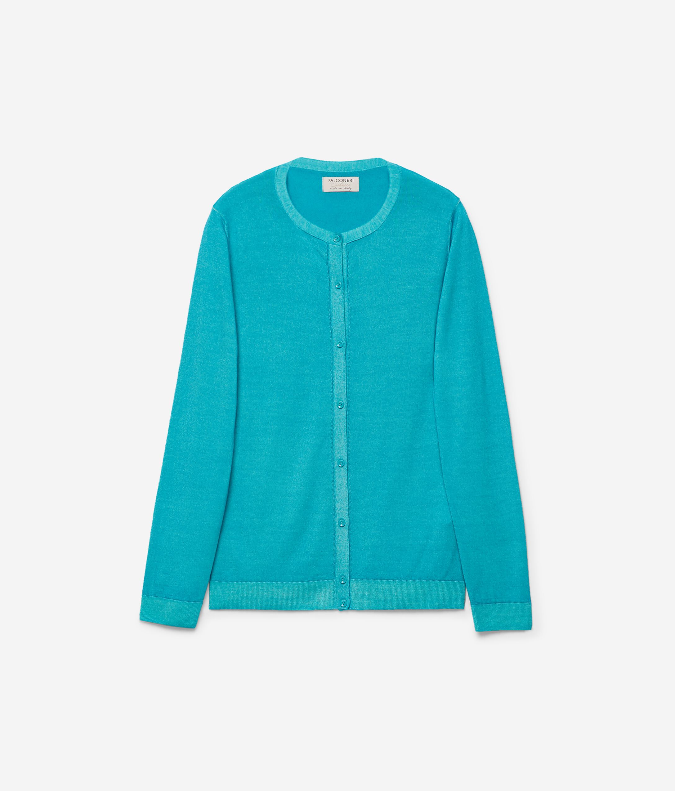 FALCONERI filati naturali. Crewneck cardigan in a 100% Ultrafine Cashmere jersey knit. Button-down front opening and slightly dropped shoulders. Perfect to wear as a twinset with our shell top DMC261C. Model is 179 cm and wears a size M Chest: 88 cm / Waist: 67 cm / Hips: 94 cm