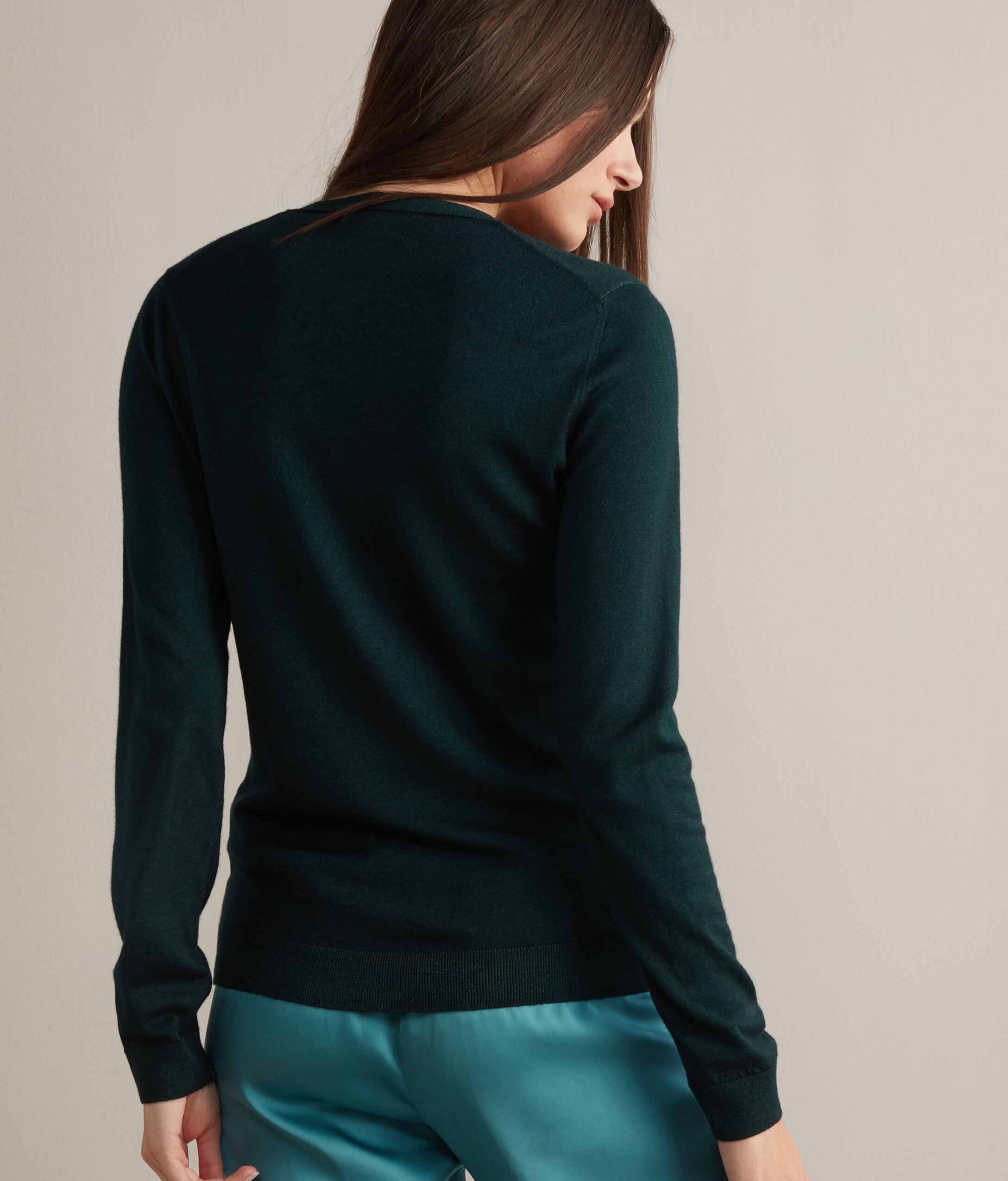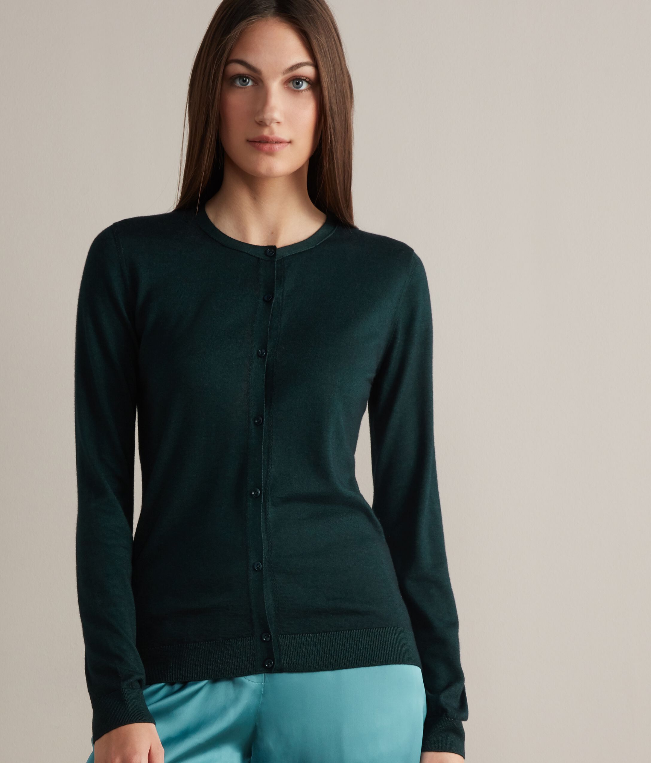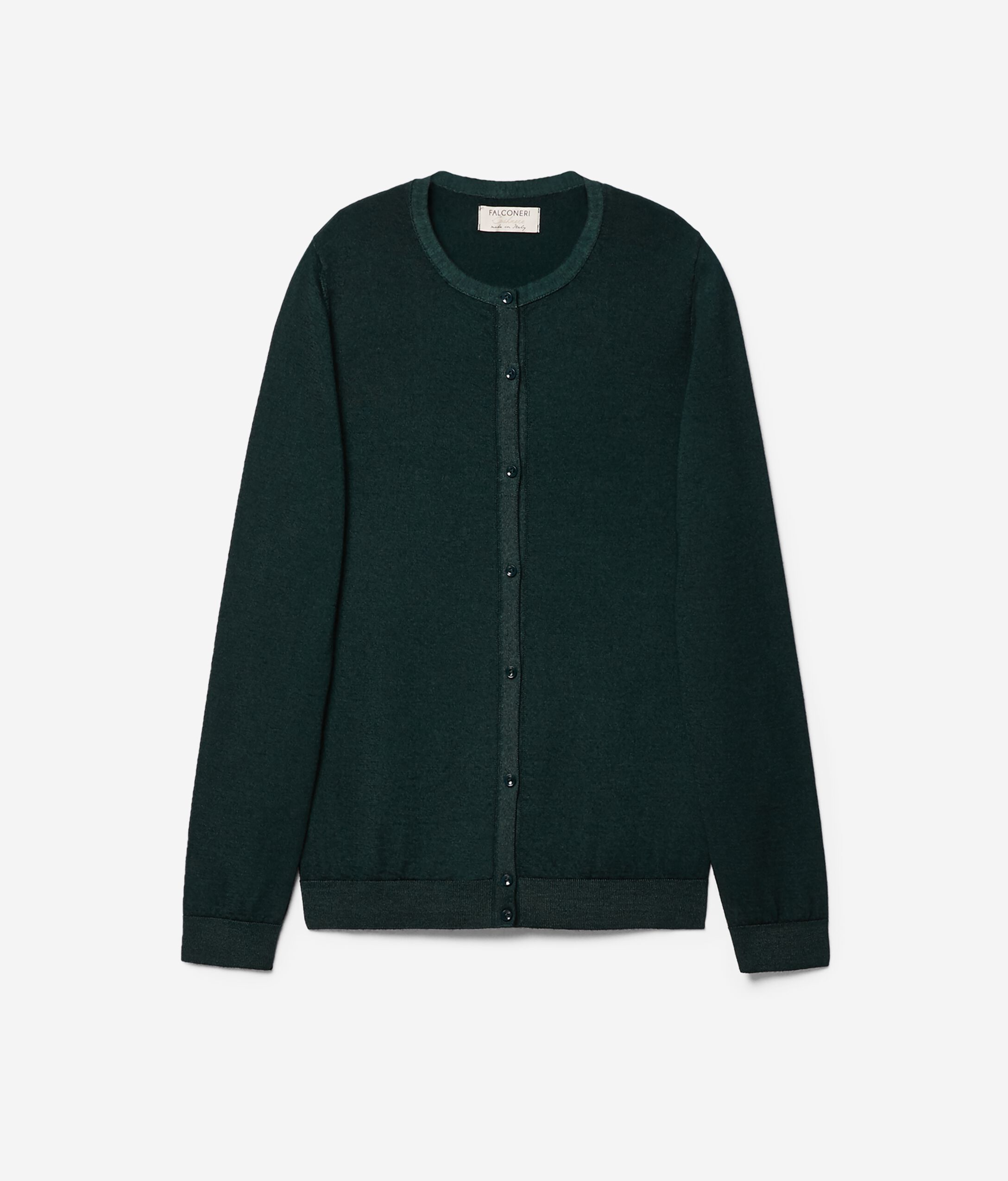 FALCONERI filati naturali. Crewneck cardigan in a 100% Ultrafine Cashmere jersey knit. Button-down front opening and slightly dropped shoulders. Perfect to wear as a twinset with our shell top DMC261C. Model is 179 cm and wears a size M Chest: 88 cm / Waist: 67 cm / Hips: 94 cm