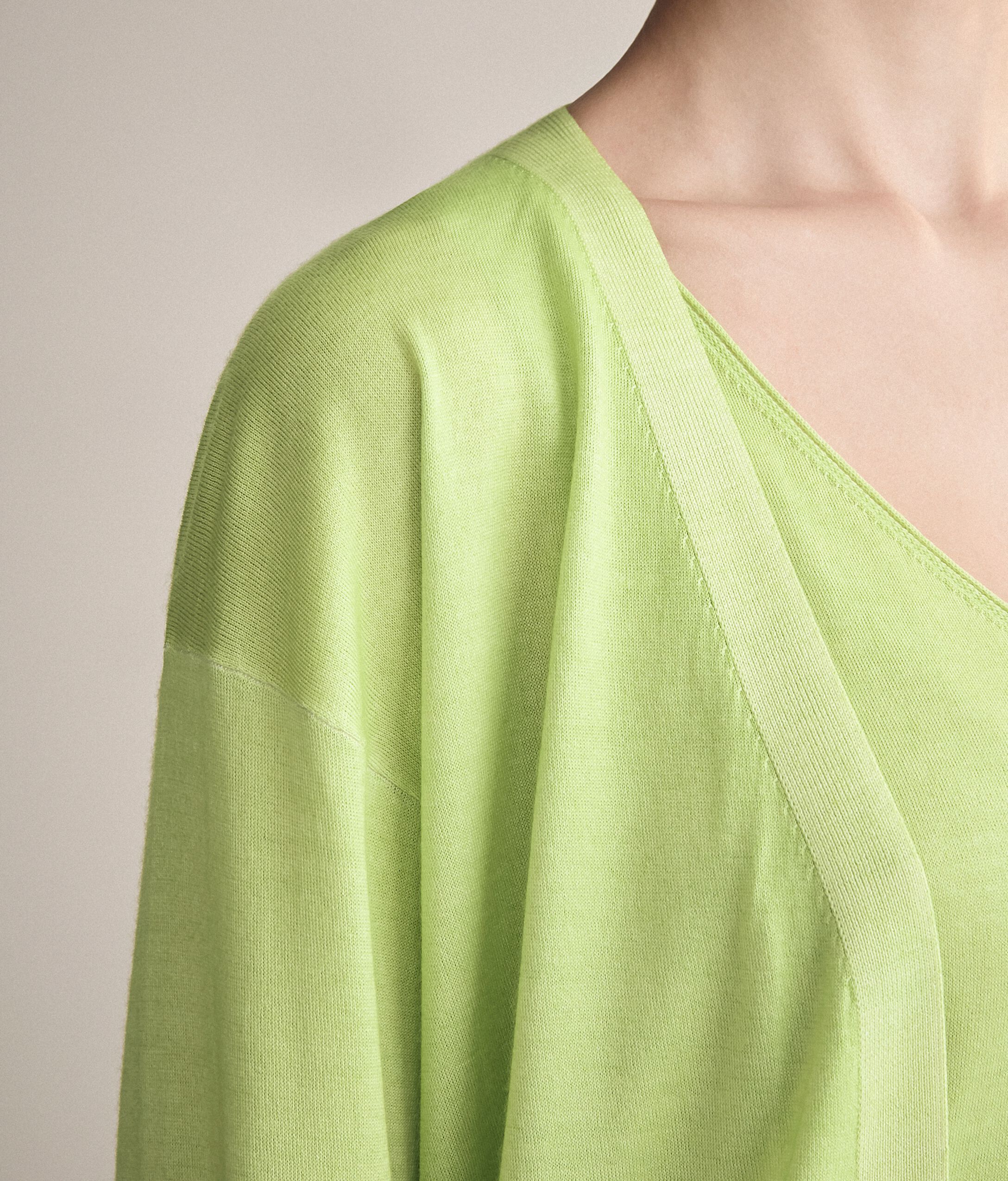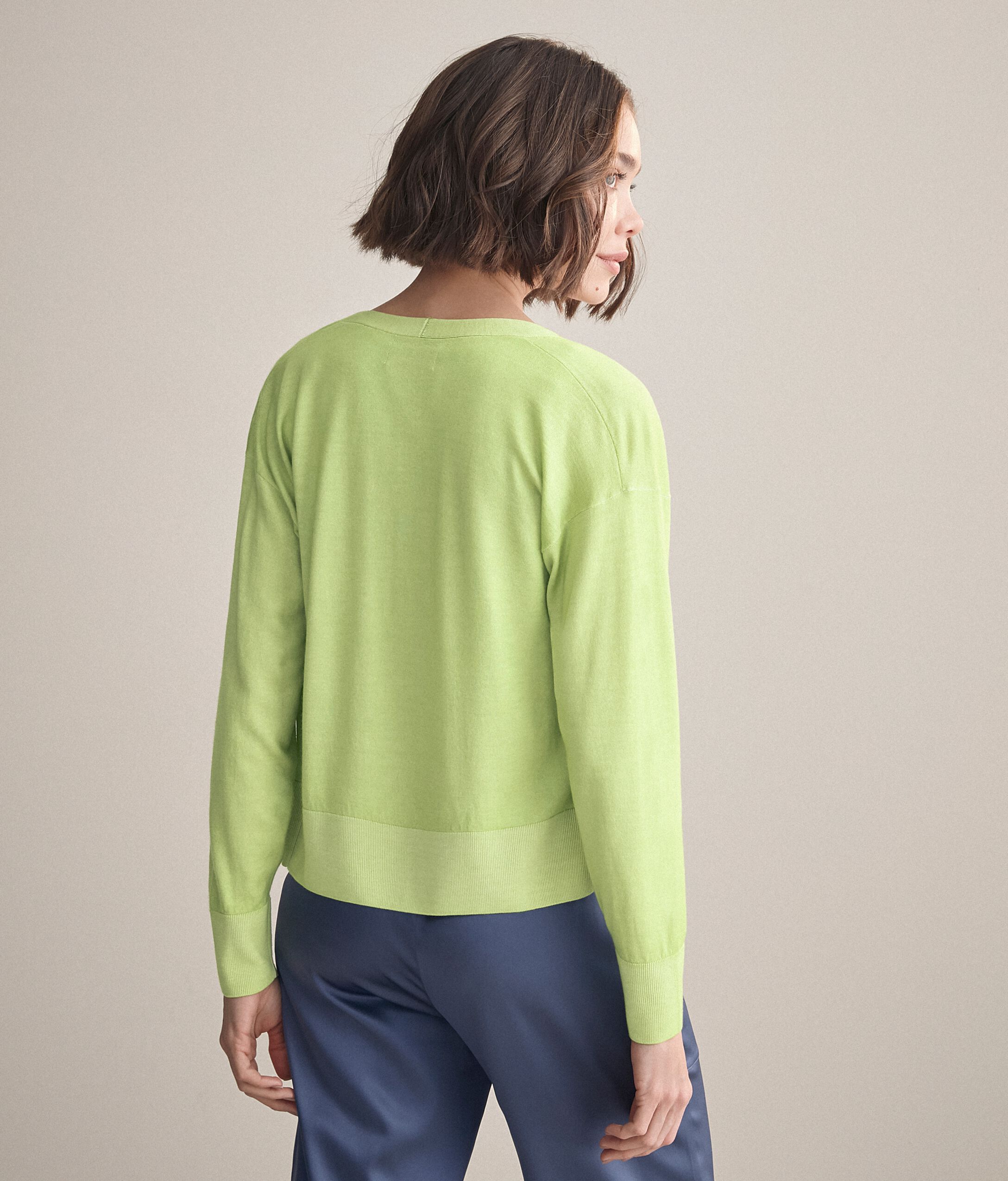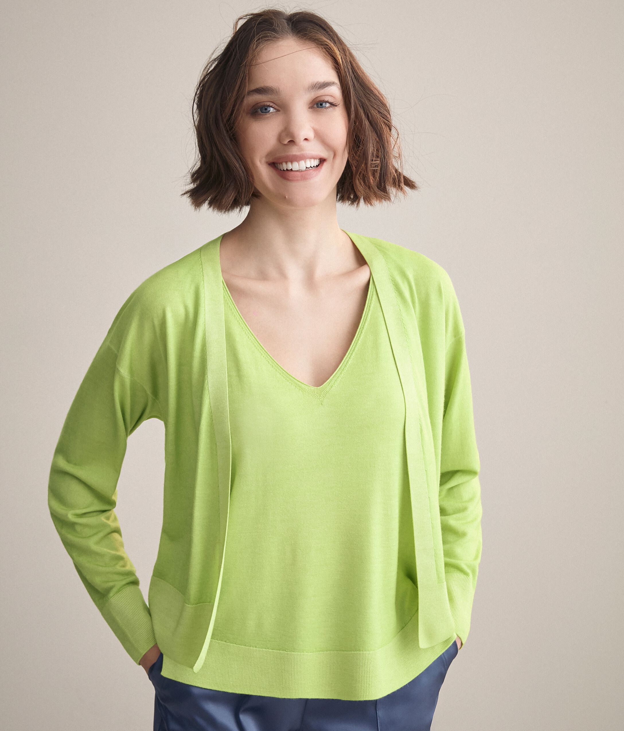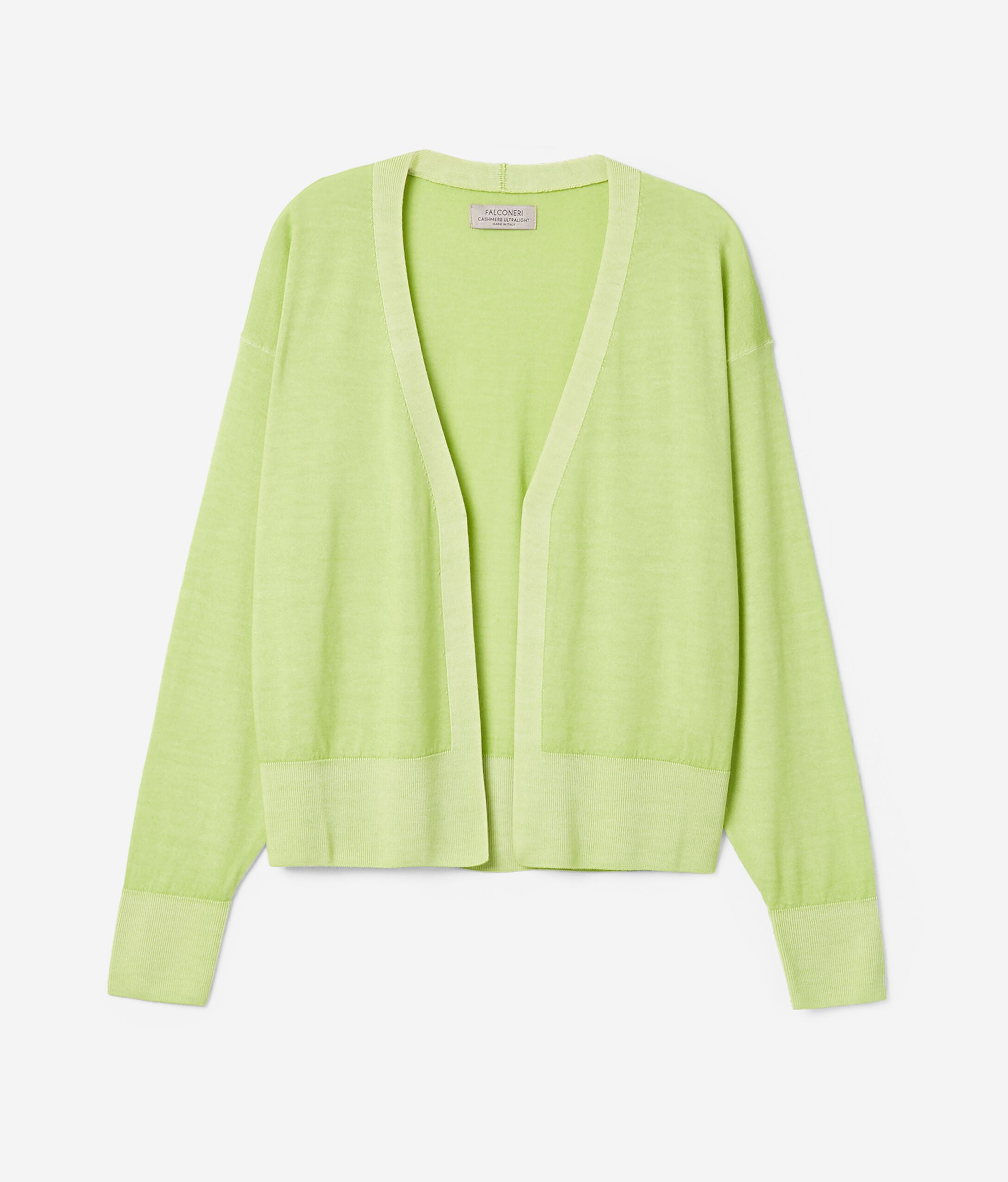 A sophisticated combination of the classic and the contemporary runs through the entire Falconeri collection. The choice of iconic yarns, such as the pure 50/2 cashmere, and balanced shapes and volumes perfectly demonstrates the brand's passion for fine materials and attention to detail. This cropped cardigan, which has no buttons, creates fluid, spontaneous lines and gives off a fresh, dynamic feel. The hem features high ribbing, the sleeves drape softly, and the shoulders are slightly dropped. Perfect with the DMC250B top.Chest: 88cm / Waist: 67cm / Hips: 94cm